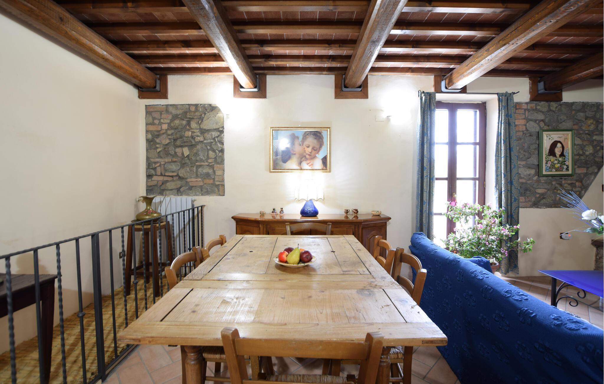 Denna inbjudande semesterlägenhet välkomnar dig med en varm atmosfär med naturstensväggar, takbjälkar i trä och vackra detaljer. Laga mat i köket med öppen planlösning och njut av dina måltider vid det stora träbordet. Mys upp i de bekväma sofforna framför den öppna spisen eller tillbringa sällskapliga kvällar med spel och goda samtal.