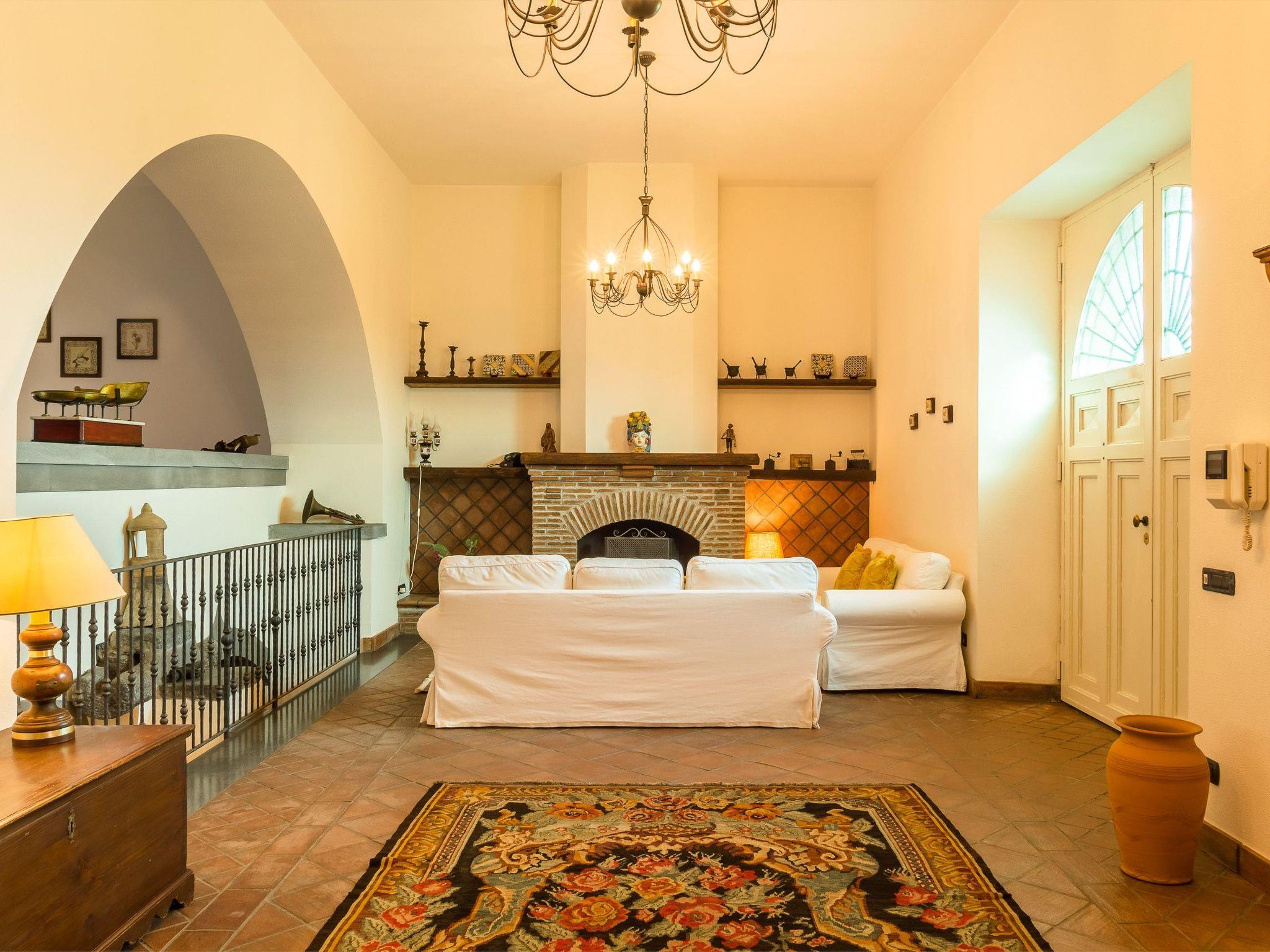 From the living room you have access to the paved and furnished outdoor areas, which continue with a wonderful lawn and solarium by the large masonry swimming pool.