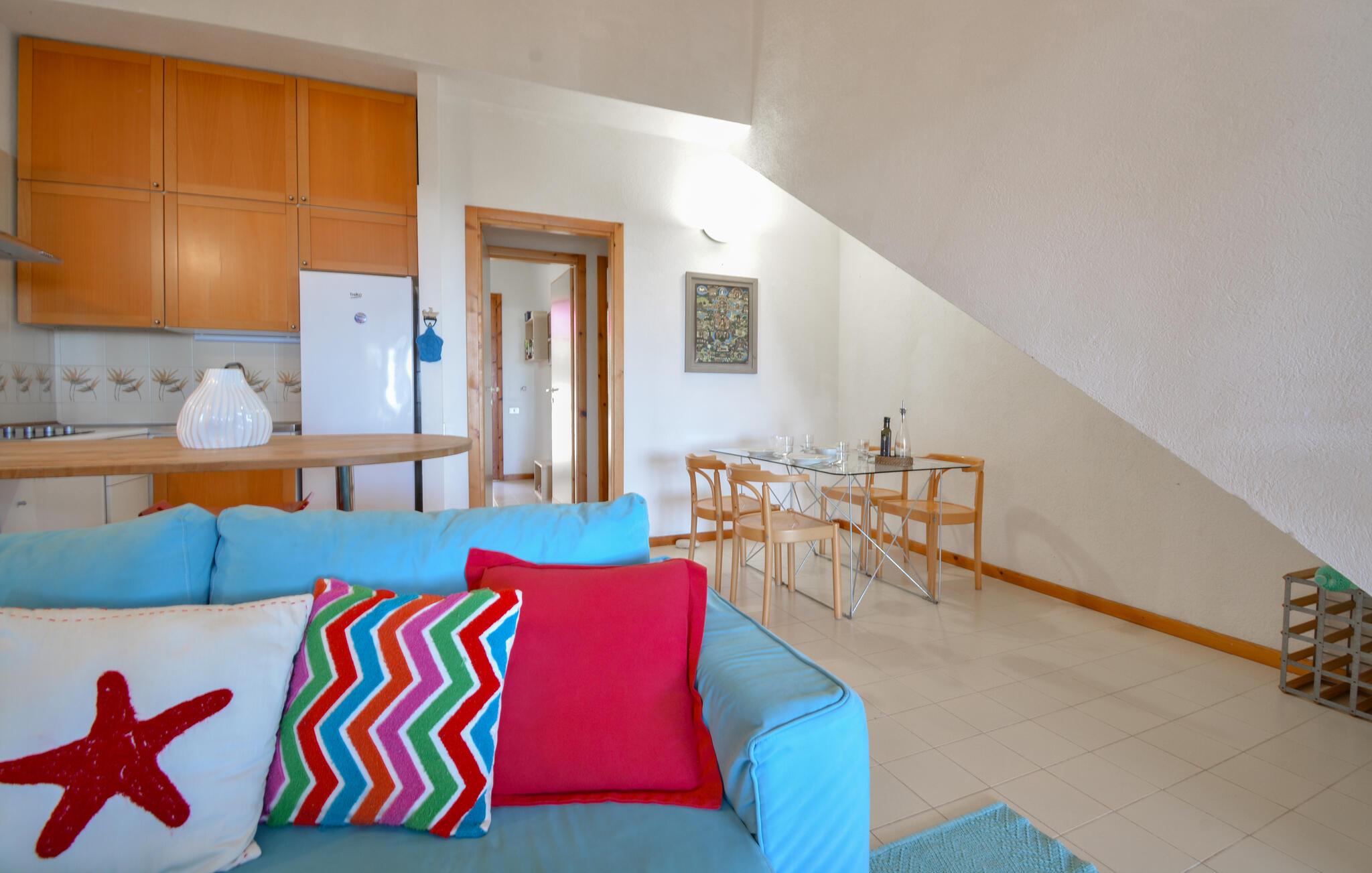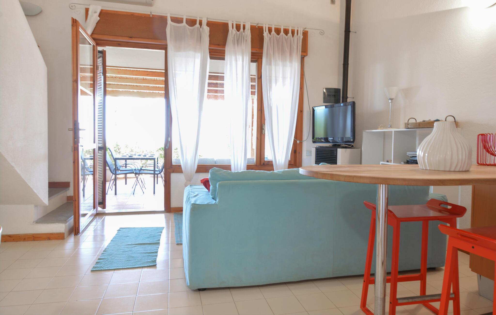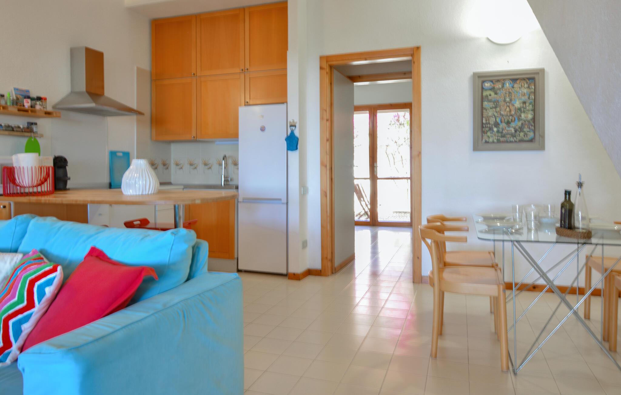 Välkommen till Is Molas och till ditt vackert designade semesterboende. Det rymliga utomhusområdet med bekväma sittplatser och ett stort matbord inbjuder dig att njuta av avslappnade måltider utomhus. Njut av den hisnande utsikten över den omgivande landsbygden och havet i horisonten medan du njuter av ditt morgonkaffe eller ett glas Cannonau di Sardegna på kvällen på den täckta terrassen.