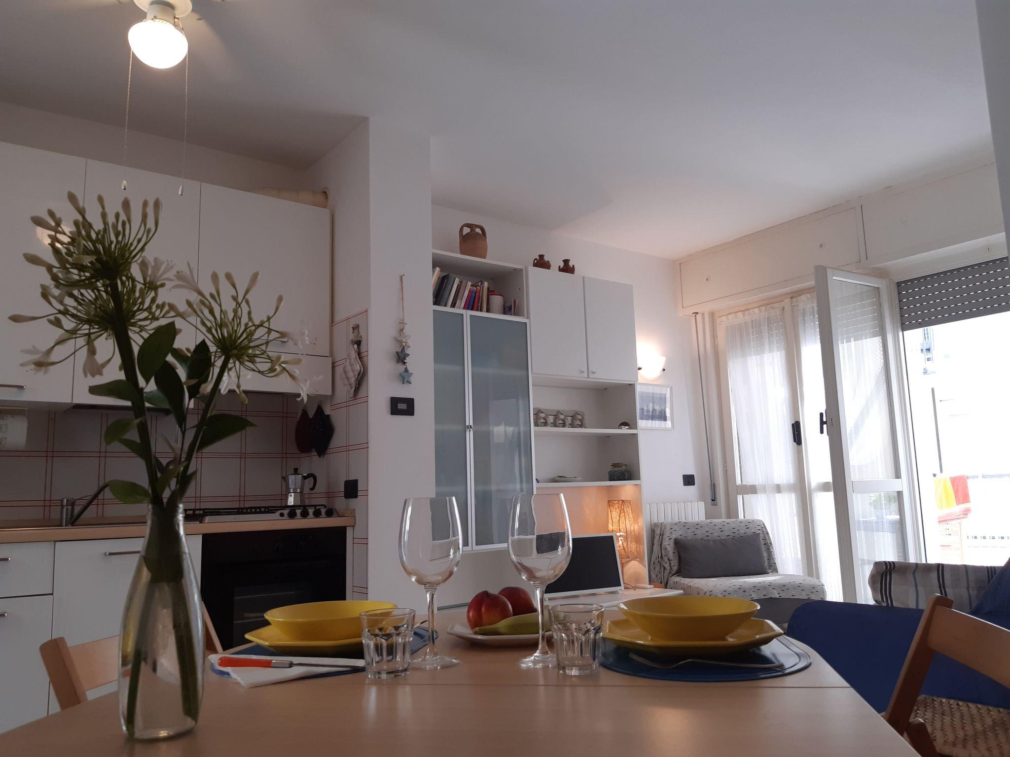 La Terrazza tra il Mare e gli Ulivi is a bright and spacious studio apartment with a fantastic sea view terrace. The flat is located on the top floor of a five-storey building with lift. The apartment consists of a living room with a double sofa bed, a kitchenette and a sleeping area with a double bed, a bathroom and a balcony with a spiral staircase leading to a beautiful furnished terrace with a sea view. La Terrazza tra il Mare e gli Ulivi is equipped with every comfort, air conditioning, Wifi and is ideally located a few steps from the beach and the centre of Lavagna. Lavagna is a town in the Gulf of Tigullio, which over time has grown from a small village to a very important and well-known seaside and tourist resort, while maintaining its characteristic Ligurian structure, with its narrow streets full of shops and workshops. The wide beach, about 4 kilometres long, allows easy access to the sea thanks to the low shoreline and the sea is crystal clear: these qualities make it an ideal summer destination for families with children. The town also has one of the largest marinas in the Mediterranean.