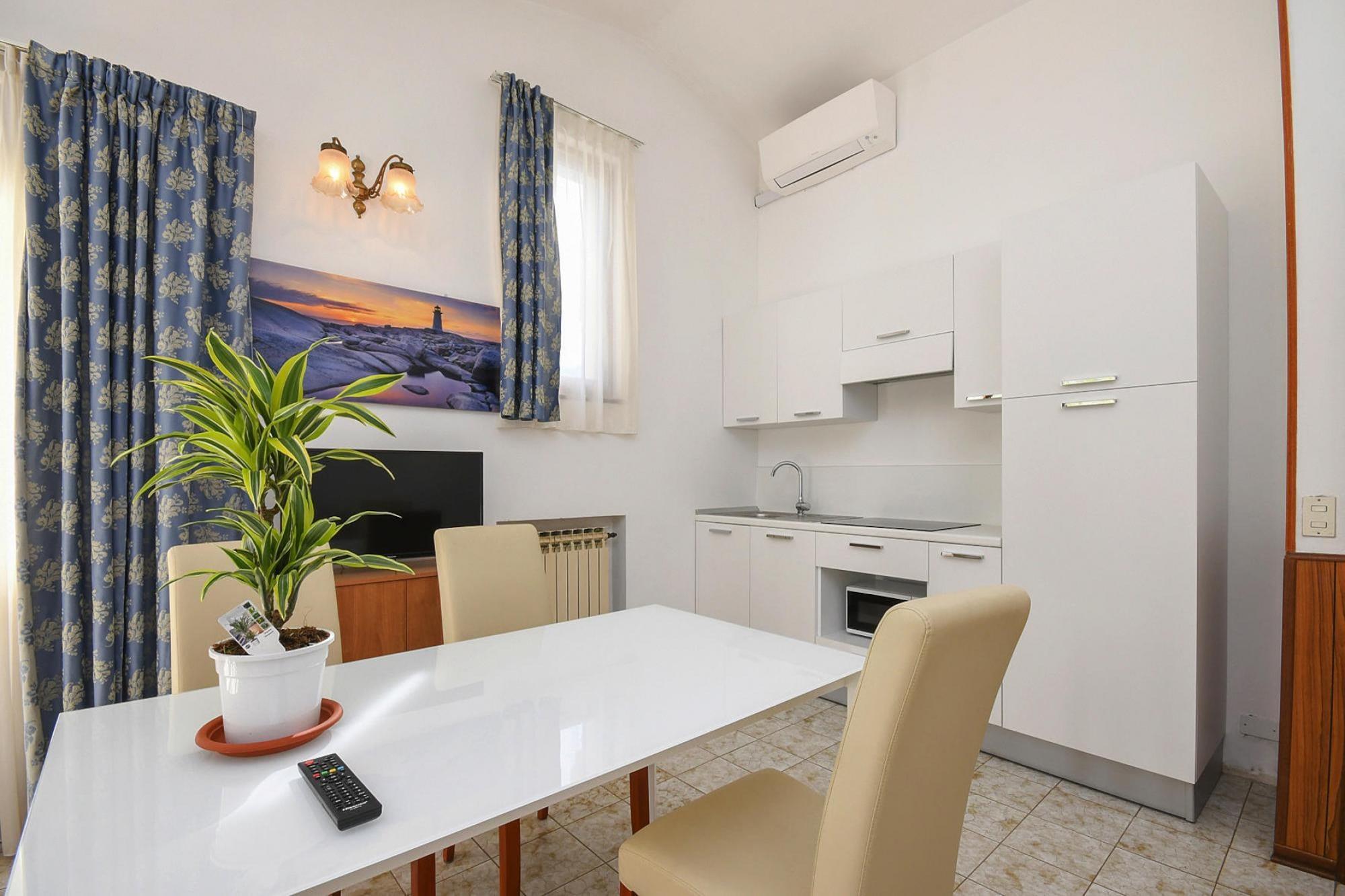 Öppet kök(Kokplattor(Spis med 2 kokplattor, elektrisk), kaffebryggare, mikrovågsugn, kylskåp(+ frys)), ardags- och matrum(bäddsoffa, TV(satellit)), sovrum(dubbelsäng), sovrum(2x enkelsäng), badrum(dusch, toalett ), WC, Brödleverans, För barnen, Bordtennis, Snackbar, bar, balkong eller terrass, värme, luftkonditionering, trädgårdsmöbler, solstole, solstole, parkering, swimmingpool(delas med andra gäster , utanför, 9 x 4 m., opened from 1/2 Mar upto and including Oct), Solskydd, Solskydd, baby crib(free)