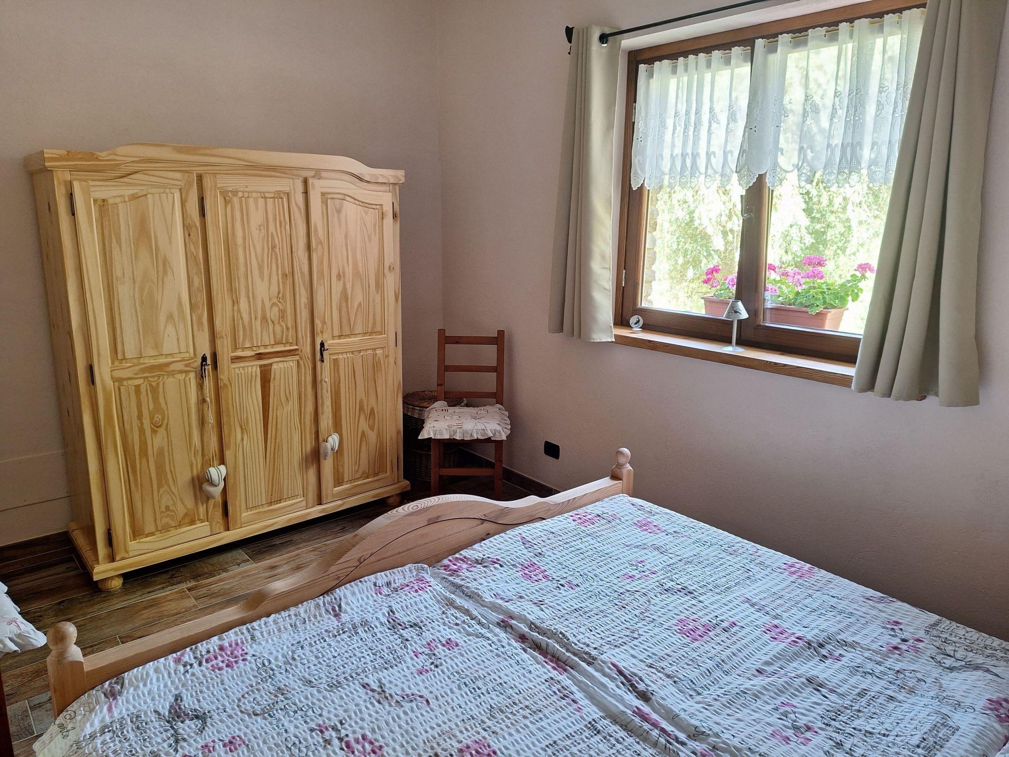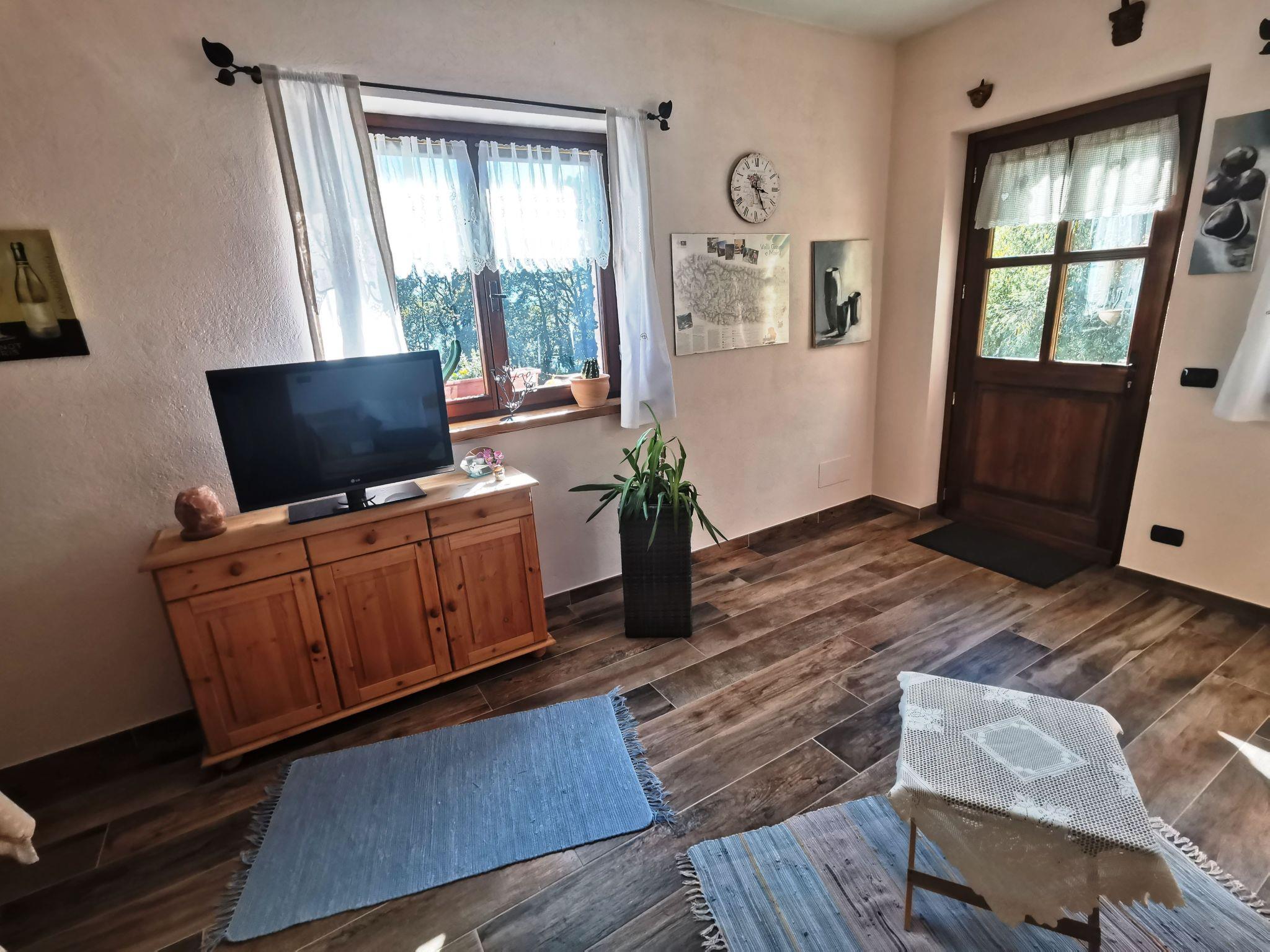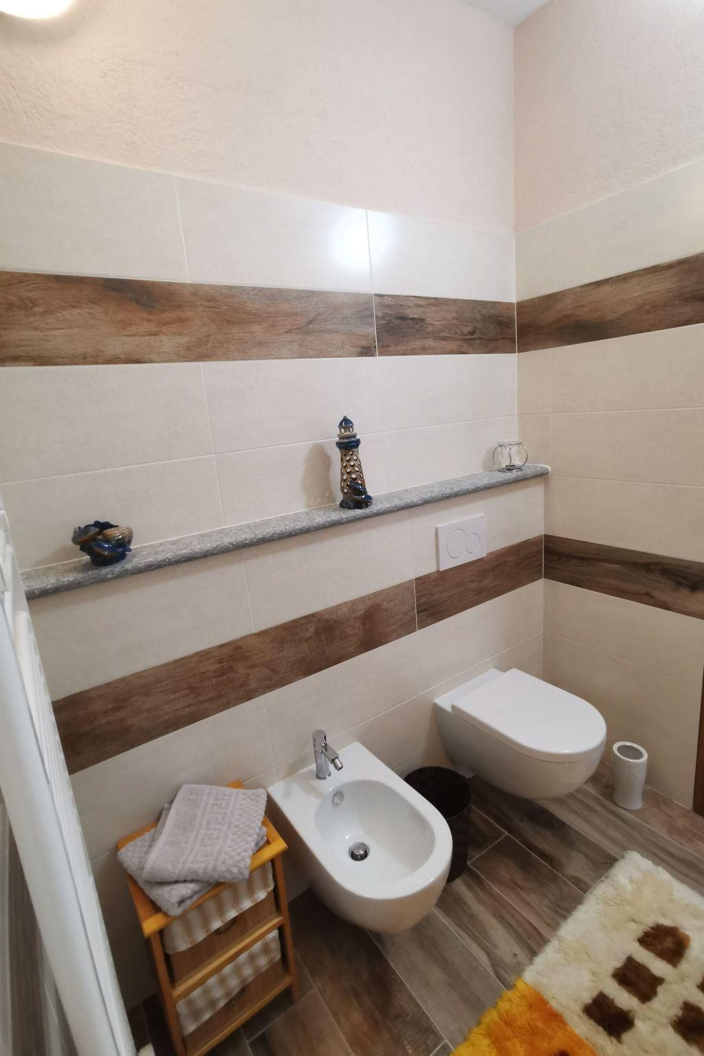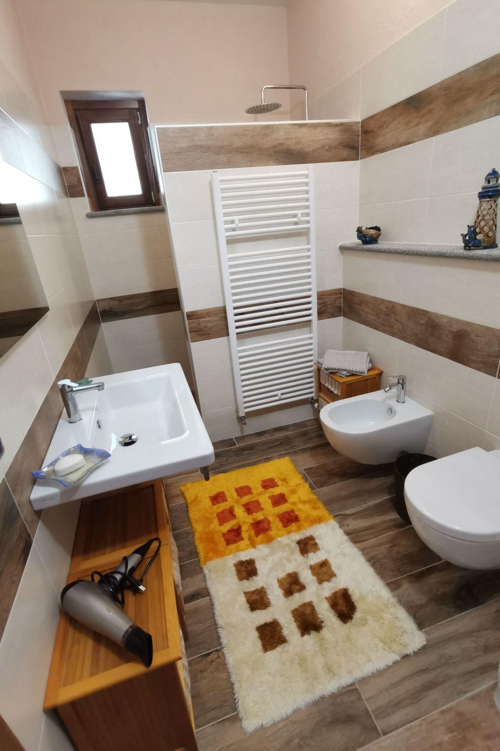 The apartment has a large living room with integrated fully equipped kitchen (extractor fan, induction hob, oven, fridge with freezer compartment, espresso machine, etc.). In the living room there is a TV/radio with German and Italian channels and a sofa bed for two people for our guests. A hallway with wardrobe leads to the bathroom with WC, bidet, washbasin and a large walk-in shower. Next door is the bedroom with wardrobe and a double bed for two people, a cot can be added if required. Our house is heated by an environmentally friendly pellet/solar heating system. There is underfloor heating throughout the flat and German electrical sockets are also available.