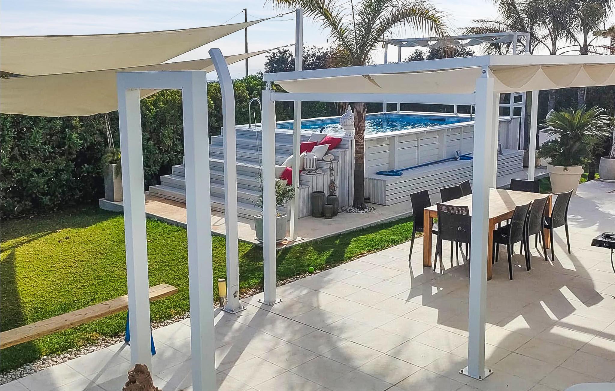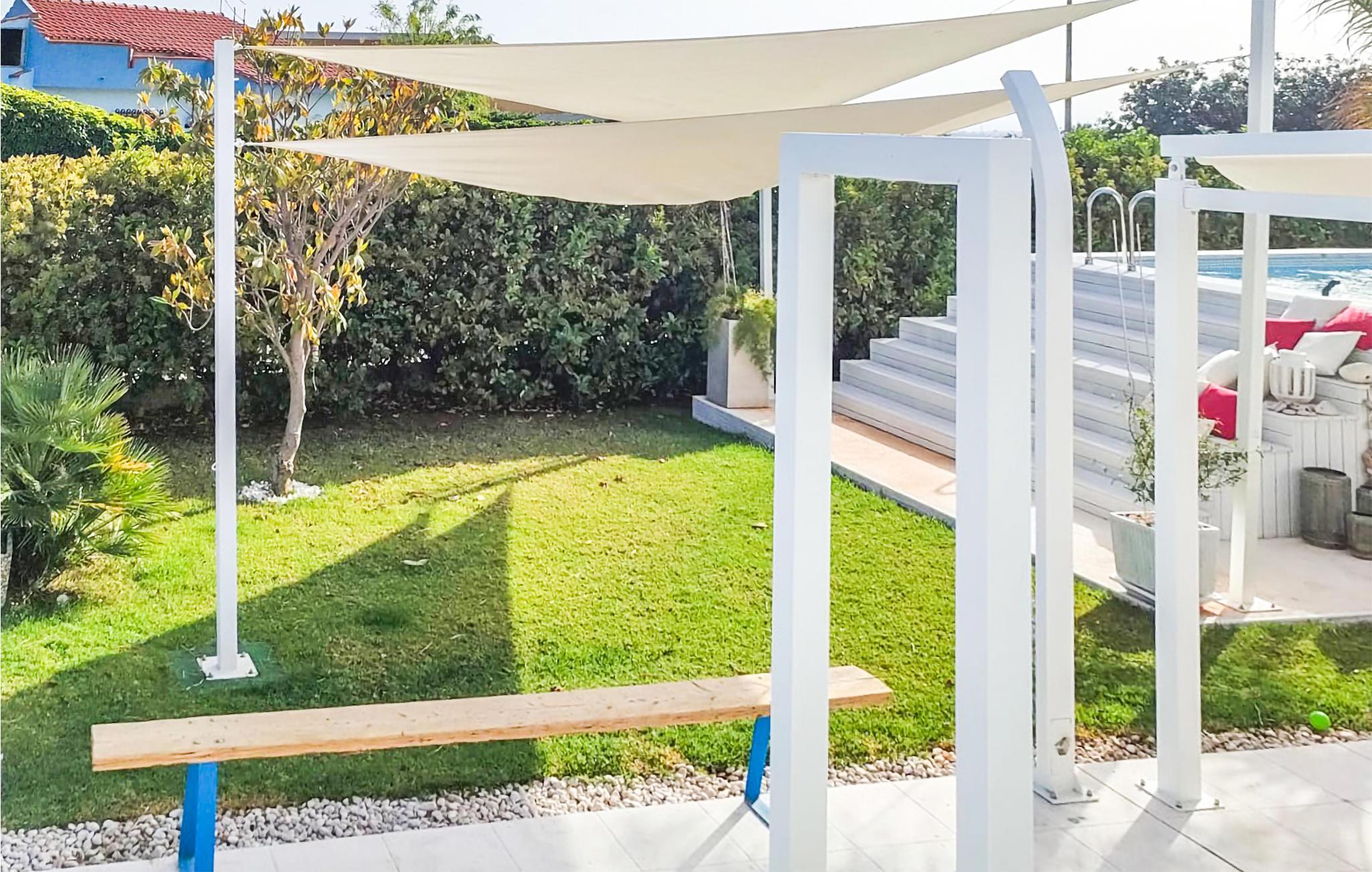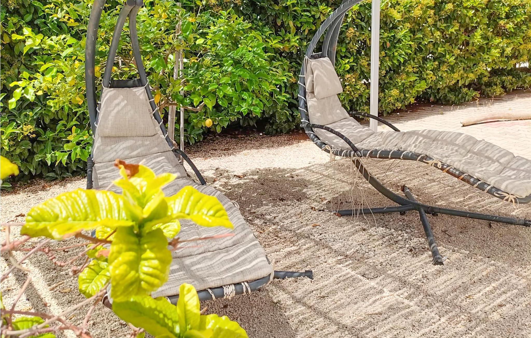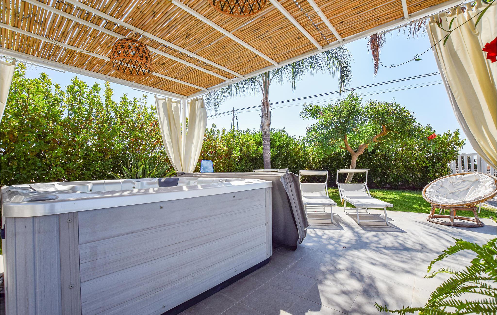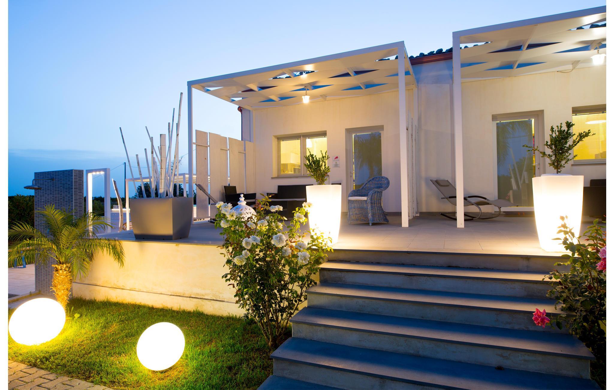Huset ligger på en välskött fastighet med gräsmatta, blommor och inhemska träd, som du kan nå direkt med din egen bil. I trädgården hittar du ett område med solstolar och trädgårdsbord samt ett exotiskt utseende gazebo som rymmer en bubbelpool för 5 personer. Från poolen i väster kan du beundra fantastiska solnedgångar.