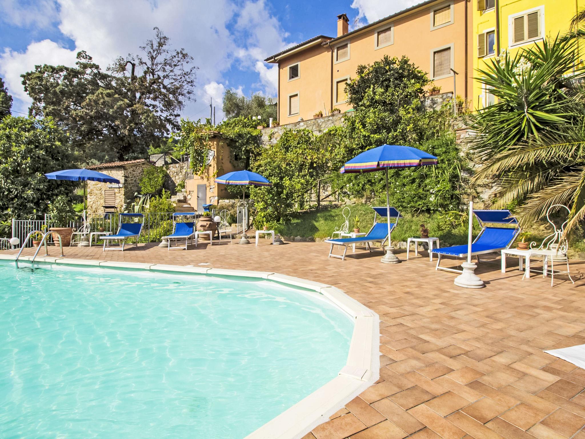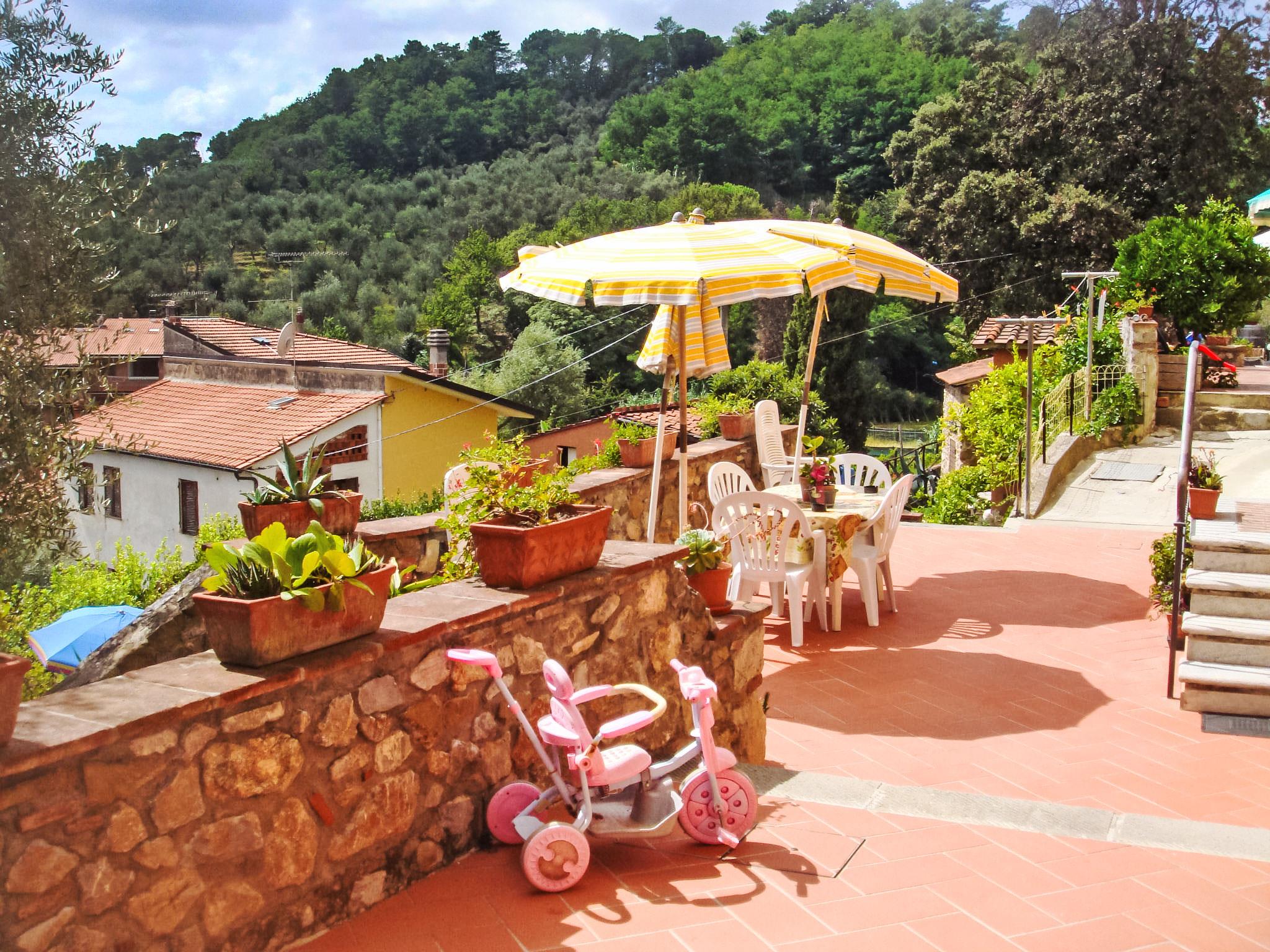 Bozzano 3 km from Massarosa: Rustic, historical holiday development, surrounded by meadows and fields. 500 m from the centre of Bozzano, 22 km from the centre of Viareggio, 16 km from the centre of Massarosa, in a quiet, sunny position on a slope, 11 km from the sea, 3 km from the lake, located by a road. For shared use: garden 1'000 m2, swimming pool (12 x 5 m, depth 150 cm, seasonal availability: 01.May. - 30.Sep.). Outdoor shower, table tennis, terrace, garden furniture, barbecue, pool maintenance by the owner/gardener. In the complex: internet access, central heating system, heating to be paid on the spot (20.Mar. - 30.Oct.), heating available only from 31.Oct. - 19.Mar.. Linen change weekly (suppl. charge extra). Room cleaning on request. Parking at the house. Grocery 500 m, supermarket 1 km, restaurant 1 km, bar 500 m, bus stop 1 km, railway station "Bozzano" 1 km, sandy beach 10 km. Indoor tennis centre 2 km, riding stable 2 km, walking paths from the house 50 m. Nearby attractions: Firenze 124 km, Lucca 18 km, Pisa 34 km, Pietrasanta 36 km, Forte dei Marmi 38 km, San Giuliano Terme 29 km. Well-known lakes can easily be reached: Lago di Massaciuccoli 26 km, Torre del Lago 27 km. Please note: car recommended. Mini golf course. Own wine, limoncello and olive oil production. The apartment Alice has 2 parasols and 4 deck chairs around the pool, the apartment Aida has 1 parasol and 2 deck chairs. The apartment Bruna has 3 parasols and 6 deck chairs. Access to the pool is via an external staircase.
