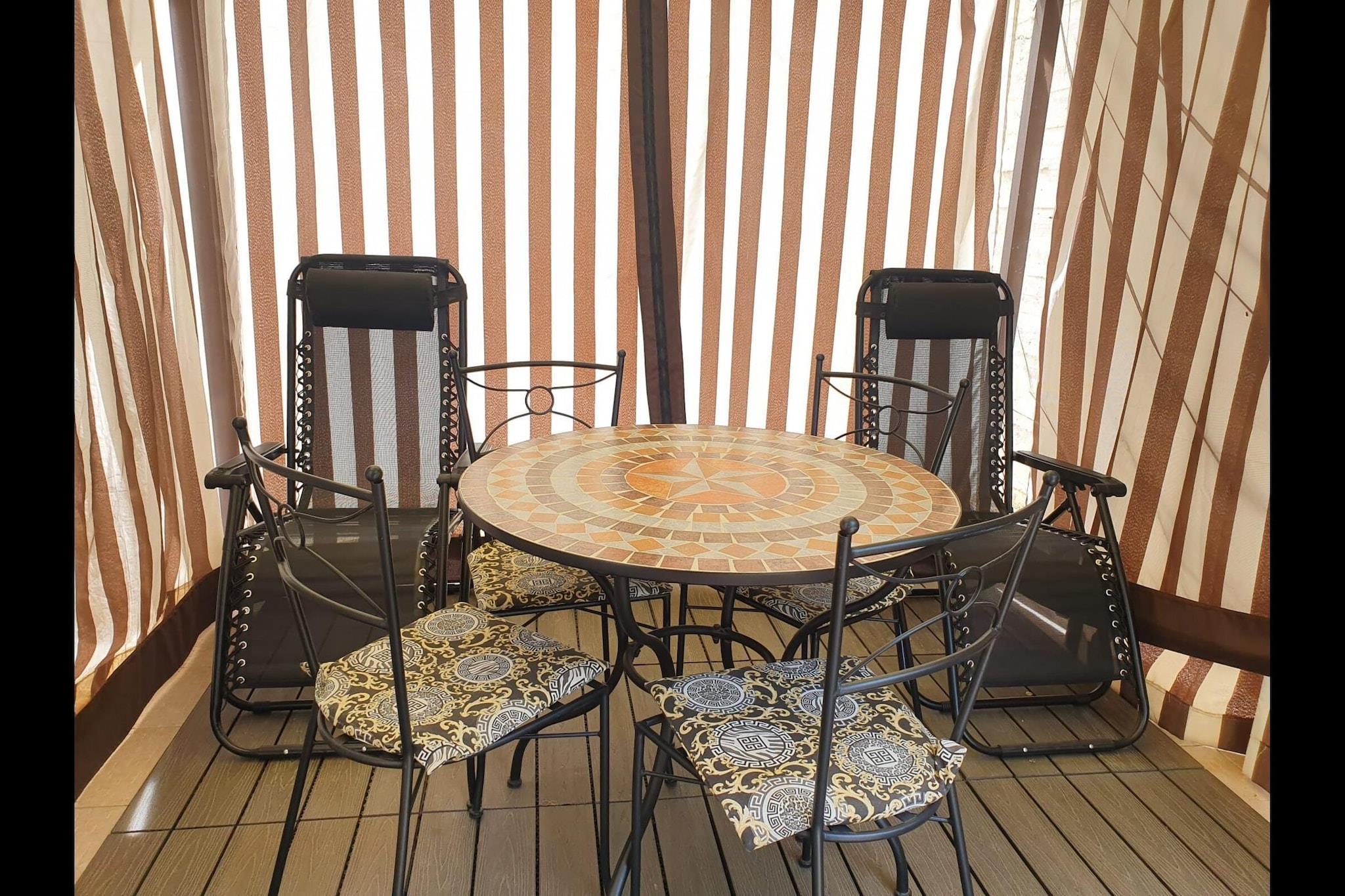 På våning 1: (Vardagsrum(bäddsoffa, TV), öppet kök(Kokplattor, Kokplattor, spis, spis, kaffebryggare, kaffebryggare, kylskåp, kylskåp), sovrum(dubbelsäng), badrum(dusch, handfat, toalett , bidé, hårfön)) värme(elektrisk), luftkonditionering, terrass, trädgårdsmöbler, parking lot(public)