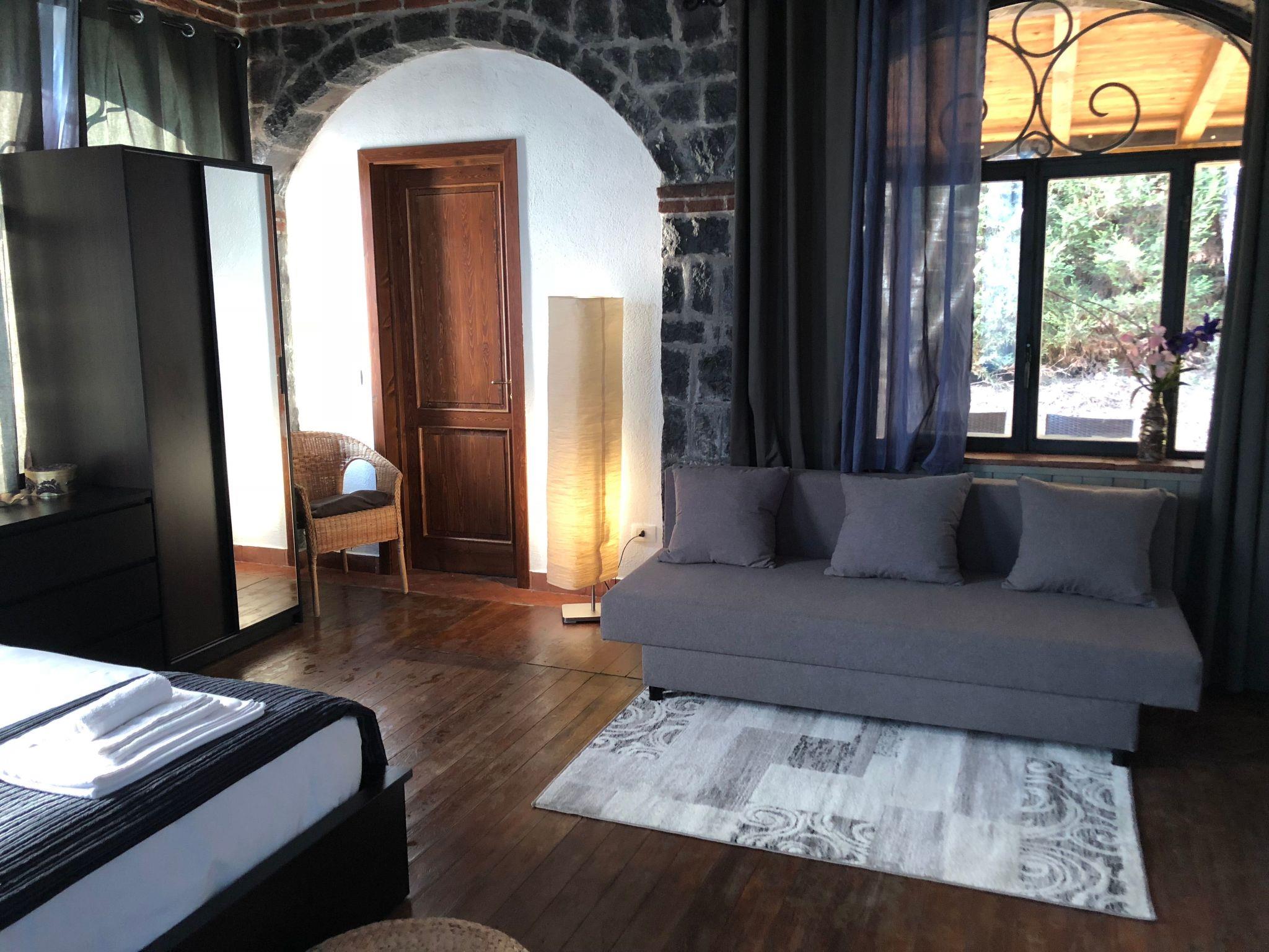 This elegant guest cottage is actually a historic chalet dating back to 1798. The charming little building is part of a modern B&B and is available all year round. It offers 40 m² of living space on one level and was completely renovated and refurbished in 2017. This spacious room for four has its own entrance and private veranda in a B&B with a large garden and shared swimming pool, surrounded by the beautiful landscape of Mount Etna National Park.