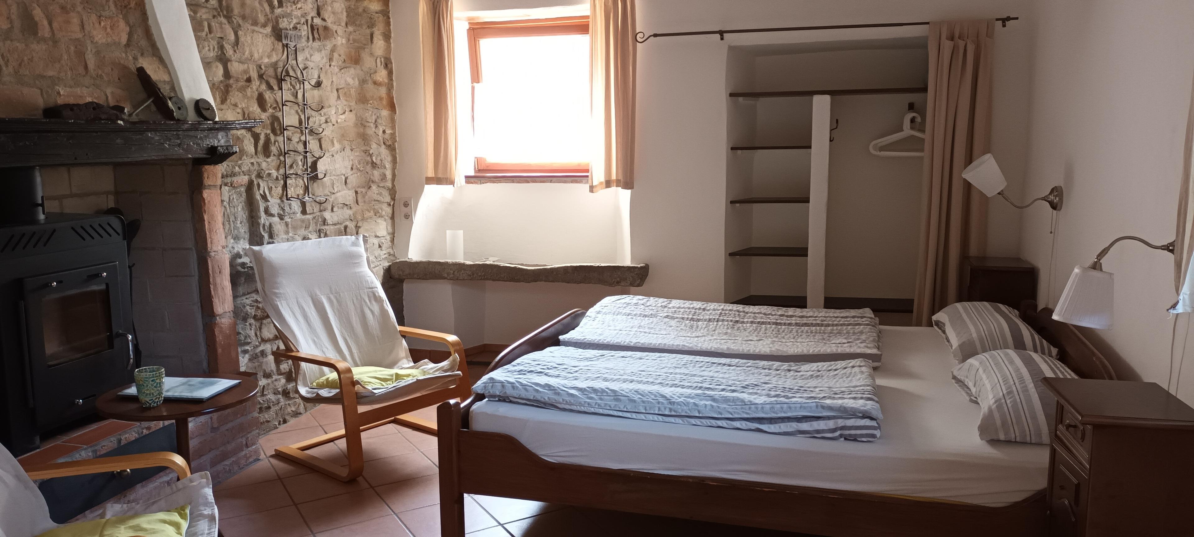 Die Wohnung verfügt über einen Wohn-Schlafbereich mit Sitzgelegenheit und einem Holzofen. In der kleinen Küche gibt es einen 2-Platten Herd, einen Kühlschrank und einen gemütlichen Sitzplatz.