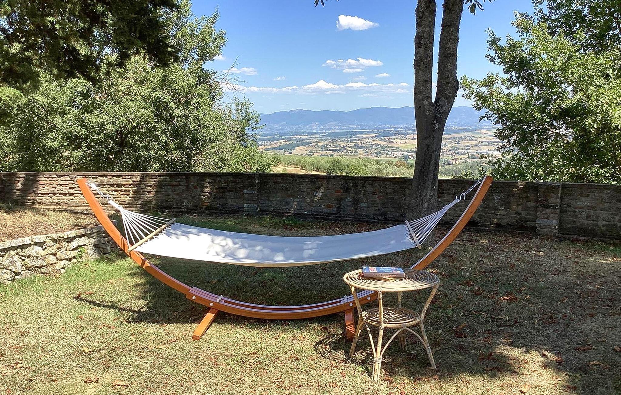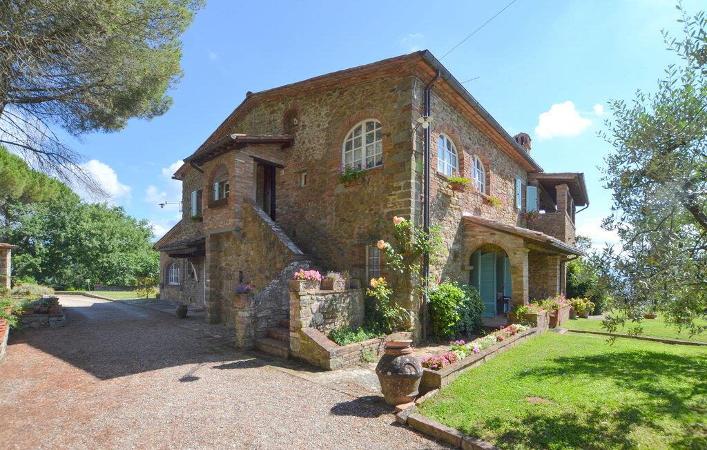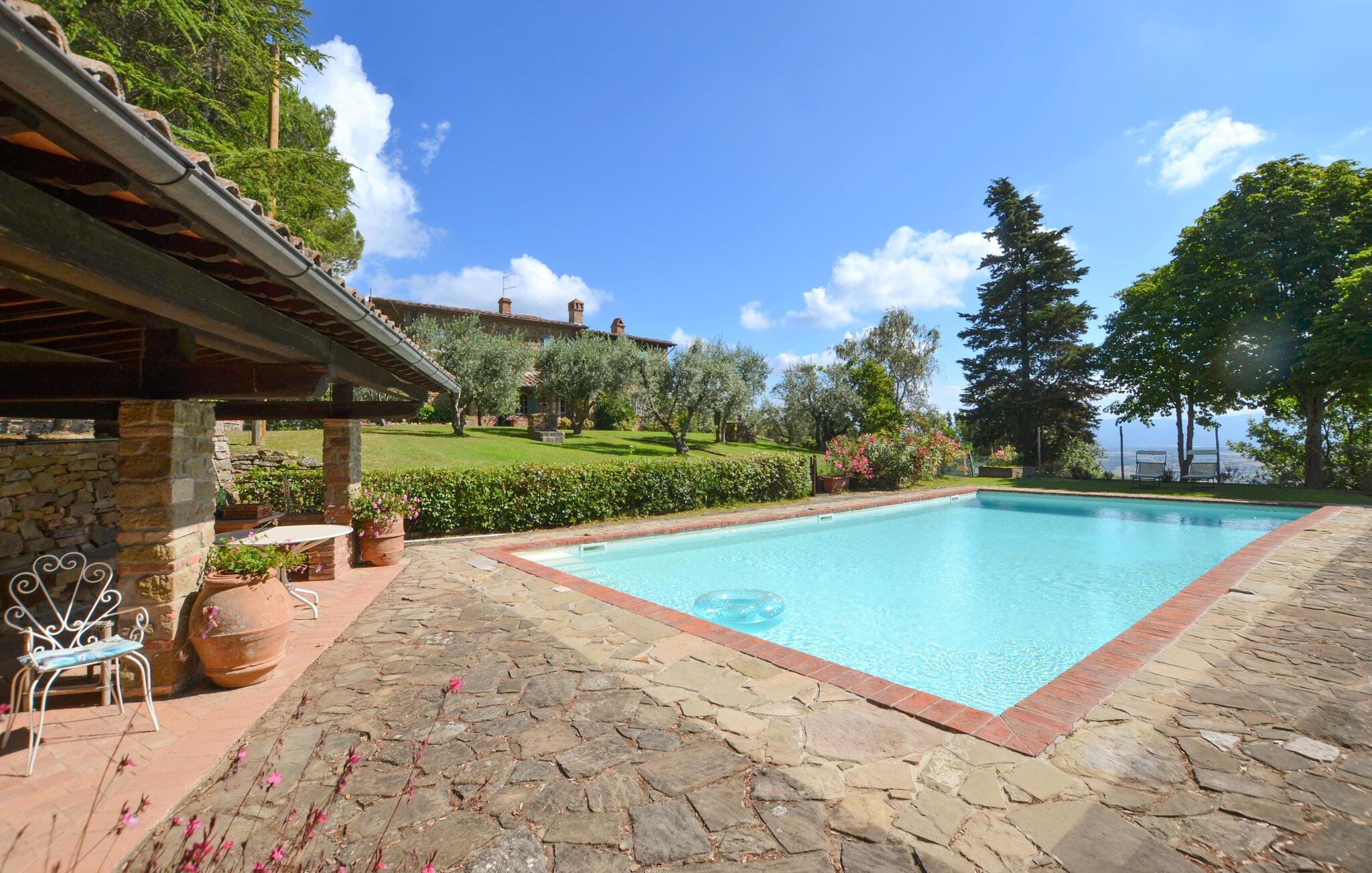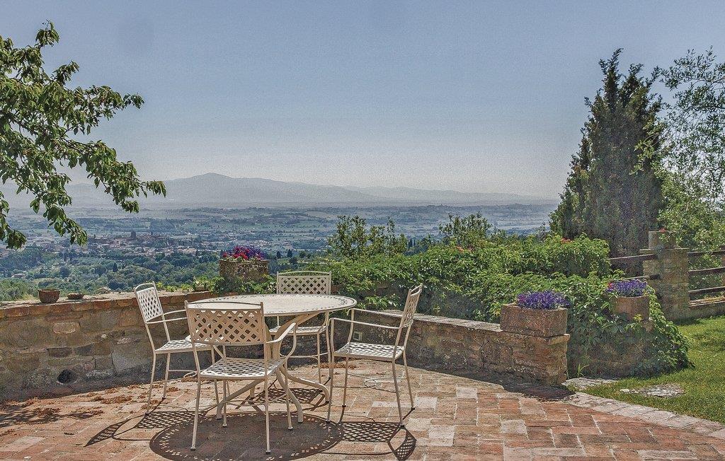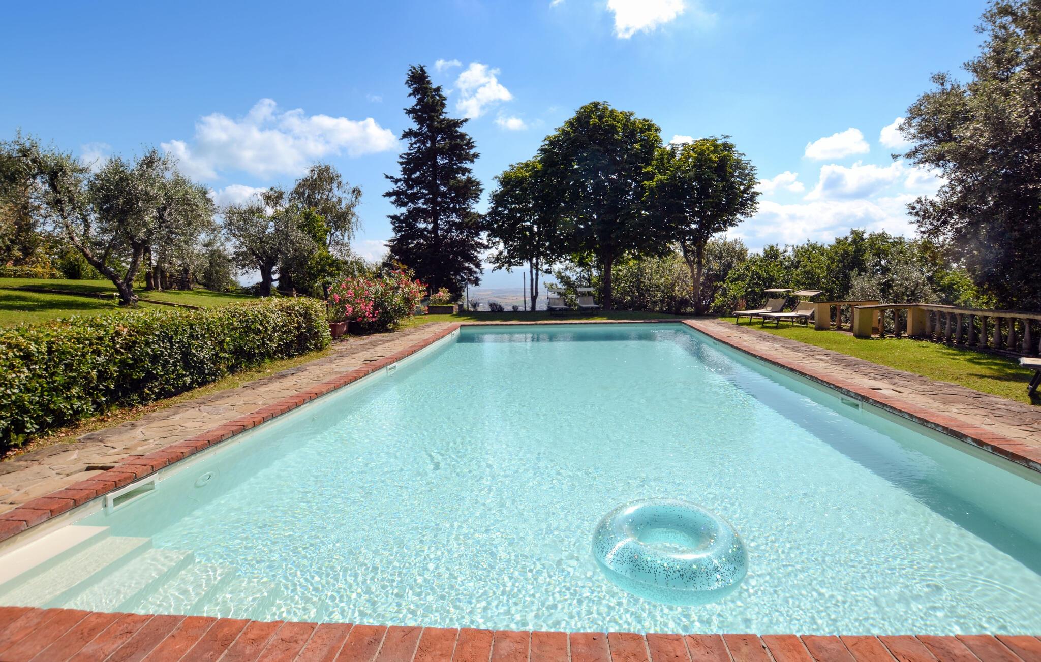 Bekvämt lanthus i toskansk stil, med parkliknande trädgård och exklusivt poolområde, ca 3 km från den trevliga staden Monte San Savino. Den före detta bondgården, som ligger i ett lätt kuperat läge ovanför Chiana-dalen, är synnerligen smakfullt inredd. På bottenvåningen bildar ett stort öppet vardagsrum, som endast delas av valv, husets mysiga centrum. Köket har en egen terrass med grill och en vidsträckt utsikt över den gröna Chiana-dalen. Ytterligare terrasser omger huset både på bottenvåningen och på första våningen, där sovrummen ligger. Lite nedanför huset ligger den stora poolen med solterrasser och en täckt terrass, bekvämt möblerad - vad mer behöver du för att koppla av? Bara två km bort kan du nå en bra restaurang - även till fots under en promenad genom det pittoreska landskapet. I den närliggande staden Monte San Savino (3 km) hittar du allt för dina dagliga behov - flera bra restauranger, barer, en glassbar, små butiker med specialiteter och på onsdagar en färgglad veckomarknad. Byns kulinariska specialitet är porchetta, en välkryddad spädgris. För kulturellt intresserade och passionerade stadsresenärer är det inte heller långt till Arezzo (18 km, även med långsamtåg från Monte San Savino), Cortona 25 km, Montepulciano och Siena 45 km, eller till Florens 90 km. Fastigheten är helt inhägnad. Kort oasfalterad tillfartsväg.