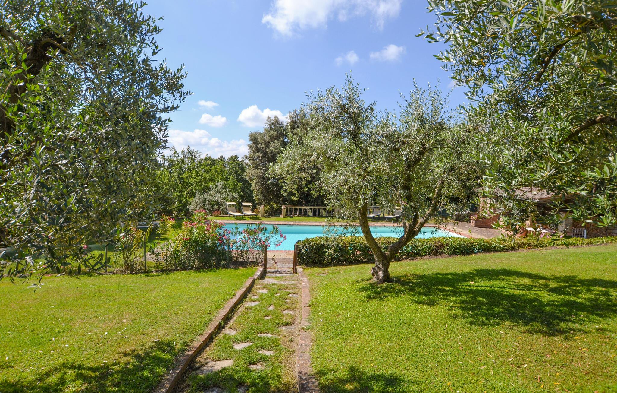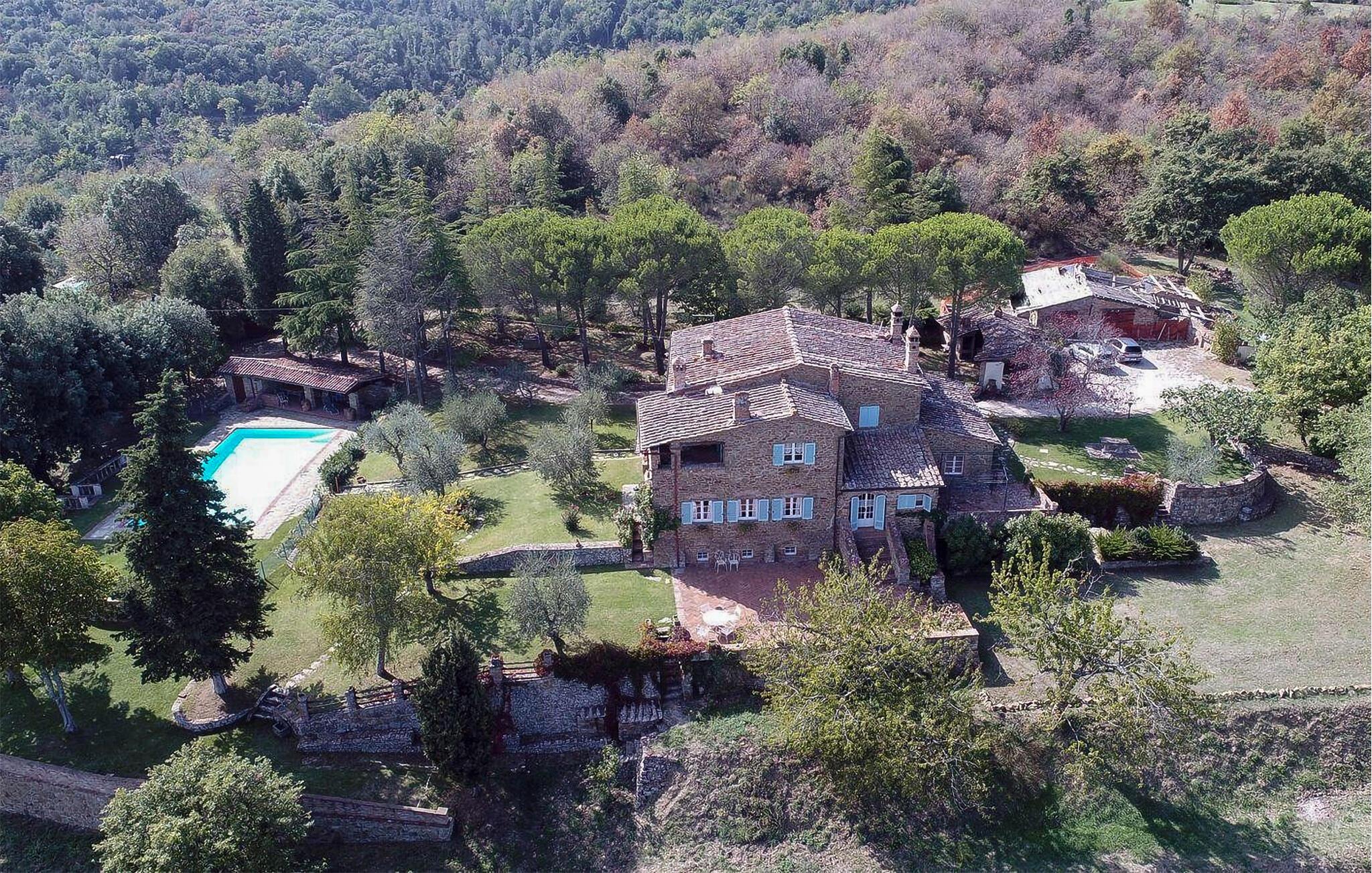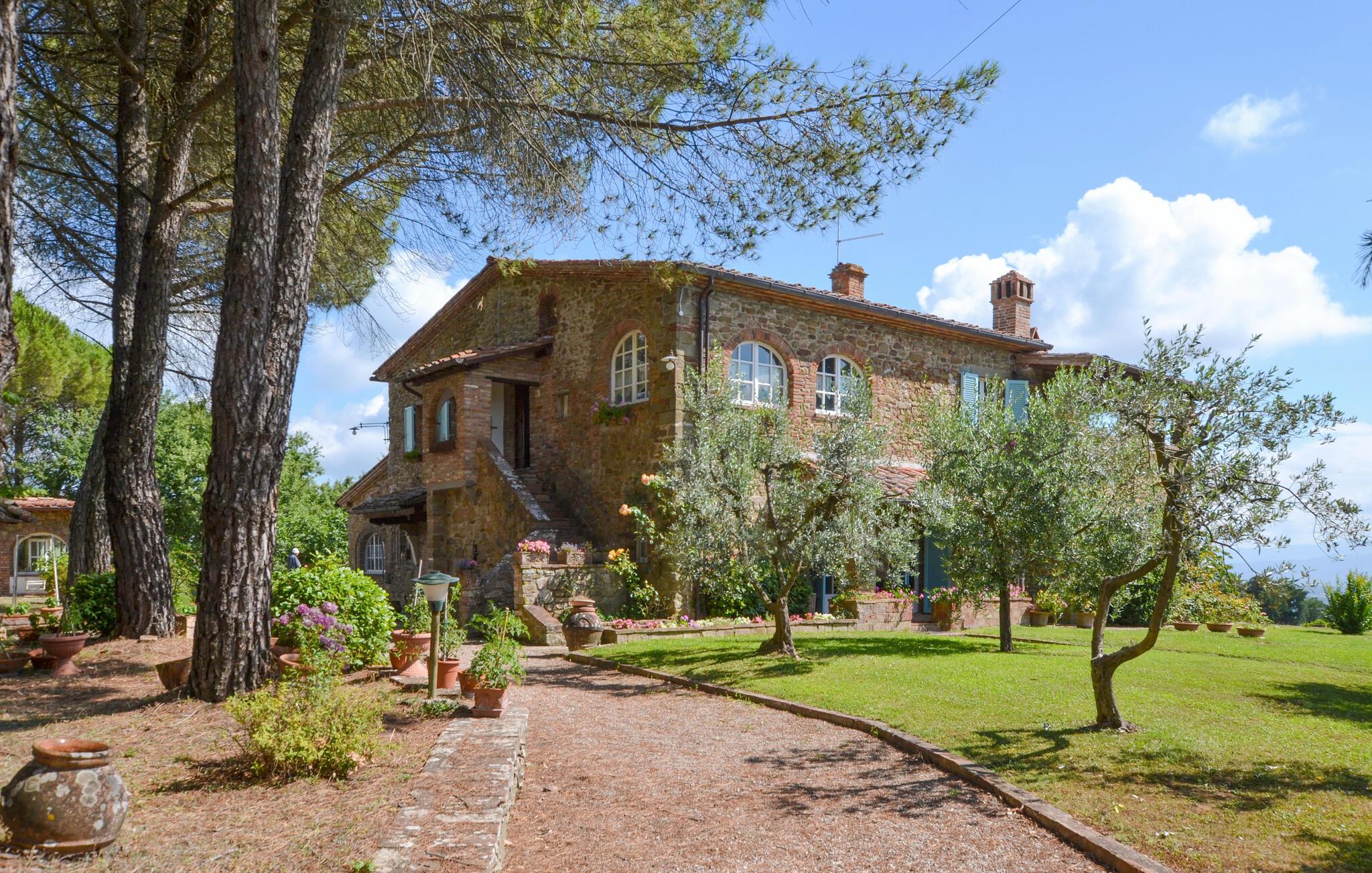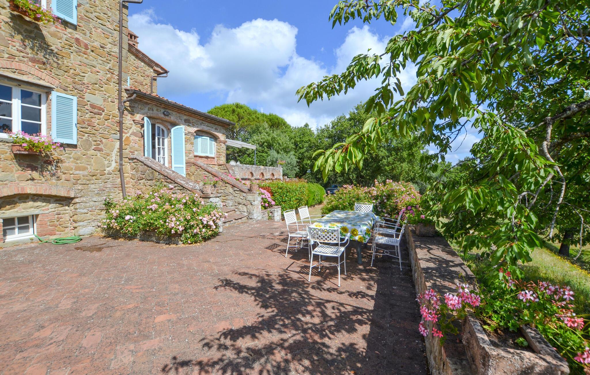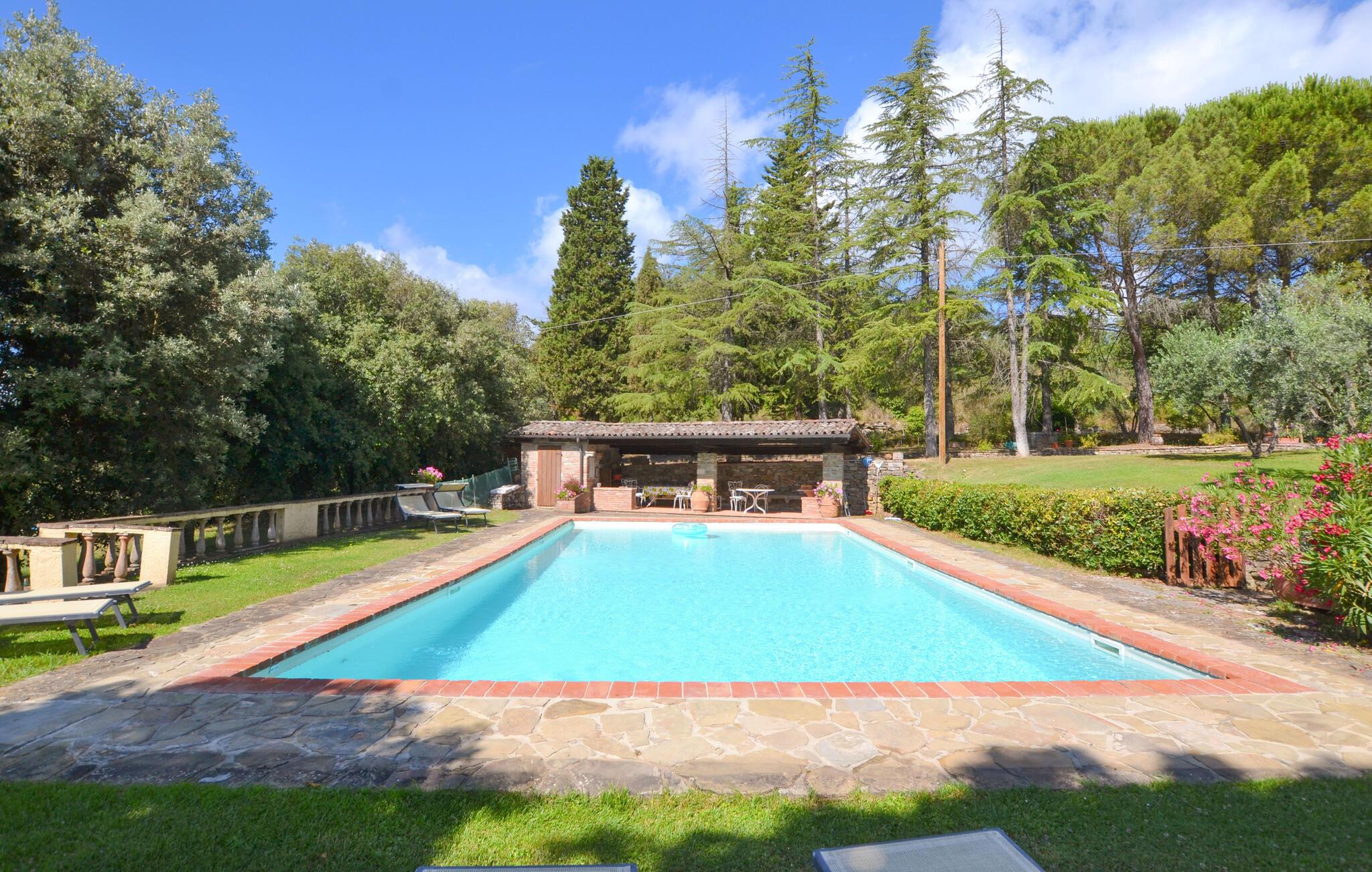 Bekvämt lanthus i toskansk stil, med parkliknande trädgård och exklusivt poolområde, ca 3 km från den trevliga staden Monte San Savino. Den före detta bondgården, som ligger i ett lätt kuperat läge ovanför Chiana-dalen, är synnerligen smakfullt inredd. På bottenvåningen bildar ett stort öppet vardagsrum, som endast delas av valv, husets mysiga centrum. Köket har en egen terrass med grill och en vidsträckt utsikt över den gröna Chiana-dalen. Ytterligare terrasser omger huset både på bottenvåningen och på första våningen, där sovrummen ligger. Lite nedanför huset ligger den stora poolen med solterrasser och en täckt terrass, bekvämt möblerad - vad mer behöver du för att koppla av? Bara två km bort kan du nå en bra restaurang - även till fots under en promenad genom det pittoreska landskapet. I den närliggande staden Monte San Savino (3 km) hittar du allt för dina dagliga behov - flera bra restauranger, barer, en glassbar, små butiker med specialiteter och på onsdagar en färgglad veckomarknad. Byns kulinariska specialitet är porchetta, en välkryddad spädgris. För kulturellt intresserade och passionerade stadsresenärer är det inte heller långt till Arezzo (18 km, även med långsamtåg från Monte San Savino), Cortona 25 km, Montepulciano och Siena 45 km, eller till Florens 90 km. Fastigheten är helt inhägnad. Kort oasfalterad tillfartsväg.