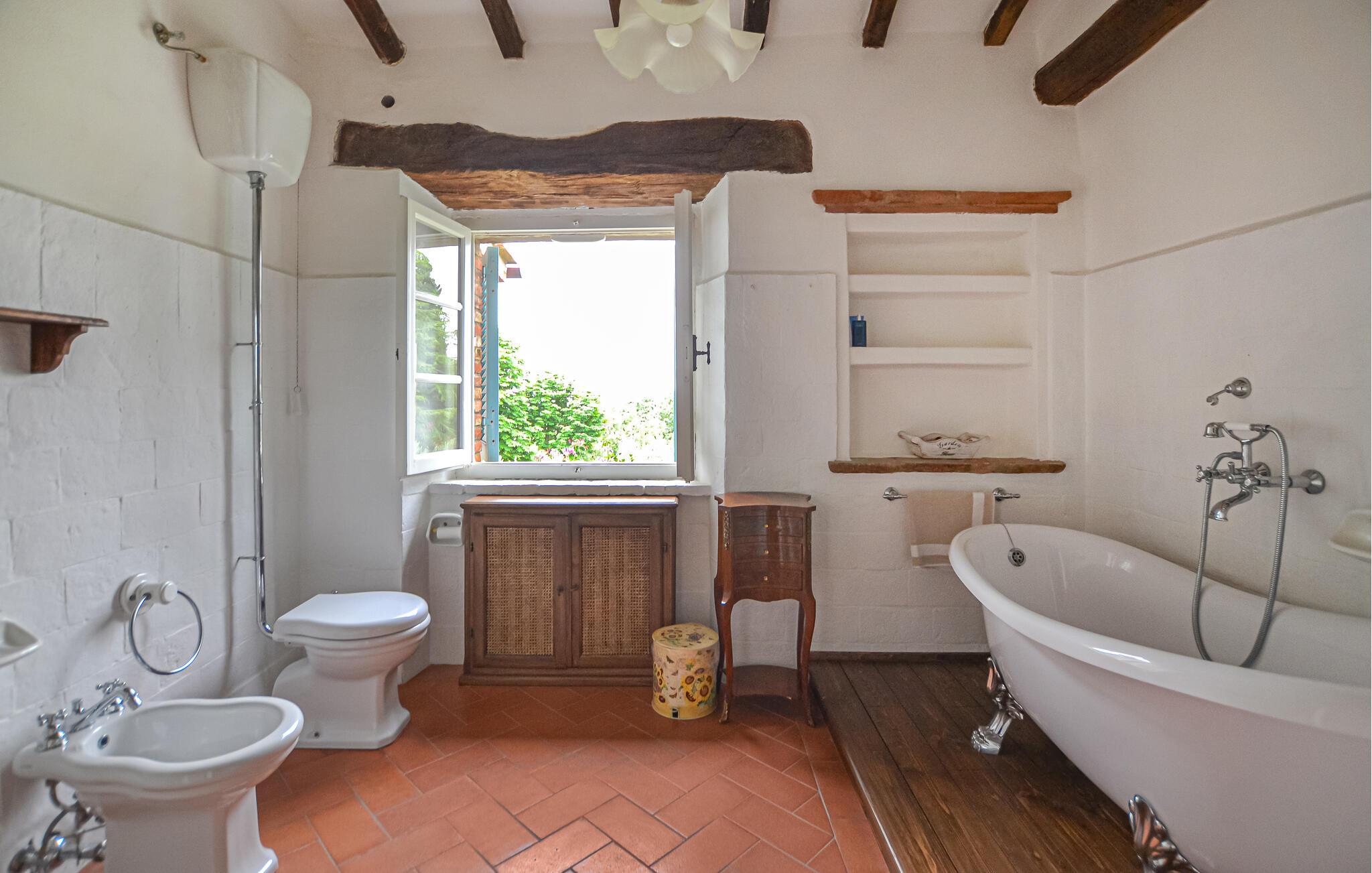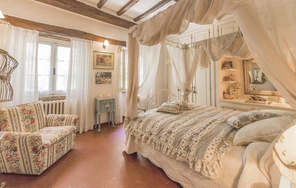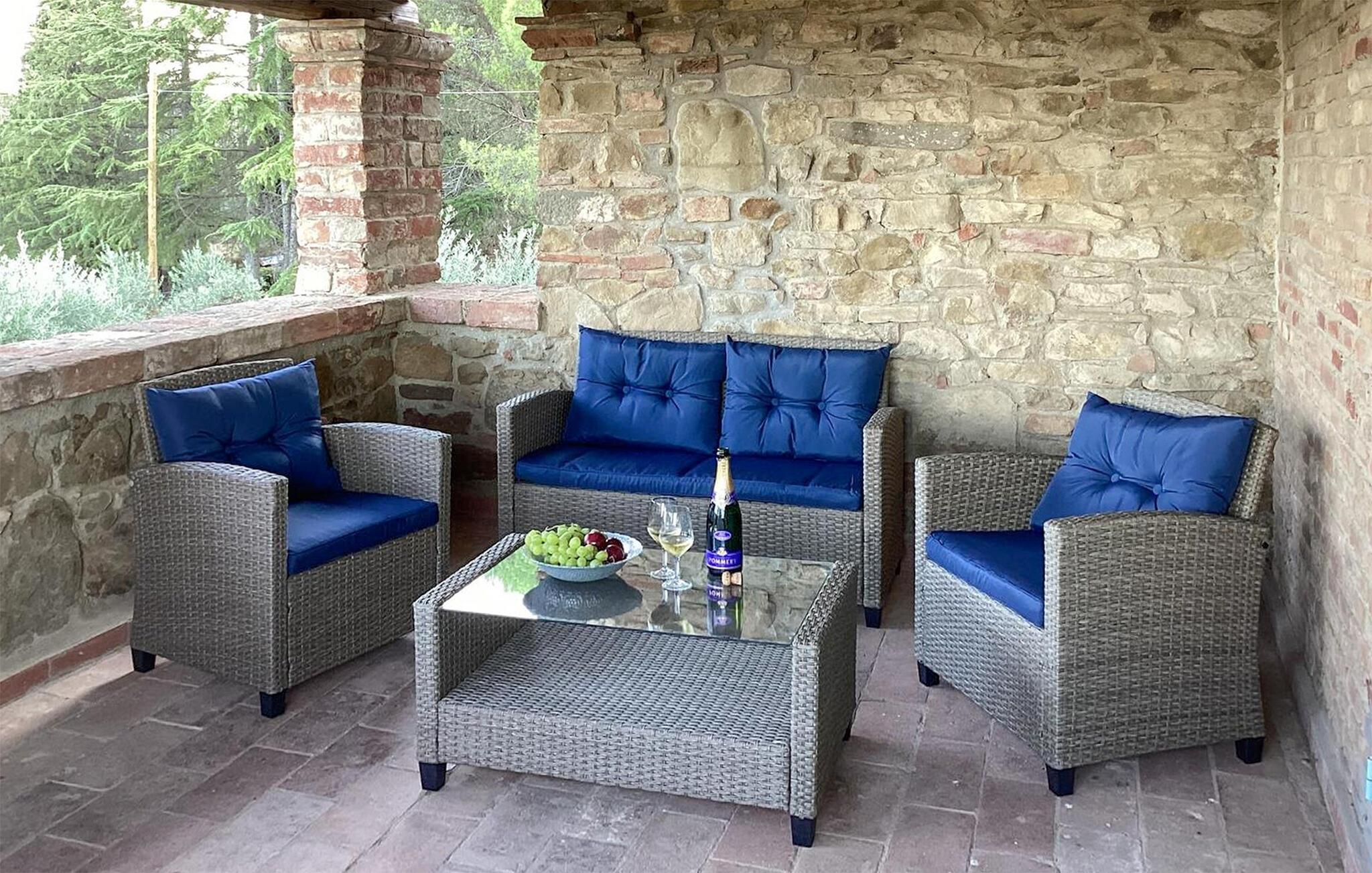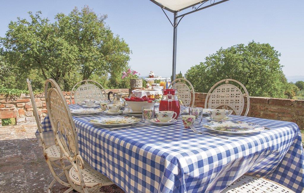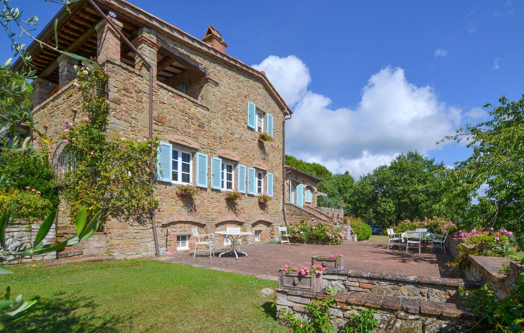Bekvämt lanthus i toskansk stil, med parkliknande trädgård och exklusivt poolområde, ca 3 km från den trevliga staden Monte San Savino. Den före detta bondgården, som ligger i ett lätt kuperat läge ovanför Chiana-dalen, är synnerligen smakfullt inredd. På bottenvåningen bildar ett stort öppet vardagsrum, som endast delas av valv, husets mysiga centrum. Köket har en egen terrass med grill och en vidsträckt utsikt över den gröna Chiana-dalen. Ytterligare terrasser omger huset både på bottenvåningen och på första våningen, där sovrummen ligger. Lite nedanför huset ligger den stora poolen med solterrasser och en täckt terrass, bekvämt möblerad - vad mer behöver du för att koppla av? Bara två km bort kan du nå en bra restaurang - även till fots under en promenad genom det pittoreska landskapet. I den närliggande staden Monte San Savino (3 km) hittar du allt för dina dagliga behov - flera bra restauranger, barer, en glassbar, små butiker med specialiteter och på onsdagar en färgglad veckomarknad. Byns kulinariska specialitet är porchetta, en välkryddad spädgris. För kulturellt intresserade och passionerade stadsresenärer är det inte heller långt till Arezzo (18 km, även med långsamtåg från Monte San Savino), Cortona 25 km, Montepulciano och Siena 45 km, eller till Florens 90 km. Fastigheten är helt inhägnad. Kort oasfalterad tillfartsväg.