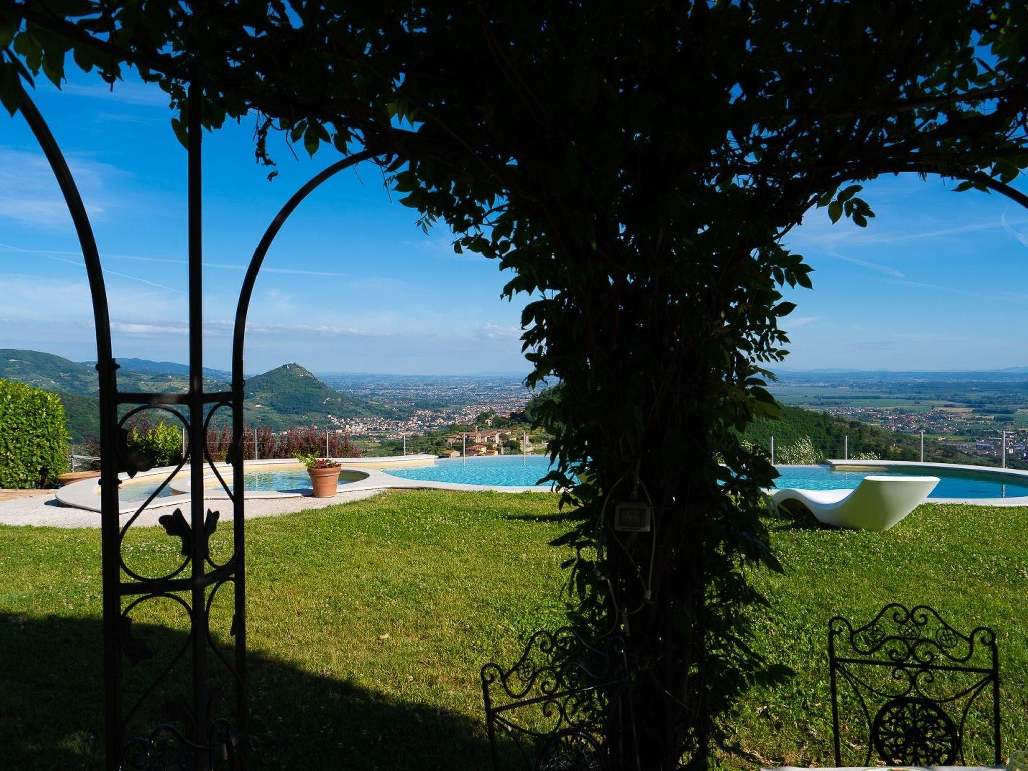 Big garden fenced with pool with jacuzzi seats and panoramic view