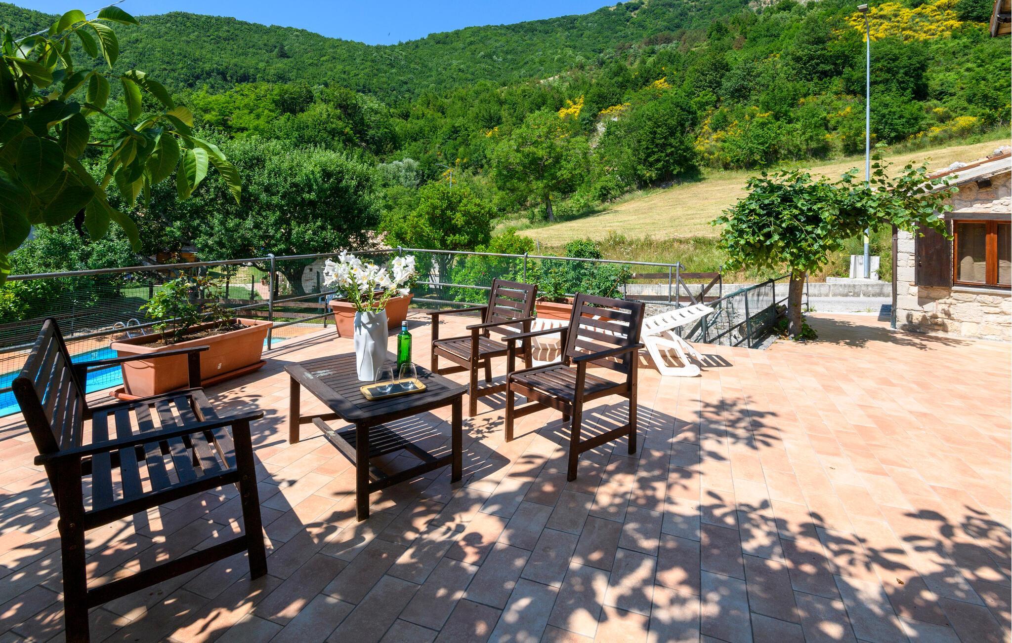 Tillbringa soliga timmar vid den stora gemensamma poolen. Simma några längder eller låt dig bara flyta med. Använd den moderna bastun för timmar av rogivande avkoppling. Fastigheten är rymlig och omgiven av ängar och kullar, perfekt för lugna stunder med utsikt.