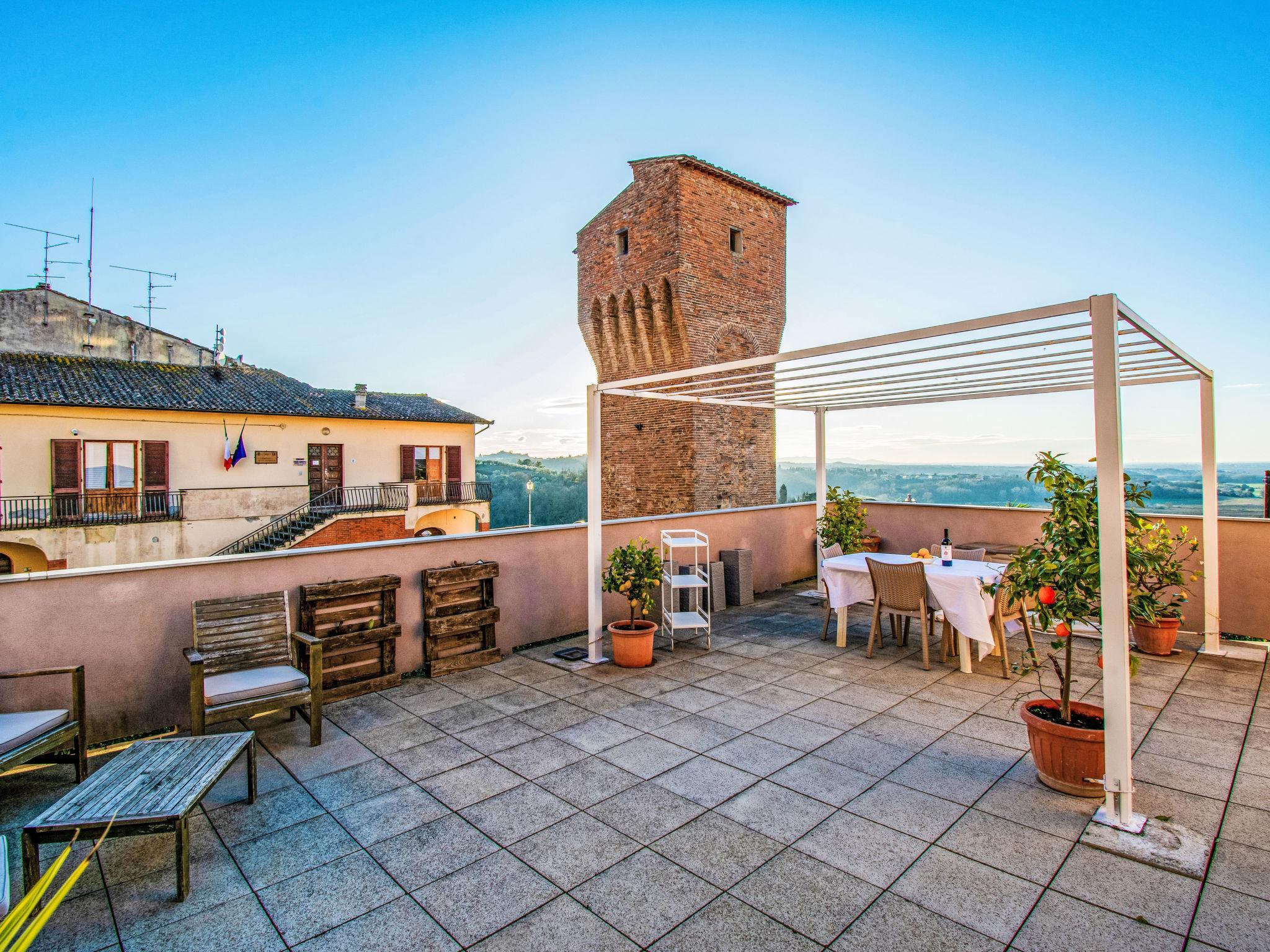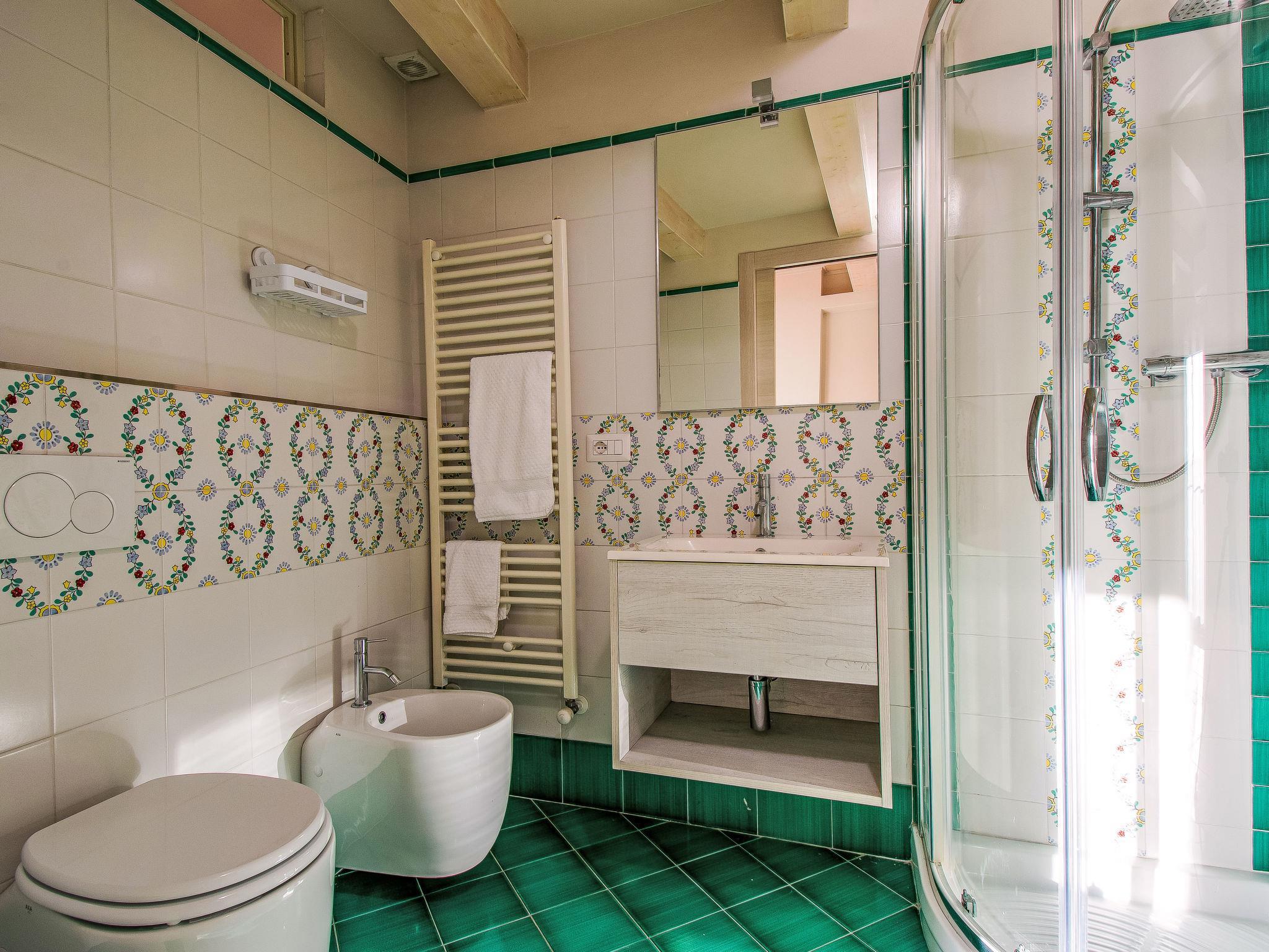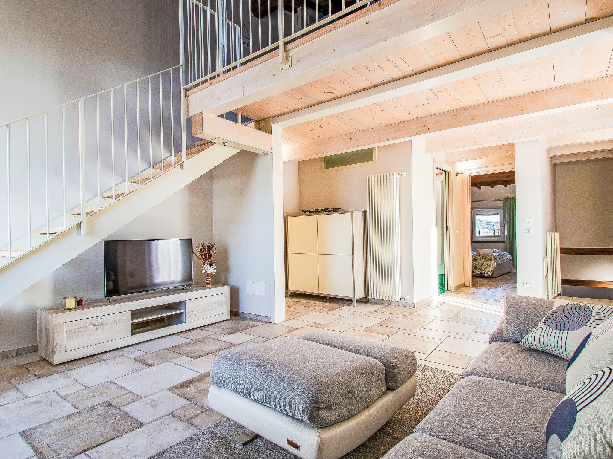 4-room apartment 120 m2 on 2 levels. Modern and cosy furnishings: living room with 1 french bed, digital TV and air conditioning. 1 double bedroom with shower/bidet/WC and air conditioning. 1 double bedroom with digital TV and air conditioning. Shower/bidet/WC. Upper floor: with sloping ceilings, open kitchen (oven, dishwasher, 4 gas rings, toaster, kettle, microwave, electric coffee machine) with air conditioning. Wooden floors. Large terrace 60 m2, porch. Terrace furniture, barbecue (portable). Panoramic view of the countryside. Facilities: washing machine, children's high chair, hair dryer. Internet (WiFi, free). Please note: non-smokers only. Maximum 1 pet/ dog allowed. Smoke alarm, fire extinguisher. IT050022C2L4W4953N
