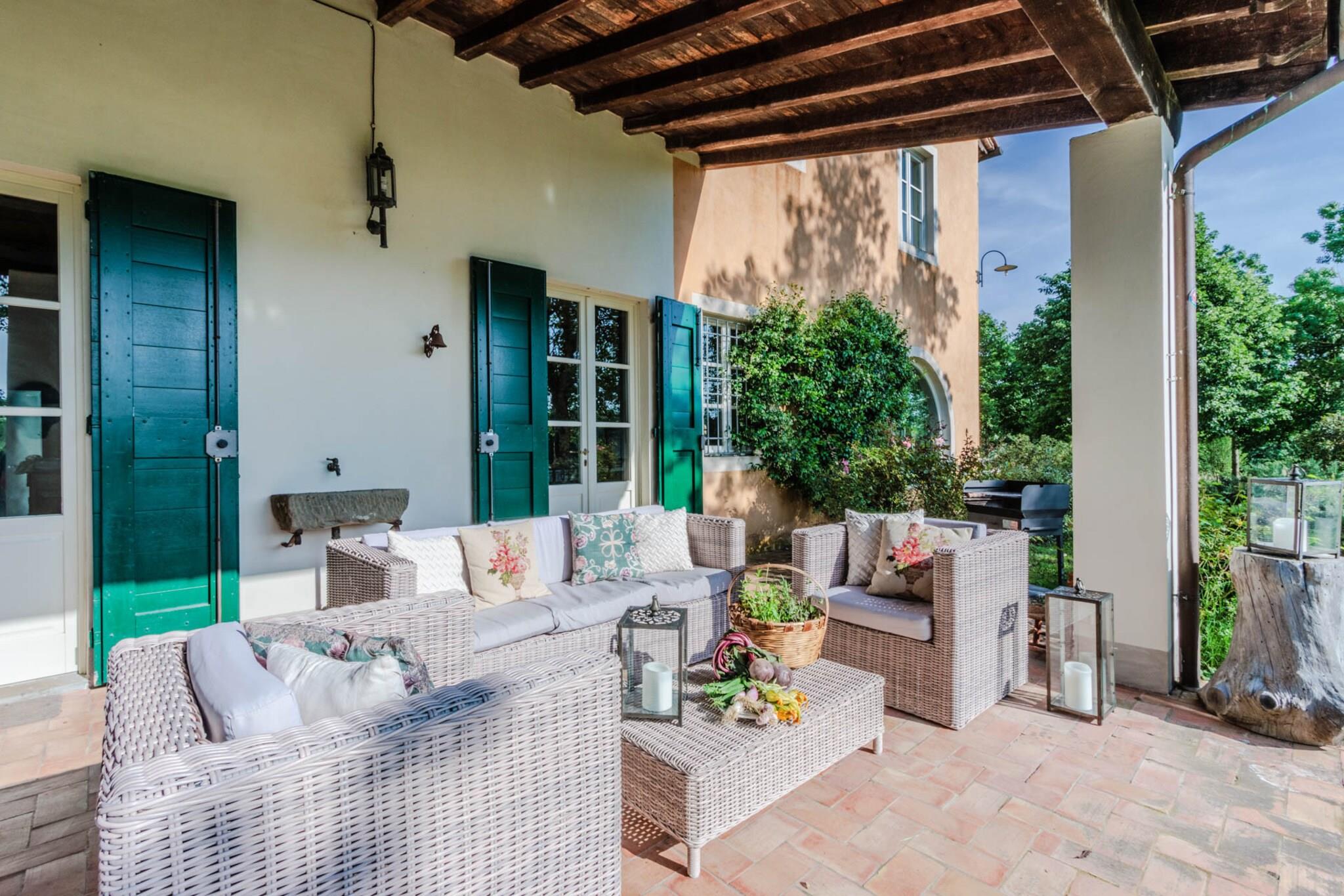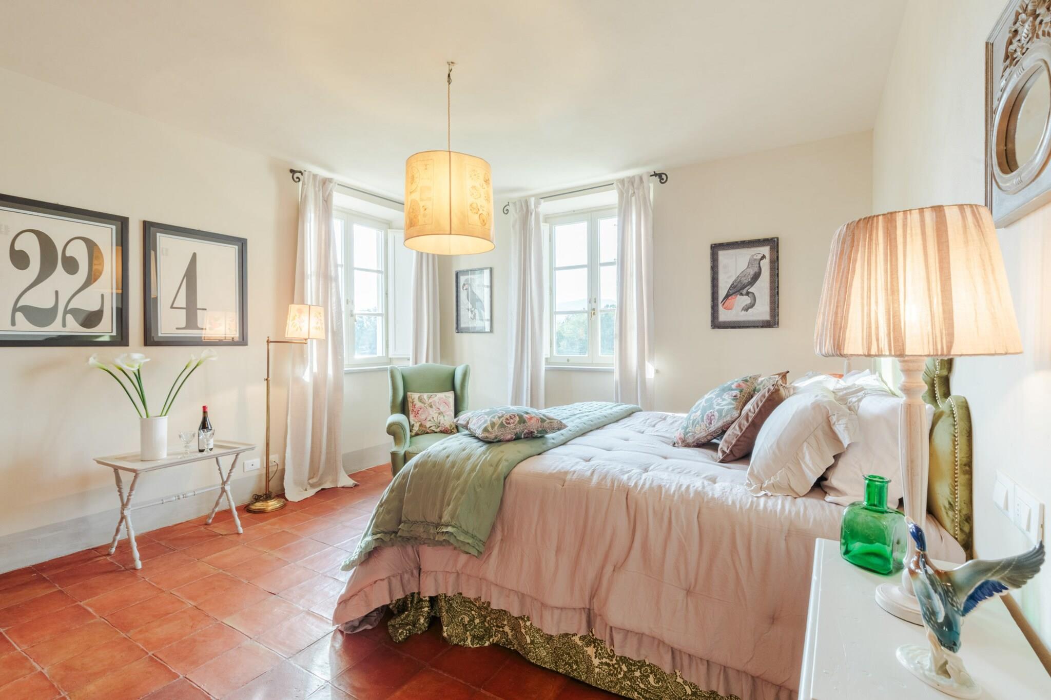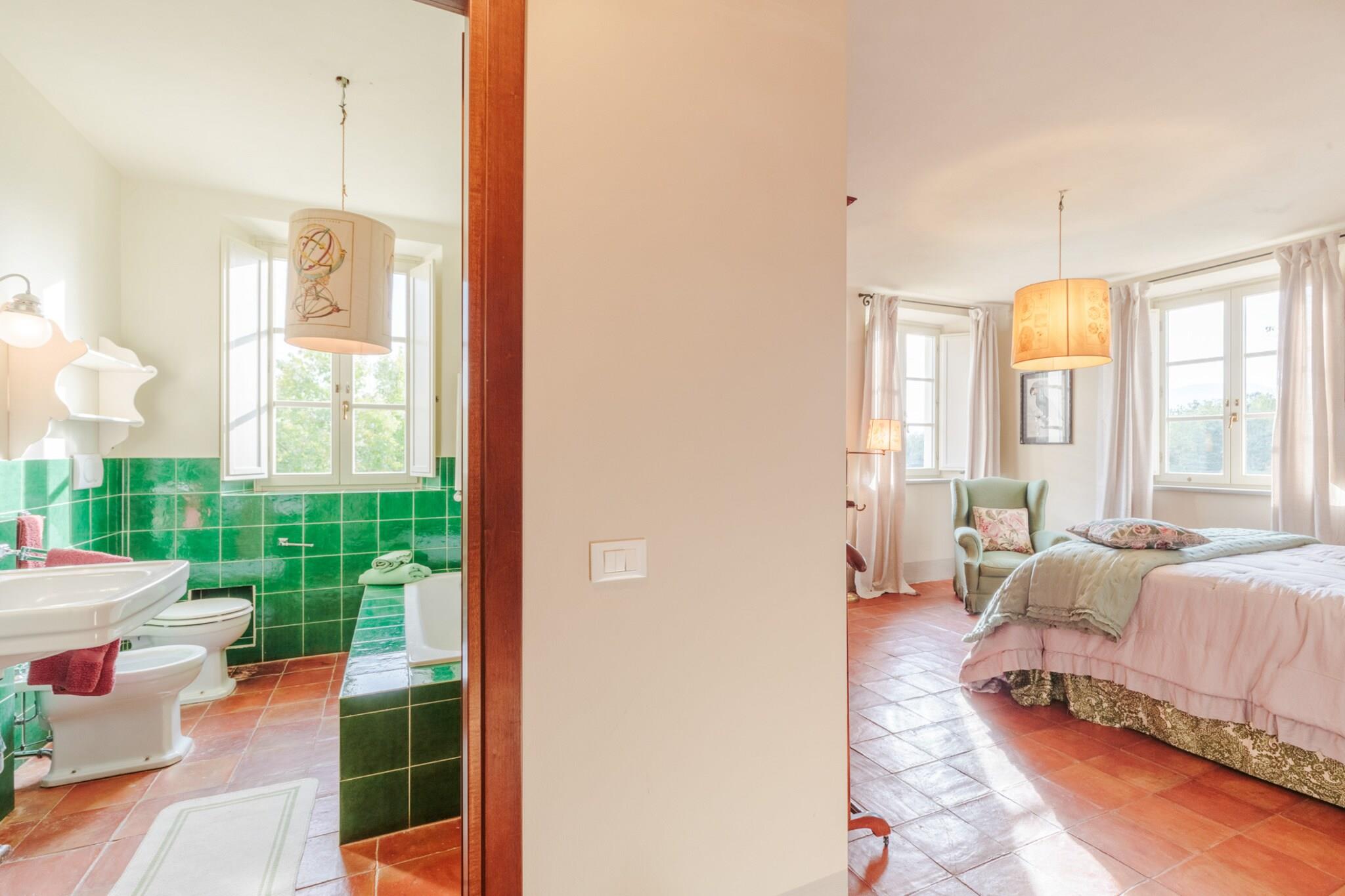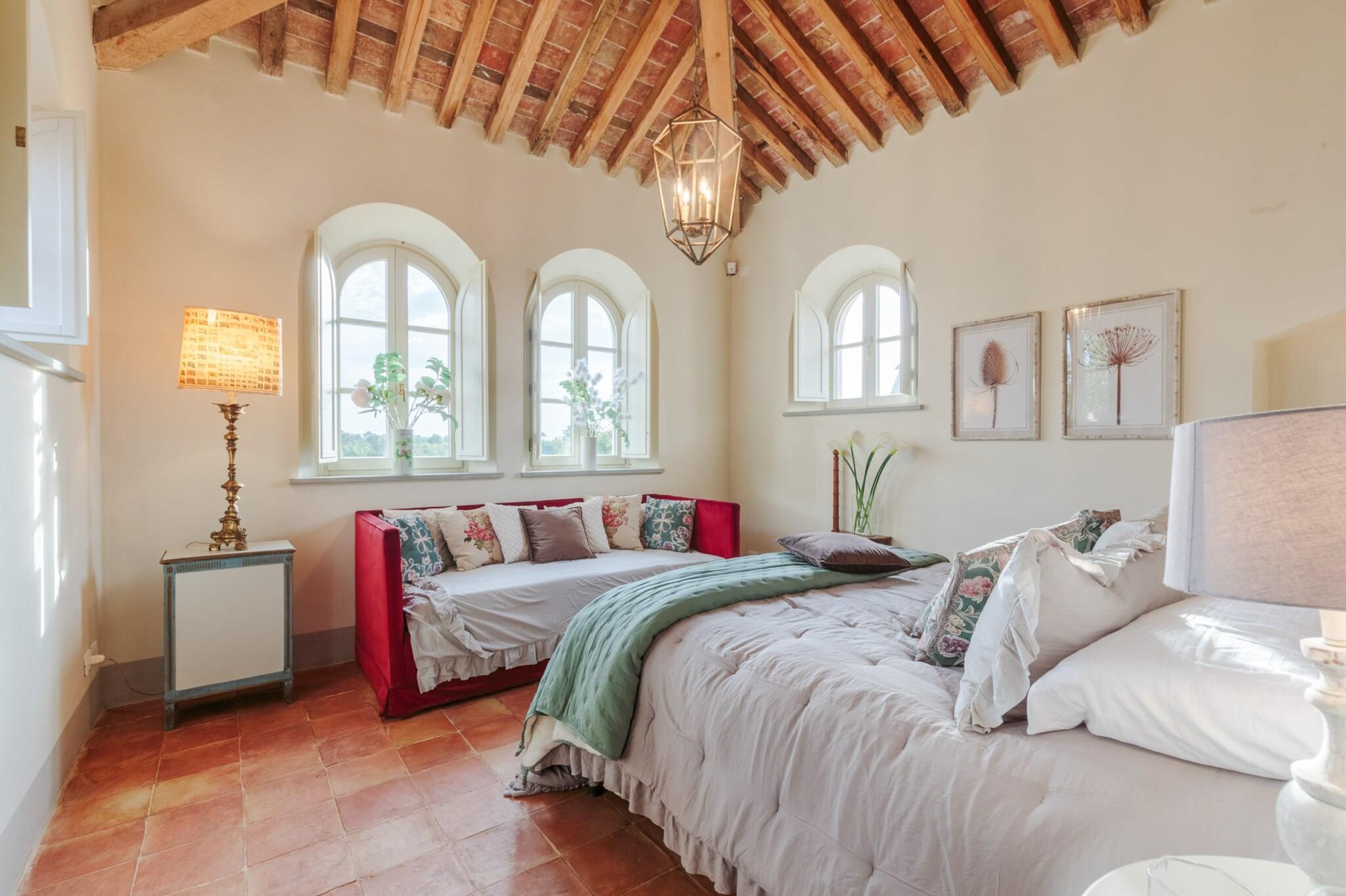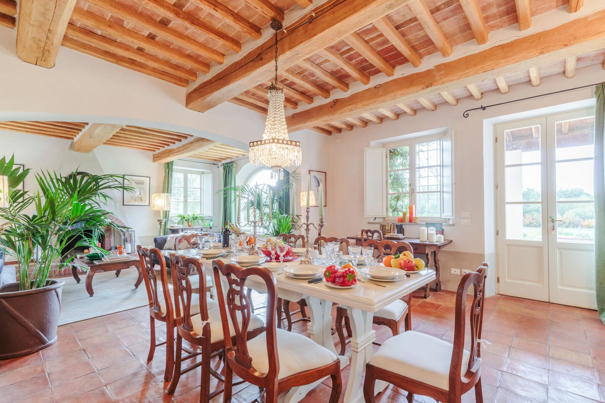 Denna vackert restaurerade villa på landet är en del av en historisk egendom som ägs av en välkänd lokal vinmakare, inbäddad i de böljande kullarna nära Orentano. Omgiven av tusentals hektar orörd skog erbjuder villan en lugn och privat tillflyktsort med privat pool, vidsträckta trädgårdar och panoramautsikt över det toskanska landskapet. Det 300 m² stora huset har fyra rymliga sovrum och flera vardagsrum, med bekväm plats för upp till 8 gäster. Bottenvåningen har ett stort kök, matsal, mysigt vardagsrum med öppen spis och ett badrum. På övervåningen hittar du en mastersvit med eget badrum, ytterligare två sovrum och två badrum. Ett fjärde sovrum ligger på översta våningen. Utomhuslivet är en höjdpunkt här, med en stor veranda för måltider utomhus, en skuggig lounge och en terrass vid poolen som är perfekt för att koppla av med ett glas vin. Villan har ett idealiskt läge för att utforska Toscana och ligger inom bekvämt räckhåll från Lucca, Pisa, Florens, San Gimignano och Cinque Terre. Den närliggande byn Orentano erbjuder restauranger, pizzerior och butiker, medan den större staden Altopascio bara ligger en kort bilresa bort. Oavsett om du njuter av den lugna omgivningen, utforskar närliggande historiska städer eller njuter av lokal mat och vin, erbjuder denna villa en oförglömlig toskansk upplevelse. Obs: Turistskatt ska betalas på boendet.
