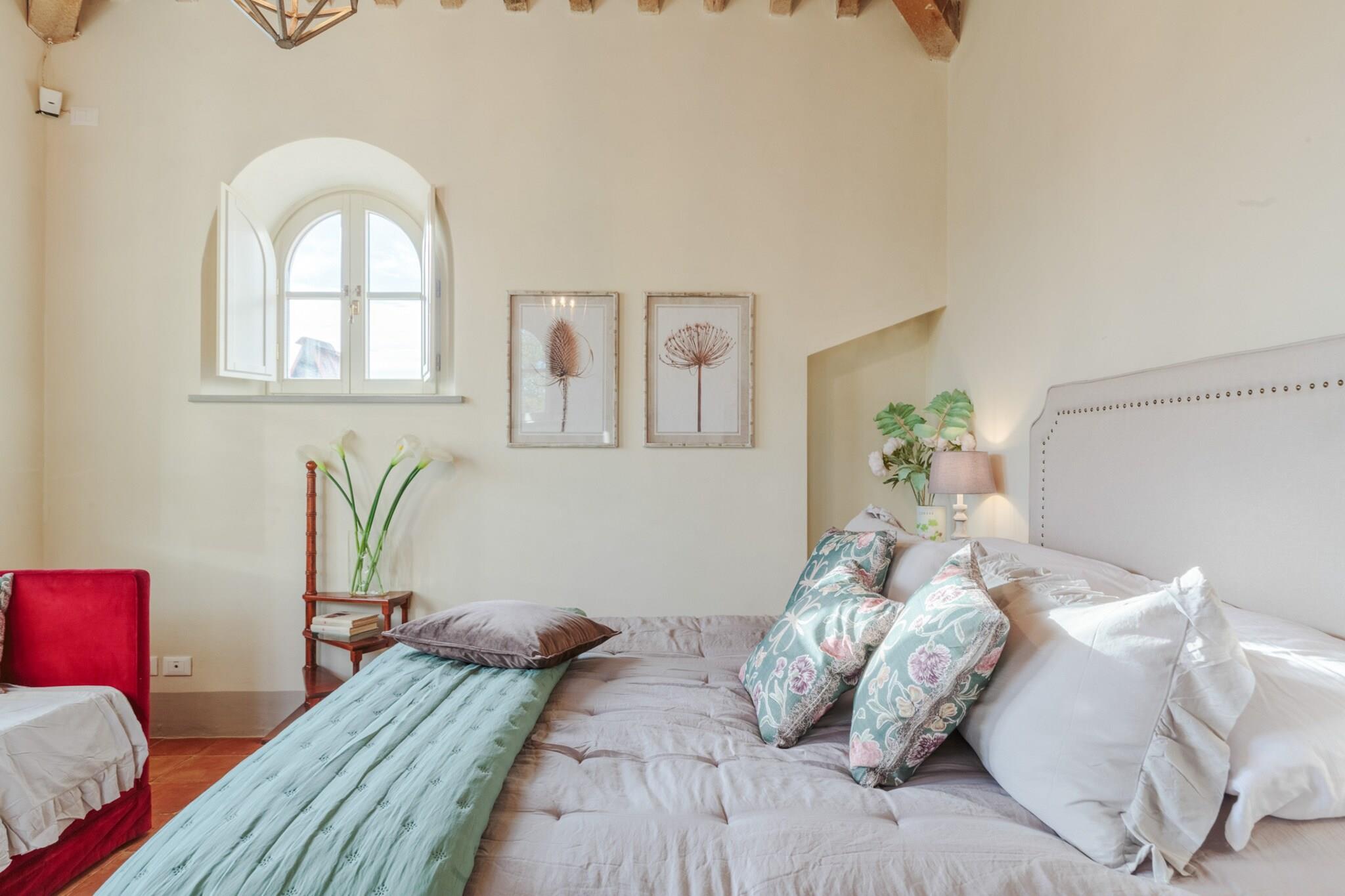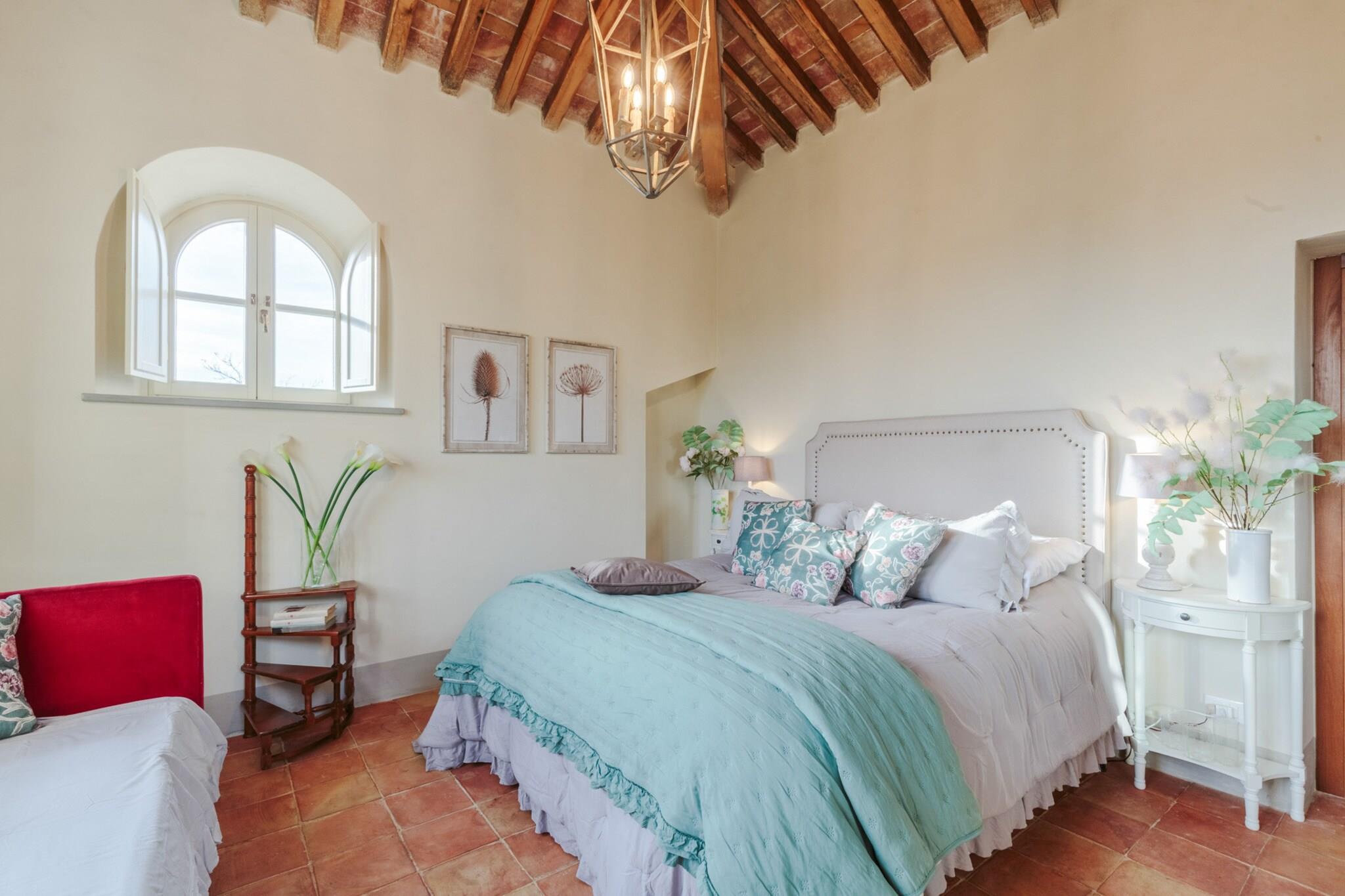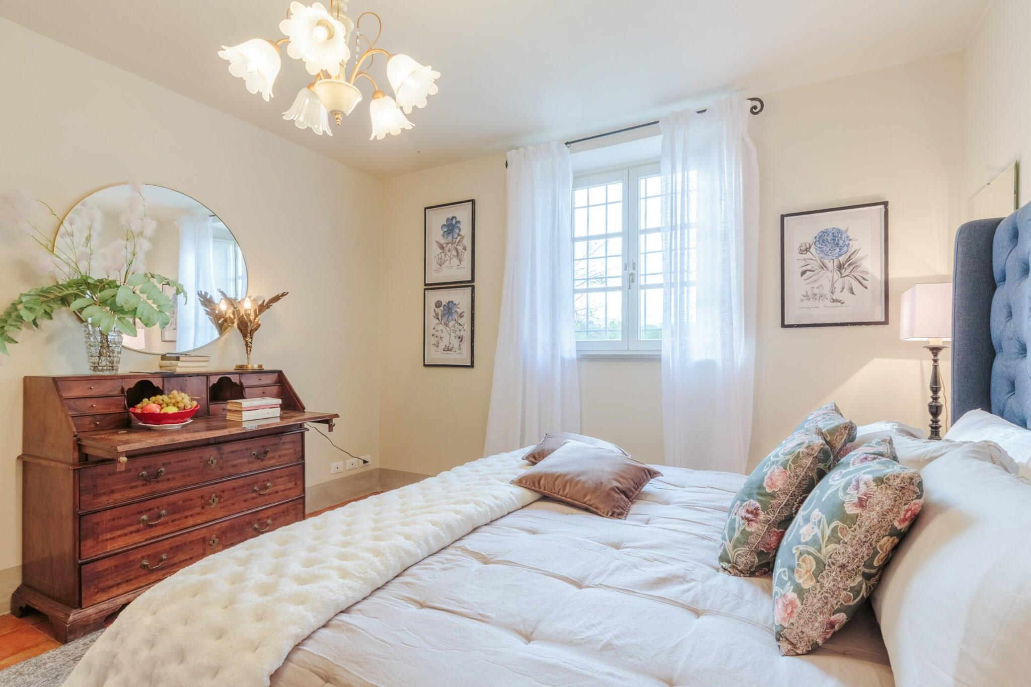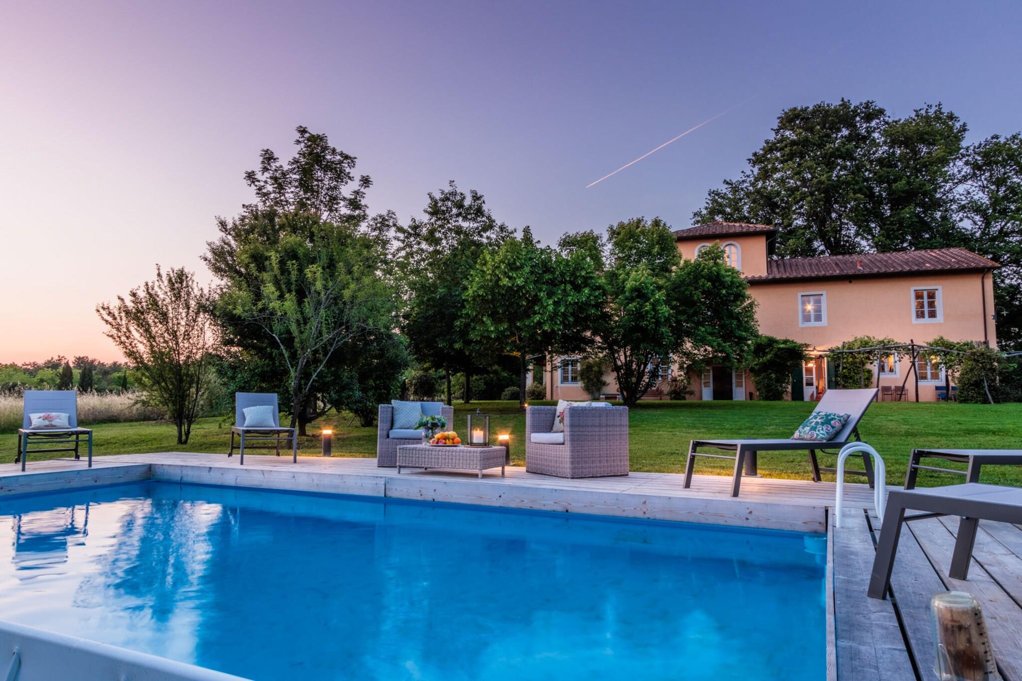 Denna vackert restaurerade villa på landet är en del av en historisk egendom som ägs av en välkänd lokal vinmakare, inbäddad i de böljande kullarna nära Orentano. Omgiven av tusentals hektar orörd skog erbjuder villan en lugn och privat tillflyktsort med privat pool, vidsträckta trädgårdar och panoramautsikt över det toskanska landskapet. Det 300 m² stora huset har fyra rymliga sovrum och flera vardagsrum, med bekväm plats för upp till 8 gäster. Bottenvåningen har ett stort kök, matsal, mysigt vardagsrum med öppen spis och ett badrum. På övervåningen hittar du en mastersvit med eget badrum, ytterligare två sovrum och två badrum. Ett fjärde sovrum ligger på översta våningen. Utomhuslivet är en höjdpunkt här, med en stor veranda för måltider utomhus, en skuggig lounge och en terrass vid poolen som är perfekt för att koppla av med ett glas vin. Villan har ett idealiskt läge för att utforska Toscana och ligger inom bekvämt räckhåll från Lucca, Pisa, Florens, San Gimignano och Cinque Terre. Den närliggande byn Orentano erbjuder restauranger, pizzerior och butiker, medan den större staden Altopascio bara ligger en kort bilresa bort. Oavsett om du njuter av den lugna omgivningen, utforskar närliggande historiska städer eller njuter av lokal mat och vin, erbjuder denna villa en oförglömlig toskansk upplevelse. Obs: Turistskatt ska betalas på boendet.