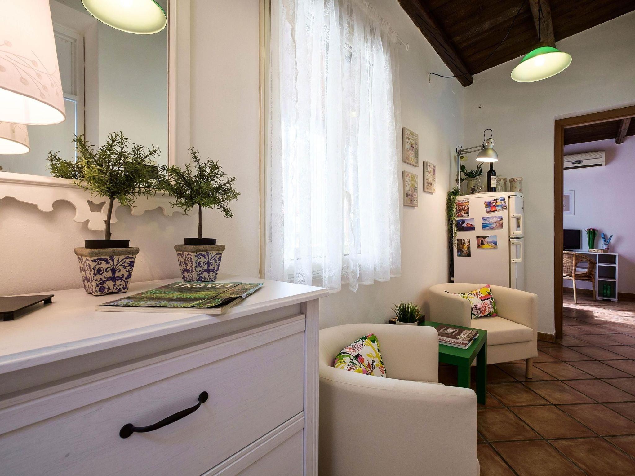 Inside, the flat consists of a beautiful bedroom with characteristic wooden beams, bright and air-conditioned, well furnished with a desk, armchair, wardrobe, flat-screen TV and a large bed with an orthopaedic mattress. A bright and well-furnished relaxation area with armchairs and a coffee table, a cosy, well-equipped kitchen and a new bathroom with a window. In addition, it has a beautiful terrace overlooking the main street, equipped with a sofa, table and chairs where you can relax or eat. The flat enjoys good environmental insulation that makes it suitable for relaxation. The flat is equipped with free Internet WI-FI. Utilities, Internet WI-FI, bed linen, bath towels, included in the rental price. Transfer service from the airport to the flat and vice versa for a fee. Fully equipped kitchen: including oil, salt, sugar, coffee, etc..