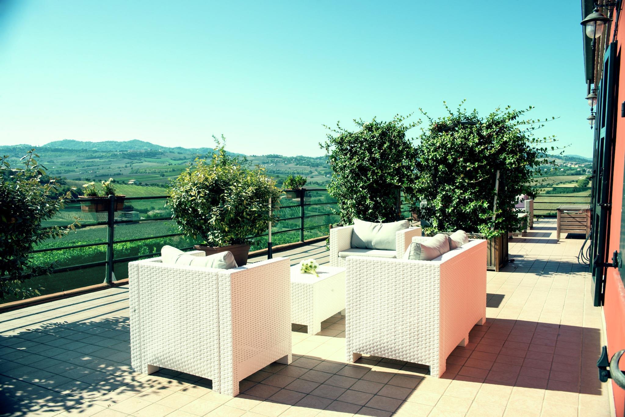 På första våningen i ett lugnt agriturismo i Passano di Coriano ligger denna inbjudande röda lägenhet en fristad för dem som söker lugn och ro. Omgiven av frodiga vingårdar och omsorgsfullt möblerad, erbjuder den en perfekt blandning av rustik charm och komfort. Gästerna kan varva ner på den gemensamma takterrassen, njuta av ett dopp i poolen eller njuta av lokalt vin från vingårdarna som omger fastigheten. Den fridfulla trädgården och den avkopplande atmosfären gör denna vistelse idealisk för par eller små familjer som vill koppla av och ladda batterierna. Bara 2 km från Corianos historiska centrum och bara 9 km från Ricciones gyllene stränder, erbjuder lägenheten bekväm tillgång till det bästa av Emilia-Romagna. Kulturälskare kommer att uppskatta närheten till museet La Storia Del Sic, tillägnat motorcykellegenden Marco Simoncelli. För familjeutflykter ligger Oltremare och Aquafan – två av Italiens främsta nöjesparker – bara 8 km bort. De omgivande kullarna och landsbygden erbjuder perfekta möjligheter till cykling och promenader, medan den biologiska parken Valle delle Lepri bara ligger en kort promenad bort för en smak av den lokala biologiska mångfalden. Corianos charm i byn sträcker sig även till dess kulinariska utbud. Njut av traditionella rätter på närliggande restauranger som Trattoria da Povero, känd för sin hemlagade pasta och lokala viner. En kort bilresa till Riccione öppnar upp en värld av restauranger vid havet, från färska adriatiska skaldjur på Ristorante Canasta till klassisk piadina på lokala strandkaféer. Med lägenheten belägen på en vingård fulländar ett glas lokalt rött vin på terrassen upplevelsen. Oavsett om du smuttar på vin, promenerar eller provsmakar, är denna plats en sann italiensk tillflyktsort.