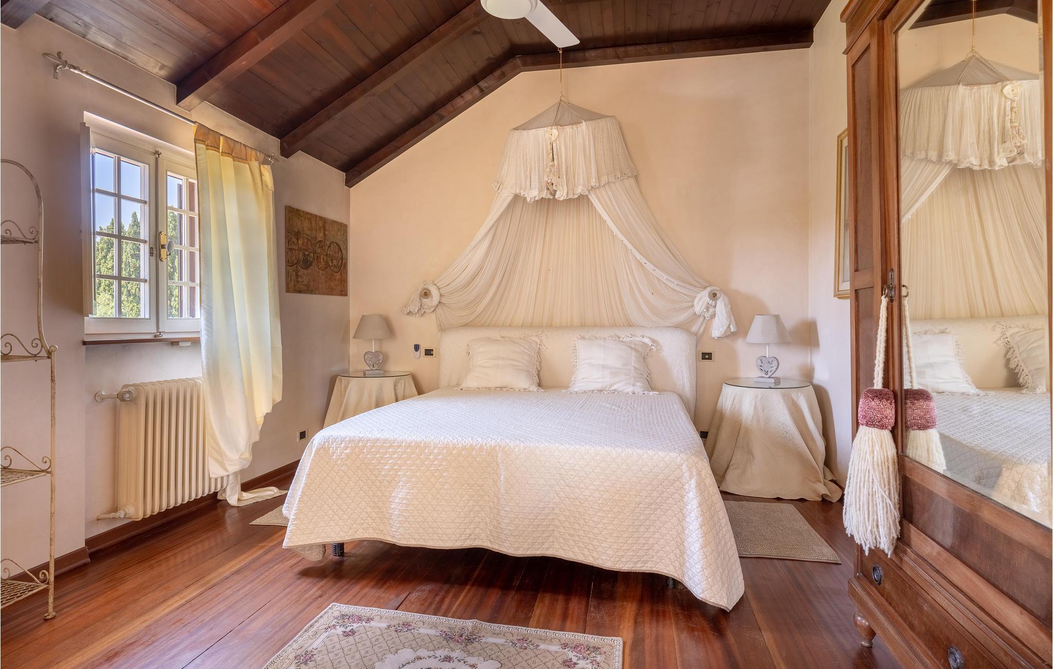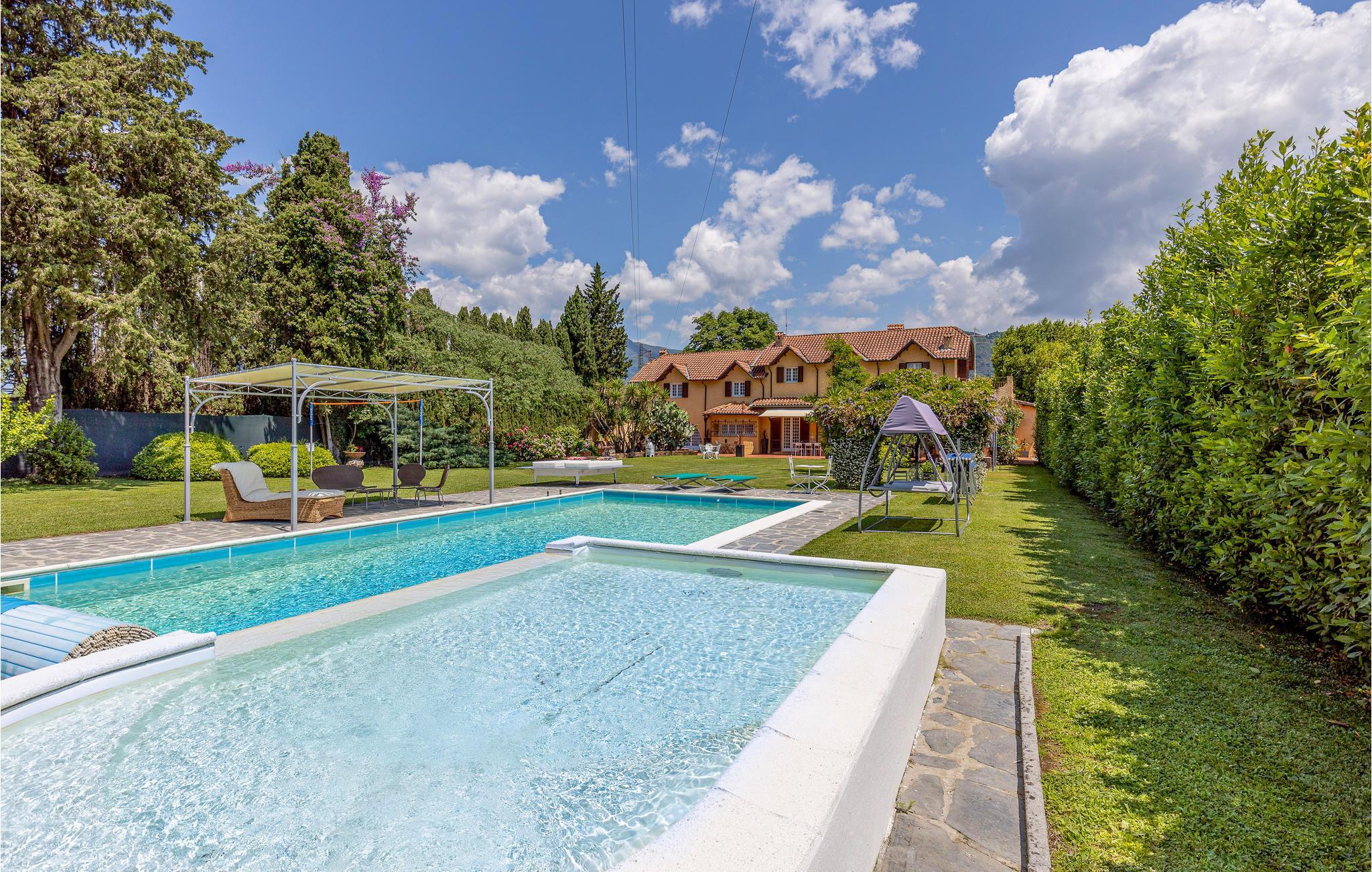 Denna rymliga semestervilla med privat pool och intilliggande barnpool är fördelad på två plan och har en trädgårdstomt på ca 3000 m2, som är helt inhägnad och sträcker sig över husets fyra sidor. Utomhusområdet är utrustat med en vedeldad spis, grill, bord, stolar och parasoll och är perfekt för uteservering. Boendet ligger i Piano di Mommio, men bara 5 km från Versilias stränder. Andra avstånd: 4 km Lido di Camaiore och Viareggio, 8 km Pietrasanta, 14 km Forte dei Marmi, 25 km Lucca, 27 km Pisa, 72 km Cinque Terre , 93 km da Florence. Andra avstånd och tjänster: 0,7 km restaurang, 0,8 km ridstall, 1 km affärer av alla slag och tennisbana, 2 km stormarknad, 4,7 km stränder, både gratis och med etablissemang (Viareggio och Lido di Camaiore), 14 km golfbana, 18 km termiska bad. Utsikt över Apuanska alperna från både huset och tomten. Hela fastigheten består av en inhägnad tomt på cirka 5000 m2, där det också finns stugan till husets ägare, med vilken gästerna bara delar uppfarten.