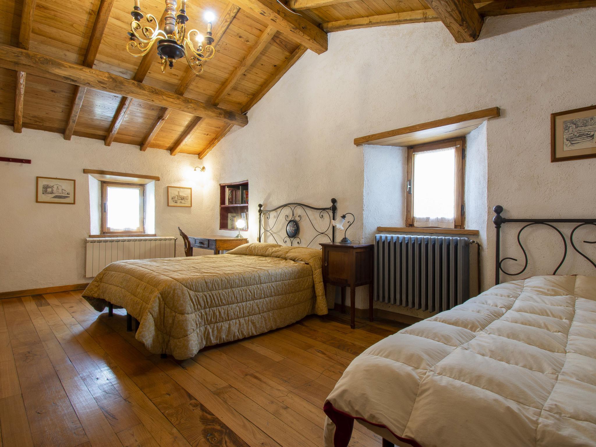 "I 3 Faggi", 4-room house 160 m2. Comfortable and rustic furnishings: 1 double bedroom with open-hearth fireplace. Open kitchen (4 hot plates, oven, dishwasher, microwave) with open-hearth fireplace, dining table and digital TV. Bath/shower. Wood heating. Upper floor: open living room with digital TV. 1 double bedroom. 1 double bedroom with 1 bed. Bath/shower/WC. Wooden floors. Comfortable furnishings in the country house style. Terrace furniture, balcony furniture, barbecue, deck chairs. Panoramic view of the mountains. Facilities: washing machine, iron, mosquito net, baby cot for up to 2 year olds, hair dryer, logs (extra). Internet (WiFi, free). Please note: maximum 1 pet/ dog allowed. Smoke alarm, fire extinguisher. IT047024C2MGAQ8RSS