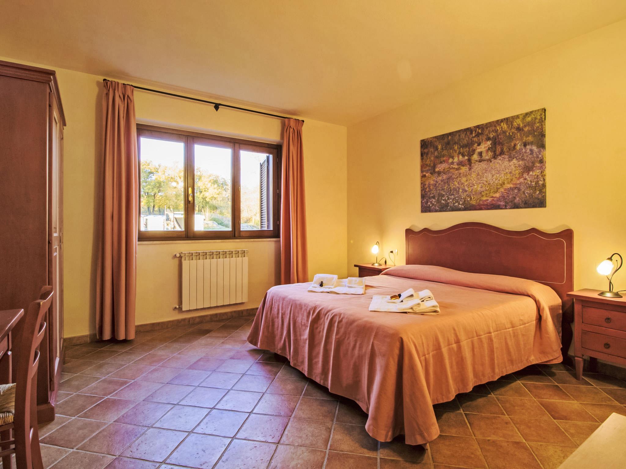 Thermal village with 30 apartments and 10 villas, 2 swimming pools including 1 thermal water from natural springs at 37°C (350m2, irregular shape) open all year round and 1 children´s pool. Every unit with private parasols and loungers in the relaxation area of the pool. Wellness center with face and body treatments and various packages, to be booked on site. Life and bike trail, partner riding school, food and wine tours. The structure develops around a millenary parish church. Beautiful resort "Thermae", 460 m a.s.l.. 10 houses in the residence. 30 apartments in the residence. 3 km from the centre of Sorano, 7 km from the centre of Pitigliano, in a sunny position on a slope, 55 km from the sea, in the countryside. For shared use: park 7 ha (fenced), beautiful, well-kept garden, 2 swimming pools (370 m2, seasonal availability: 01.Jan. - 31.Dec.) with internal staircase. Unconventional pool shape. Children's pool, outdoor shower, hot tub, tennis, table tennis, barbecue, children's playground. In the complex: reception, restaurant, bar, WiFi, massage (extra). Relaxation room, sun terrace, laundry, washing machine (for shared use, extra). Linen change weekly. Room cleaning on request (extra). Breakfast and half board on request (extra). Parking at 200 m. Central parking spaces. E-charging station. Grocery 3 km, supermarket 7 km, restaurant 3 km, bus stop 300 m, sandy beach 55 km, bathing lake "Bolsena" 25 km. Riding stable 800 m. Nearby attractions: Grotte Di Castro 22 km, Saturnia 28 km, Capalbio 52 km, Monte Argentario 45 km. Well-known lakes can easily be reached: Bolsena 25 km. Please note: car recommended. Suitable for families. Loading and unloading of baggage is possible at the holiday house. The complex has night security. Residence with electric gates. The photograph shows a typical example. Obligation to wear bathing caps.