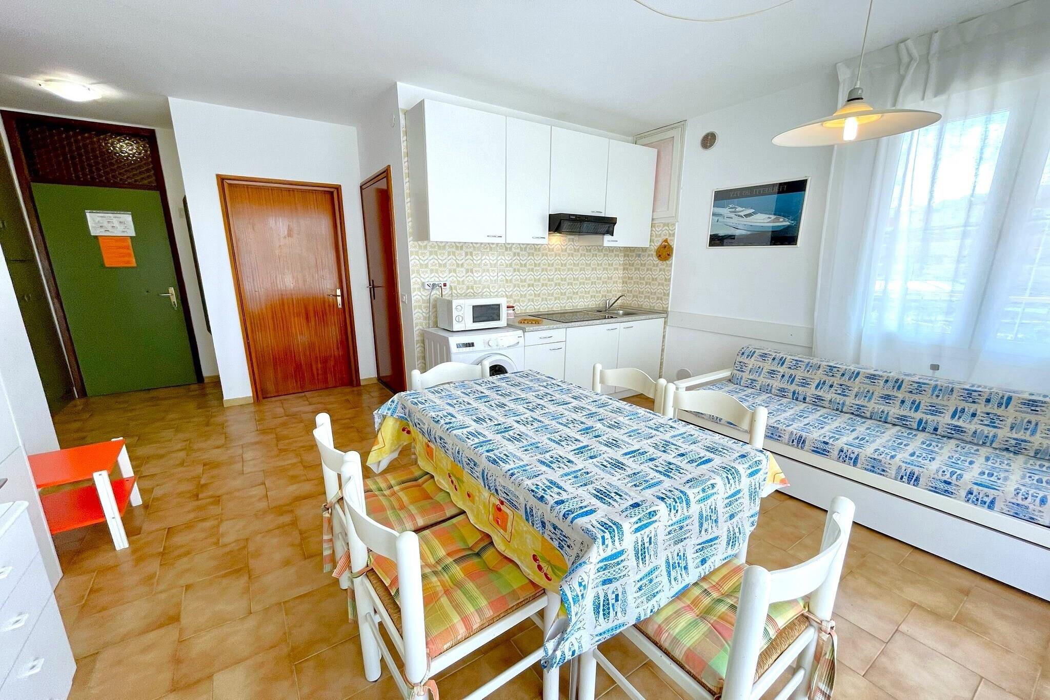 Välkommen till din mysiga tillflyktsort på 5:e våningen, idealiskt beläget i den pittoreska kuststaden Porto Santa Margherita. Denna förtjusande lägenhet är perfekt för par, små familjer eller vänner som söker en avkopplande semester vid havet. Det ljusa och luftiga vardagsrummet har en bekväm dubbel bäddsoffa och en TV, vilket skapar ett välkomnande utrymme att varva ner på. Samlas runt matbordet för måltider och samtal och njut av den inbjudande sittgruppen efter en dag av utforskning. Det välutrustade öppna köket ståtar med moderna bekvämligheter, inklusive en spis, mikrovågsugn, kyl-frys och tvättställ, vilket gör måltidsberedning bekväm oavsett om du piska ihop en snabb frukost eller en komplett middag. Dra dig tillbaka till det mysiga sovrummet, som inkluderar en dubbelsäng för vilsamma nätter och en enkel bäddsoffa för extra flexibilitet. Det moderna badrummet har en uppfriskande dusch, handfat, toalett och bidé, vilket garanterar bekvämlighet under din vistelse. Gå ut på din privata terrass för att smutta på ditt morgonkaffe eller njut av kvällssolnedgångarna medan du njuter av de vackra omgivningarna. Lägenheten har också ytterligare bekvämligheter, inklusive delad utomhusparkering och en uppfriskande pool öppen från juni till september, perfekt för att svalka dig under varma sommardagar. Denna lägenhet ligger i Porto Santa Margherita, bara en kort promenad från fantastiska stränder och kristallklart vatten. Utforska närliggande attraktioner, inklusive charmiga kaféer vid havet, lokala butiker och utsökta matställen. Friluftsentusiaster kommer att uppskatta närheten till natursköna vandringsleder och vackra naturplatser. Denna förtjusande lägenhet på 5:e våningen erbjuder både komfort och bekvämlighet, vilket gör den till den perfekta basen för ditt kustäventyr.