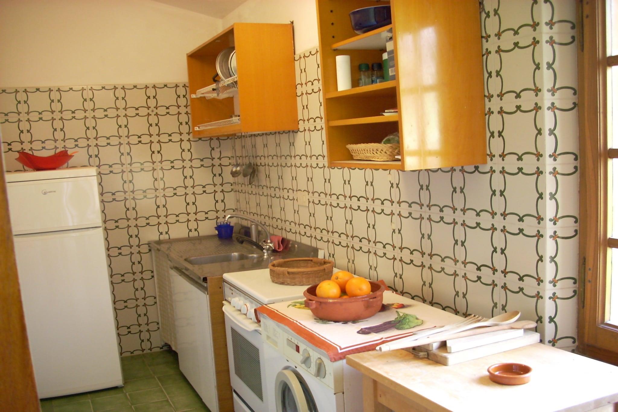 Bottenvåningen: (öppet kök(spis(Spis med 4 kokplattor), ugn, diskmaskin, kyl och frys), ardags- och matrum(2x Bäddsoffa 1 pers., TV(digital)), sovrum(våningssäng), sovrum(2x enkelsäng), badrum(badkar med dusch, handfat, toalett , bidé, tvättmaskin), 2x terrass) carport, dusch(utanför), trädgård(delas med andra gäster , inhägnad), trädgårdsmöbler, grill
