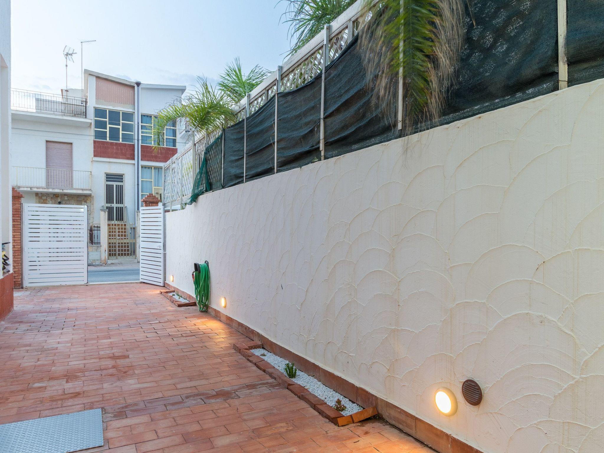 In front of the terrace, on the sand, is a sandy garden of succulent plants and flower beds.
