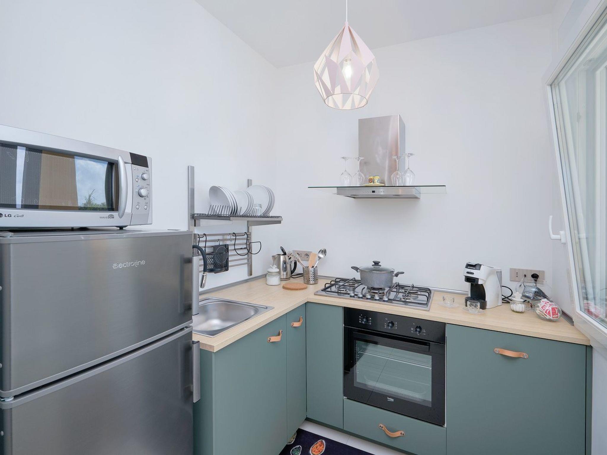 The kitchen is complete with fridge, freezer, dishwasher, electric oven and microwave.