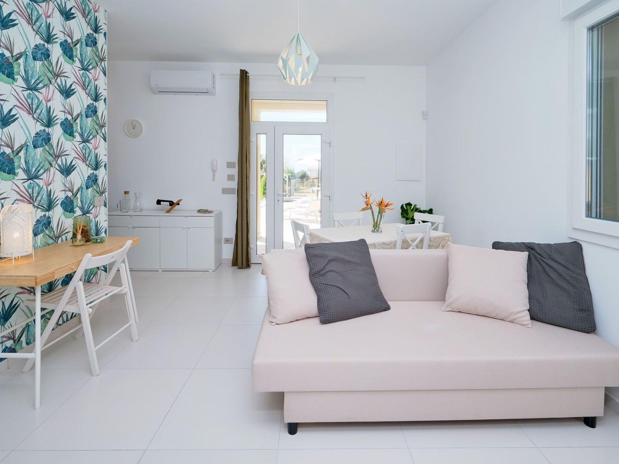 The living room, furnished with a dining table, sofa bed (2 places) and TV, overlooks the terrace and the swimming pool.