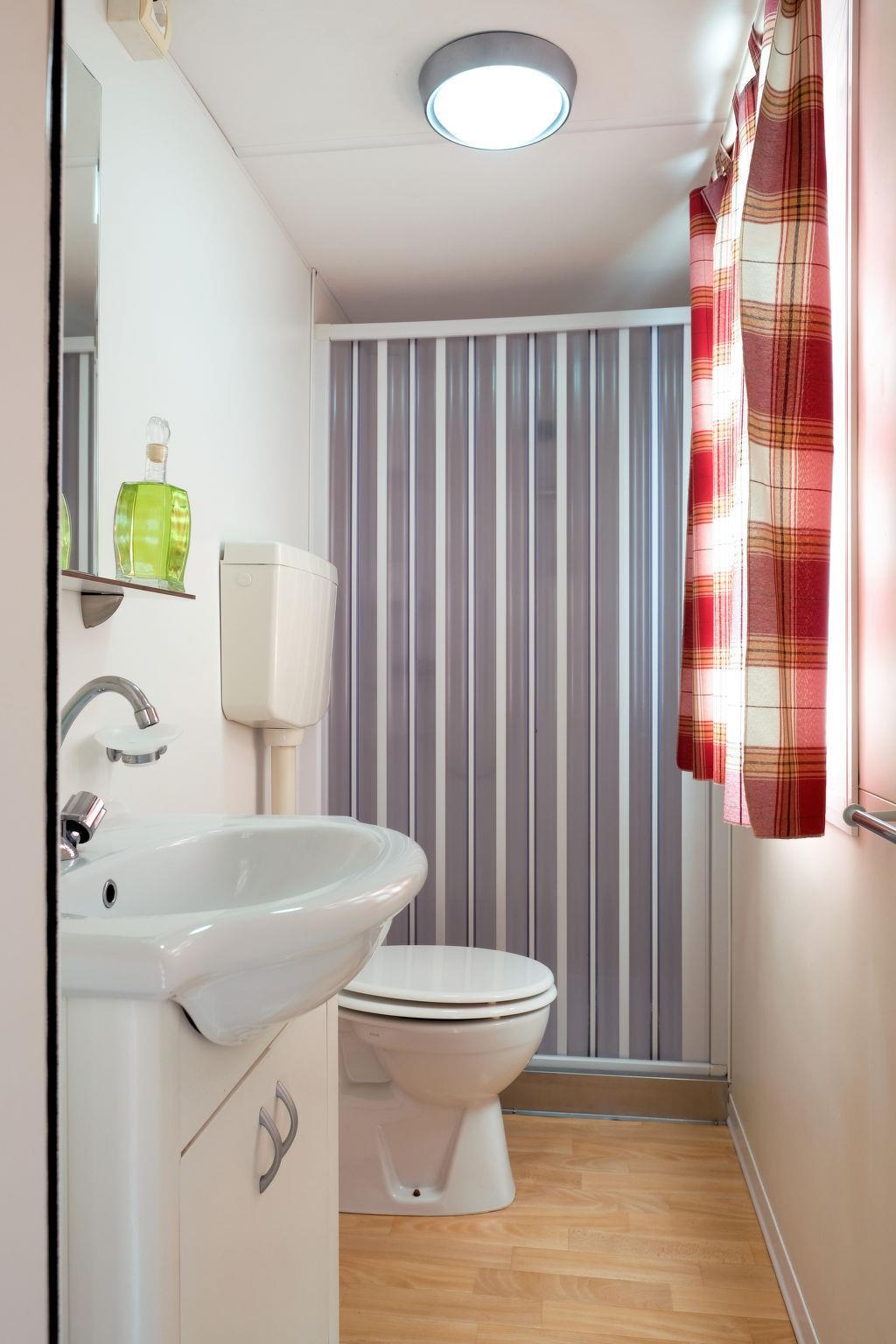 "Happy Easy", 3-room mobile home 25 m2. Object suitable for 4 adults + 1 child. Practical furnishings: living/sleeping room with 1 sleeping facility, dining table, electric heating and air conditioning. 1 room with 1 french bed (140 cm, length 190 cm). 1 room with 2 beds (70 cm, length 190 cm), 1 x 1 bunk beds (65 cm, length 179 cm). Open kitchen (4 hot plates). Shower/WC. Air-conditioning (extra). Terrace partly roofed. Terrace furniture, electric barbecue (portable), deck chairs (2). Facilities: mosquito net. Parking (1 car). Please note: non-smokers only. Maximum 1 small pet/ dog allowed. IT099013B1YCJCMG23