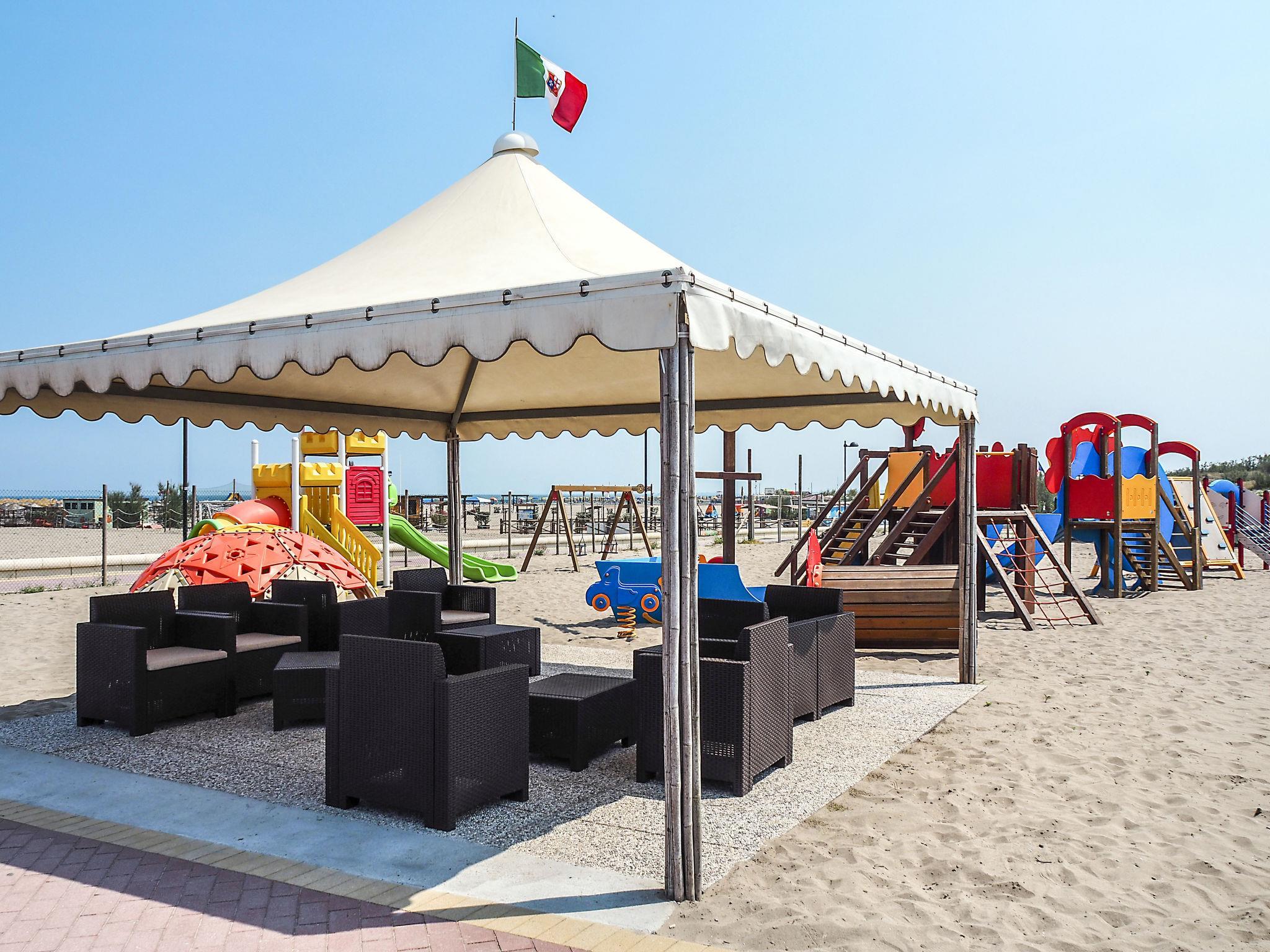 Large, child friendly holiday village "Rosapineta Sud". 260 houses in the resort. 400 m from the centre of Rosolina Mare, 22 km from the centre of Chioggia, 70 km from the centre of Venezia, 100 m from the sea, 100 m from the beach, direct access to the beach. For shared use: property 6 ha (fenced) with plants and trees, 2 swimming pools (25 x 11 m, 250 m2, seasonal availability: 23.May. - 12.Sep.). Children's pool, slide, outdoor shower, hot tub, table tennis, beach volleyball, barbecue, children's playground. In the complex: reception, restaurant, WiFi, fitness room, table tennis, shopping facilities, kiosk, washing machine (for shared use, extra), bicycle rental. Half board possible (extra). Parking at the house on the premises. E-charging station. Supermarket 50 m, bus stop "Rosolina" 10 km. Golf course (18 hole) 27 km. Nearby attractions: Giardino Botanico di Porto Caleri 5 km, Parco Naturale 'Delta del Po', Venezia 70 km. Please note: entertainment. Suitable for families. Obligation to wear bathing caps. Beach service: 2 sun loungers and 1 parasol per bungalow/mobile home are available on the beach throughout the season.