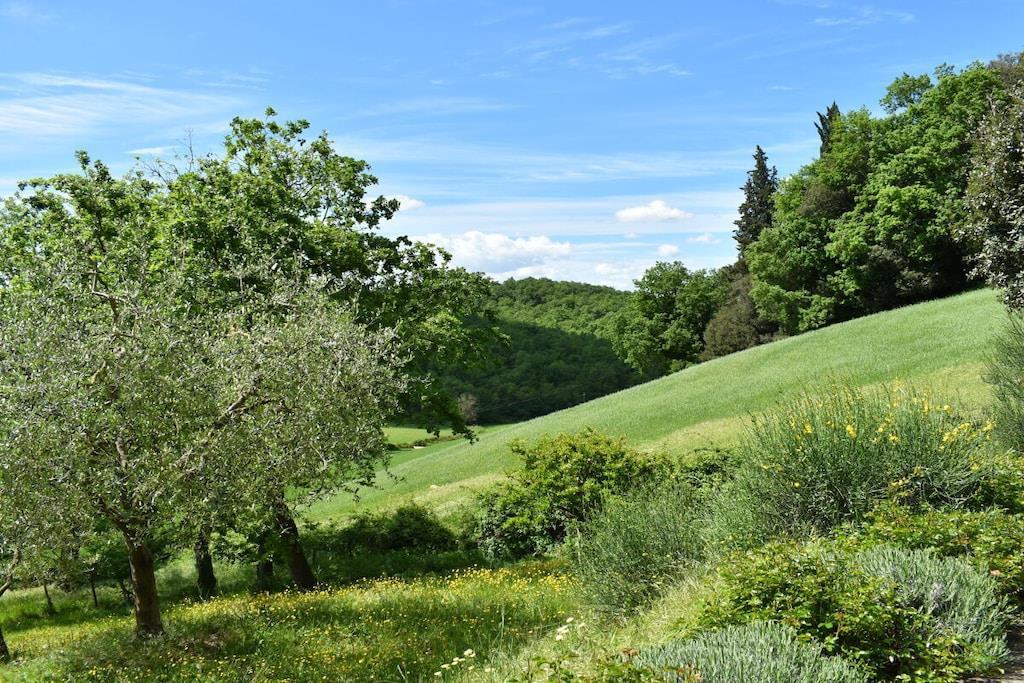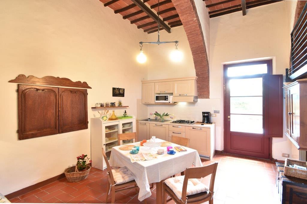 Vackert lantställe från 1700-talet med typisk sienesisk arkitektur. Härifrån kan du nå Chianti-regionen och staden Siena, som erbjuder en mängd kulturella sevärdheter, på bara några minuter (6 km). Närmaste by ligger 3 km bort och har en bar, restaurang och stormarknad. Lägenheten "Guest House" (80 m²), som sträcker sig över två våningar, har en egen ingång via innergården. Huvudrummet på bottenvåningen inkluderar ett vardagsrum med en bäddsoffa för en person, ett kök och en matplats. Härifrån leder en trappa till mezzaninen, som har en enkelsäng. Badrummet är utrustat med dusch. På andra våningen finns ett stort sovrum med en dubbelsäng och en spjälsäng. Taket har typiska sienesiska bjälkar och möblerna är i typisk toskansk stil. Utanför lägenheten finns ett privat område med en pergola, stolar, ett parasoll och ett bord på fastighetens innergård. En stor trädgård med cypresser, ekar, lindar och medelhavsväxter och blommor omger huset. Den 6 x 12 meter stora poolen ligger på en pergolatäckt terrass och erbjuder vacker utsikt över skog och ängar. De omgivande 2 hektar mark är planterad med oliv- och fruktträd. Gården ligger på en höjd av 350 m och har ett mycket soligt läge.