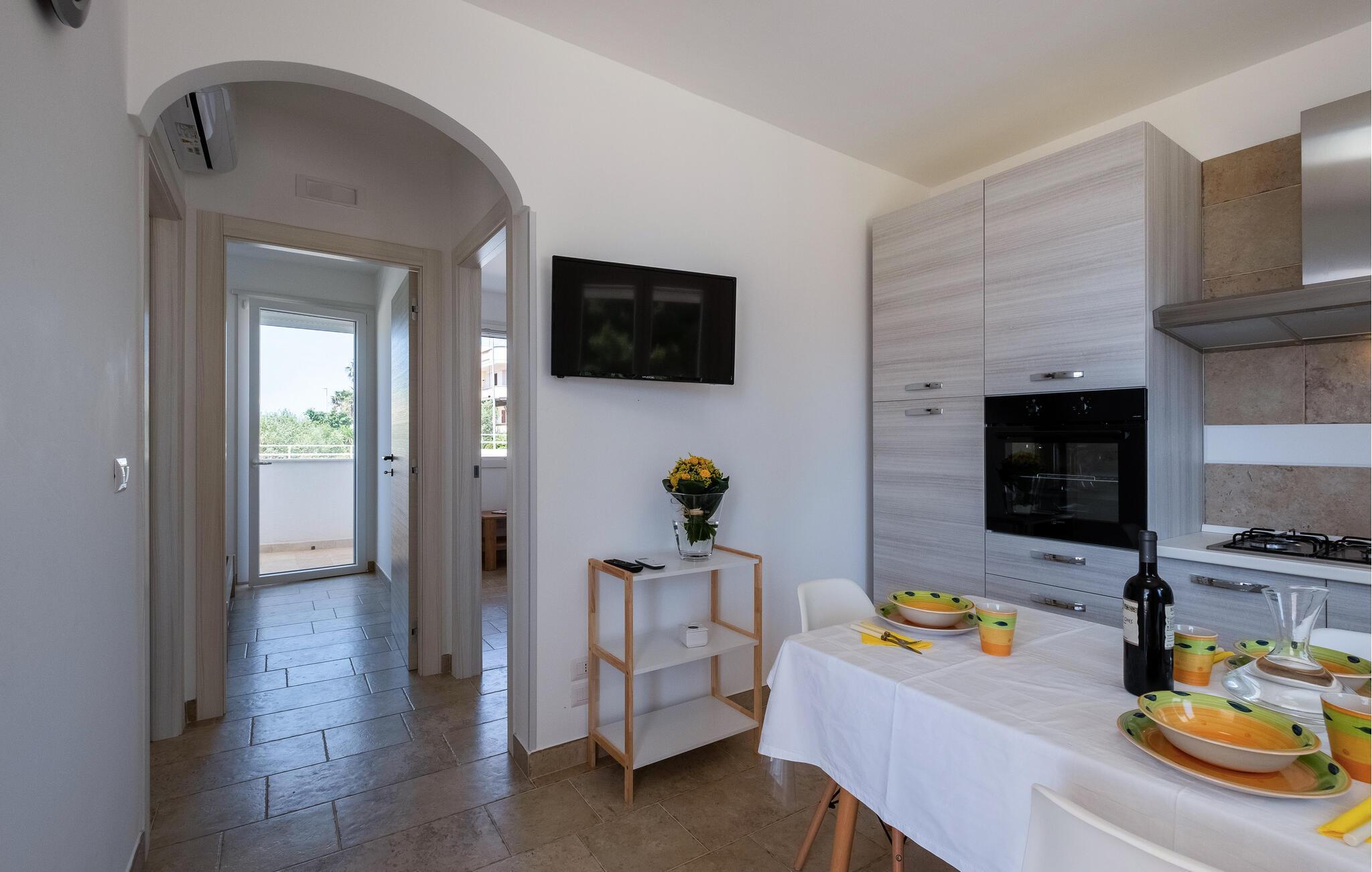 I södra delen av Apulien, i provinsen Lecce, ligger denna moderna, ljusa lägenhet i en lugn och fridfull kustby. Med harmonisk, varm inredning kan du känna dig som hemma och ställa in dig på en utmärkt semester. Idealiskt lämpad för en liten familj kan du förvänta dig komfort och bekymmerslösa dagar.