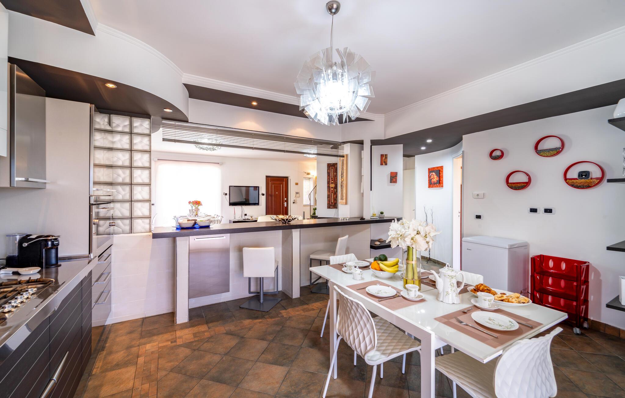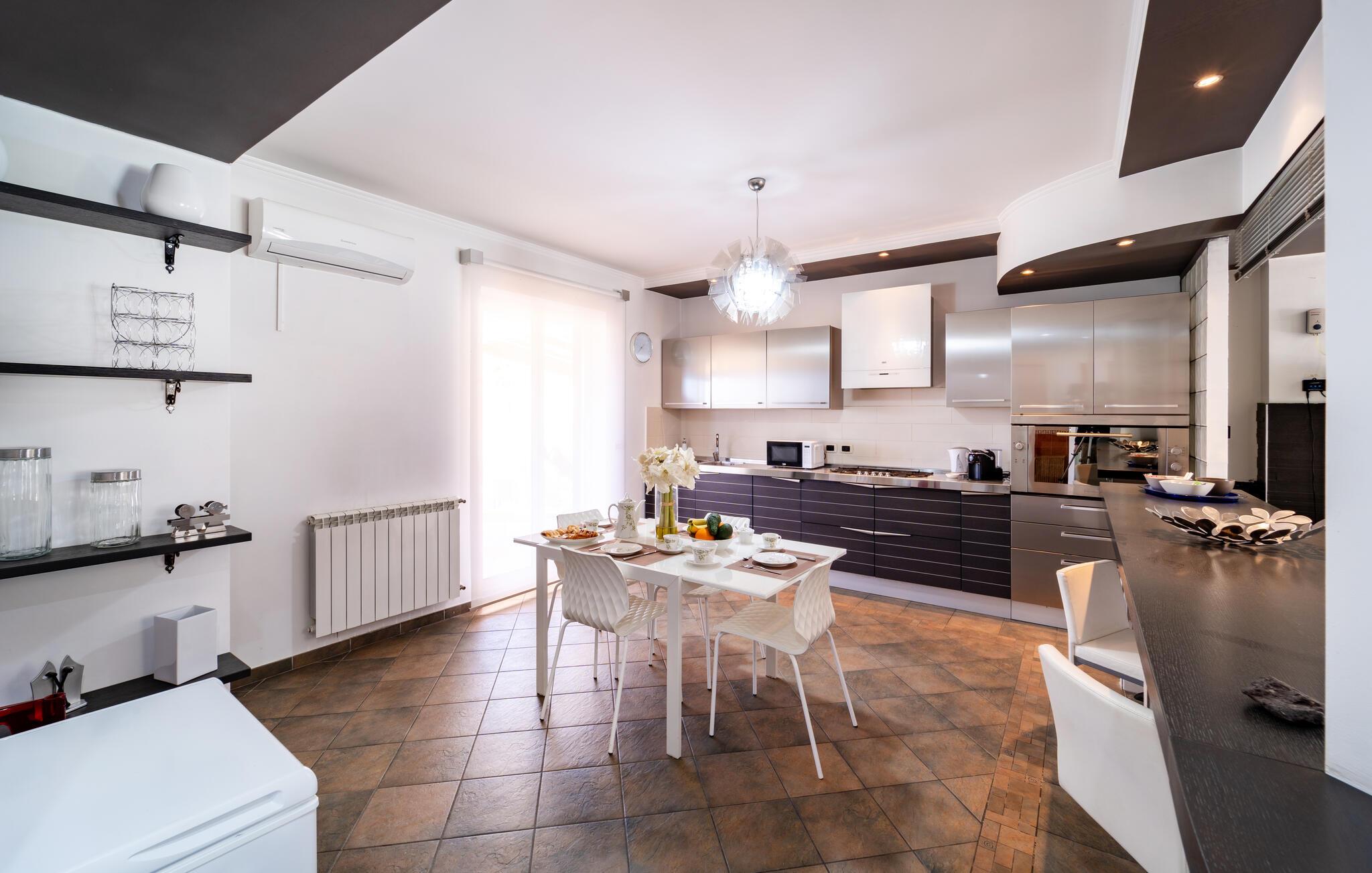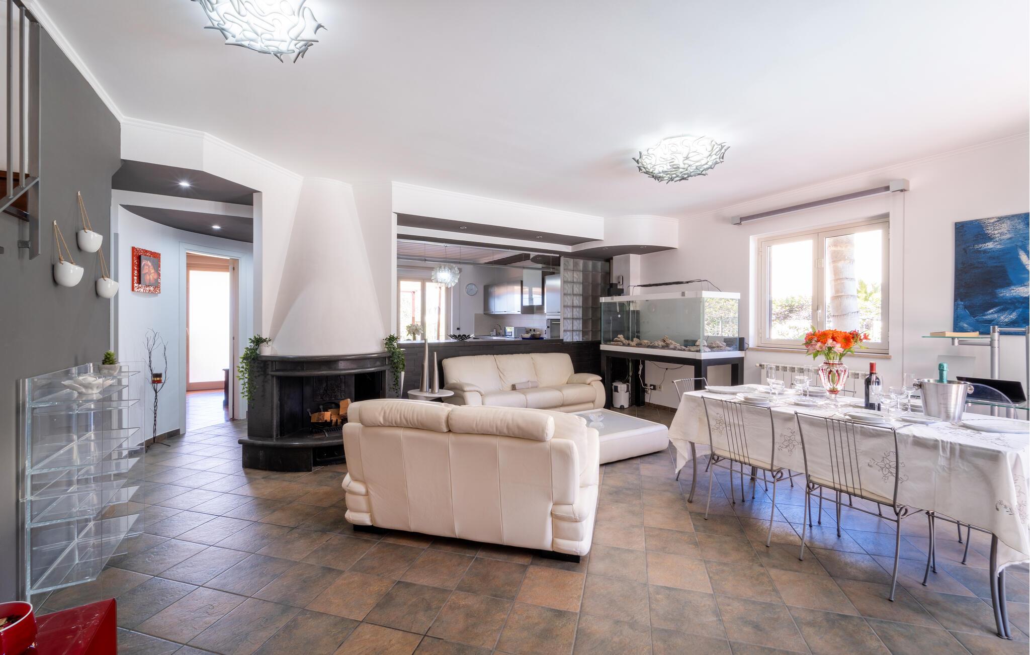 Detta rymliga semesterhus inbjuder dig att njuta av en oförglömlig semester på ett fantastiskt läge. Använd det fullt utrustade köket för att trolla fram regionala specialiteter och njut av måltiderna vid det eleganta matbordet. Koppla av i de bekväma sofforna eller njut av en god bok i ett lugnt hörn av huset - varje ögonblick här känns som ren lyx.