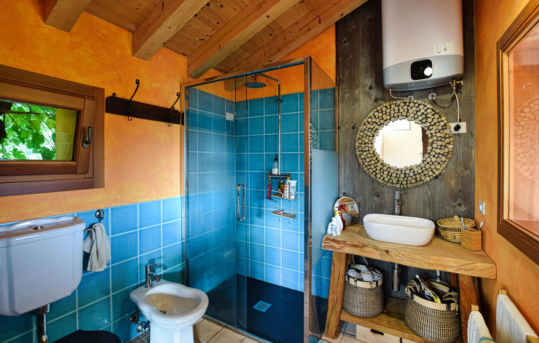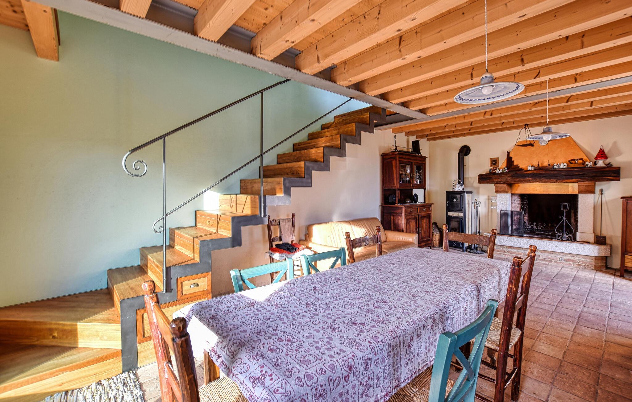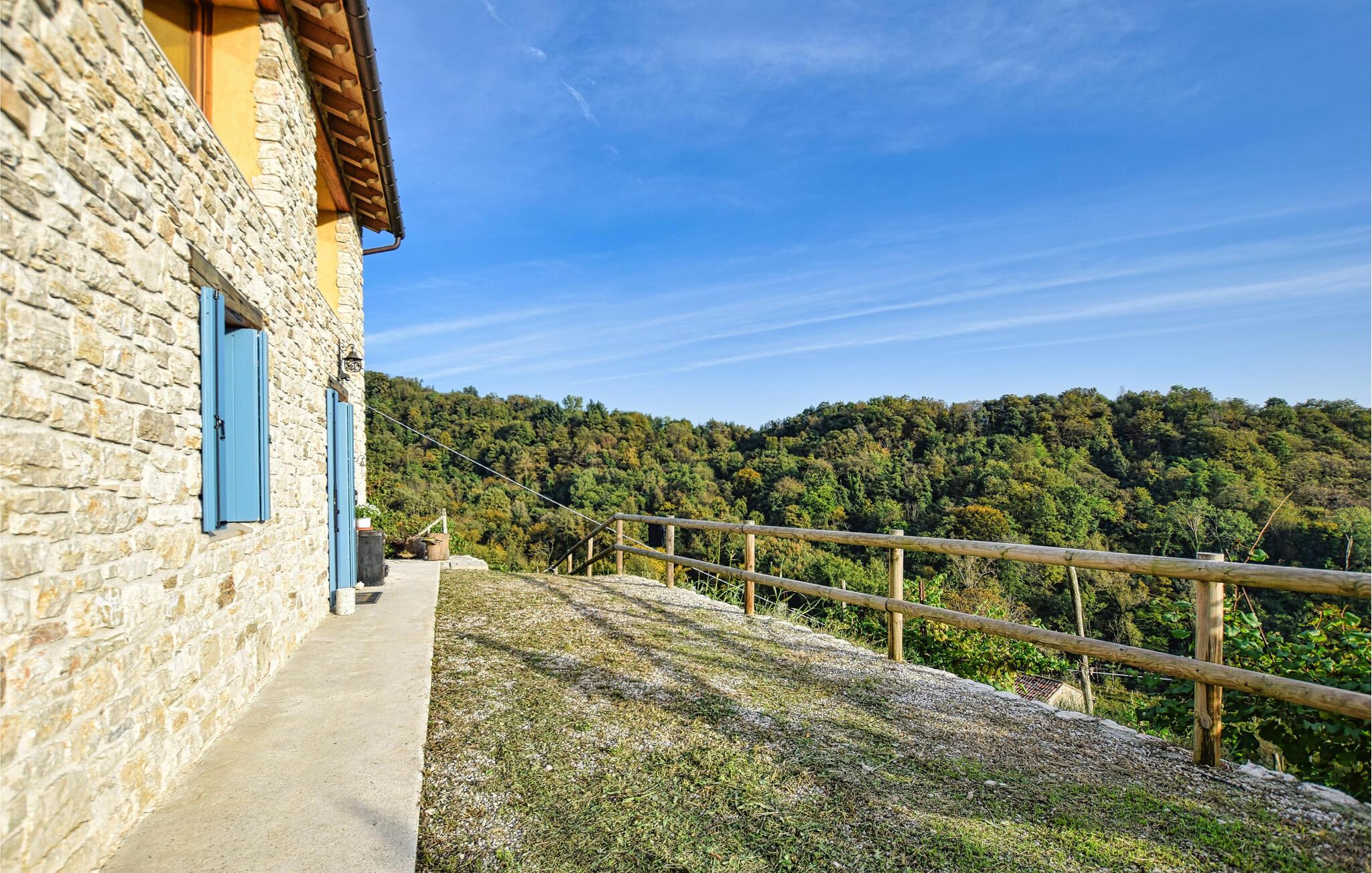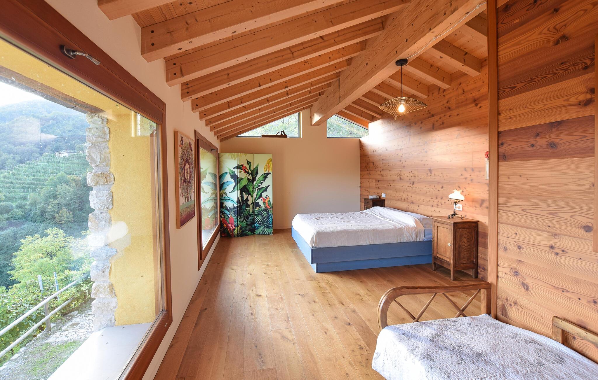 Detta eleganta semesterhus i Miane kombinerar traditionell arkitektur med modern komfort. Stora panoramafönster ger den hisnande utsikten över de omgivande vingårdarna och bergen direkt in i huset. Den öppna planlösningen på två våningar, den varma träfärgen och den öppna spisen skapar en inbjudande och mysig atmosfär. På terrassen framför huset kan du njuta av lugnet, grilla på kvällen och kombinera ett glas lokal Prosecco med den fantastiska utsikten - den perfekta platsen att lämna vardagen bakom sig.