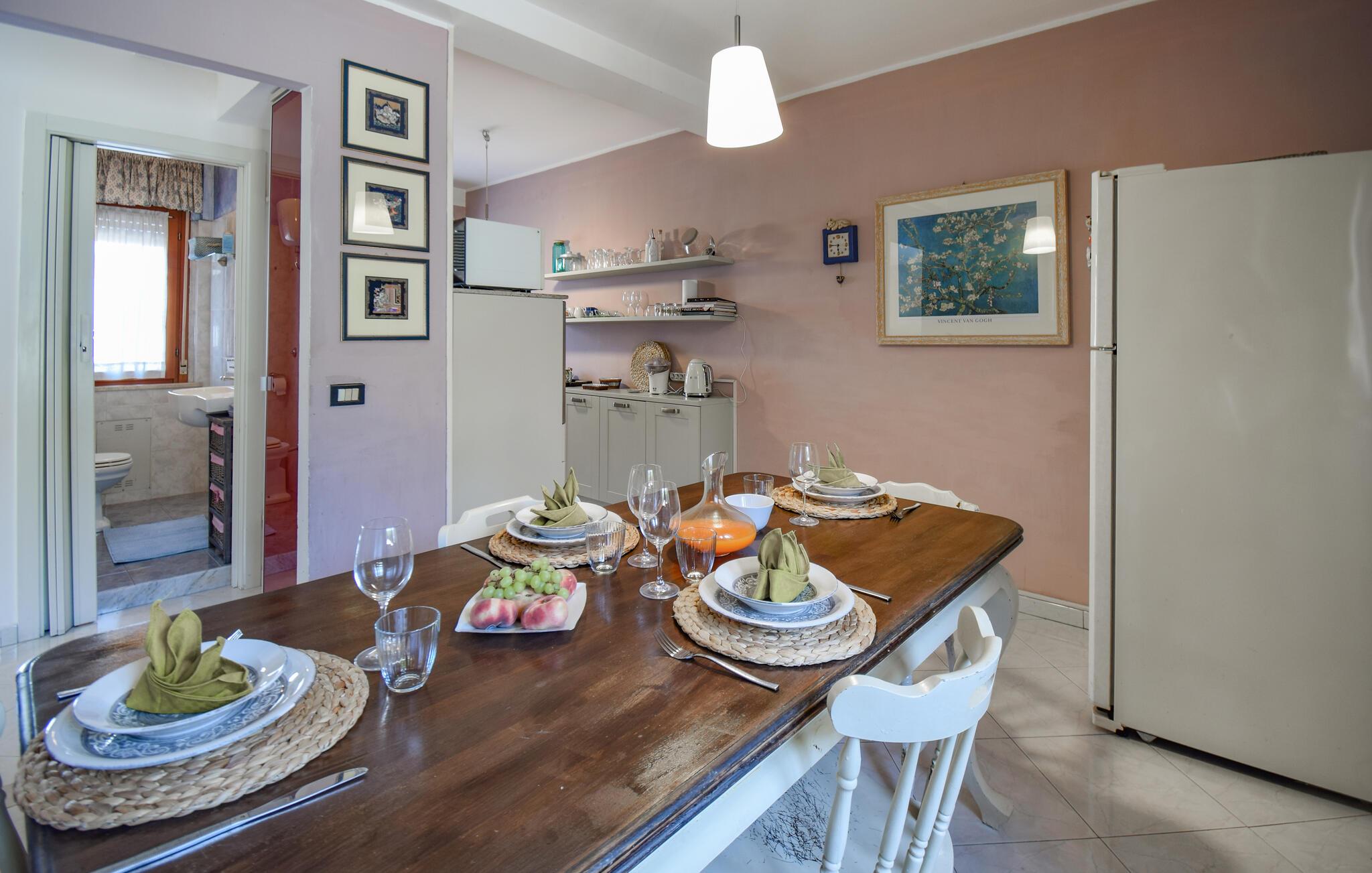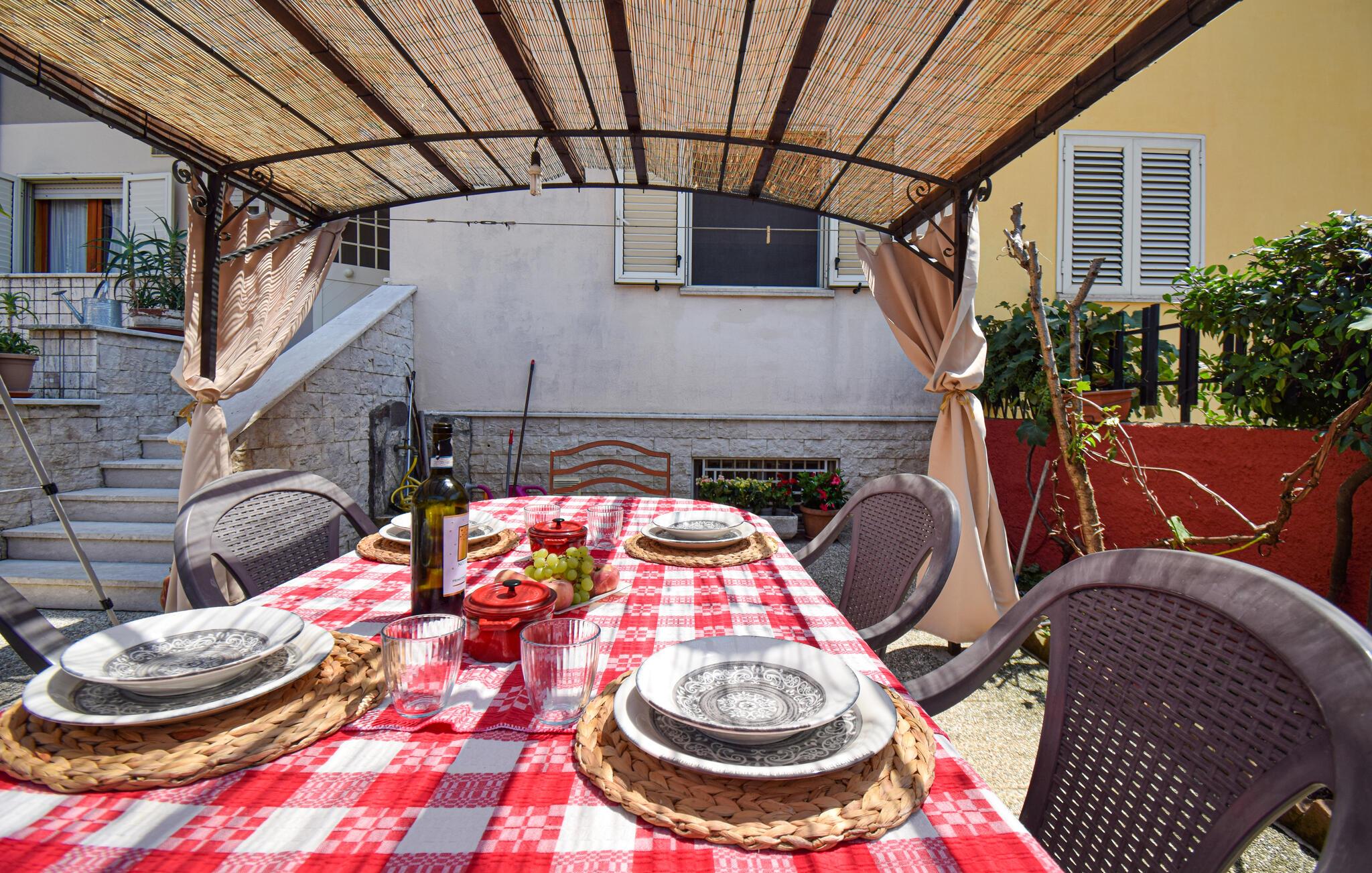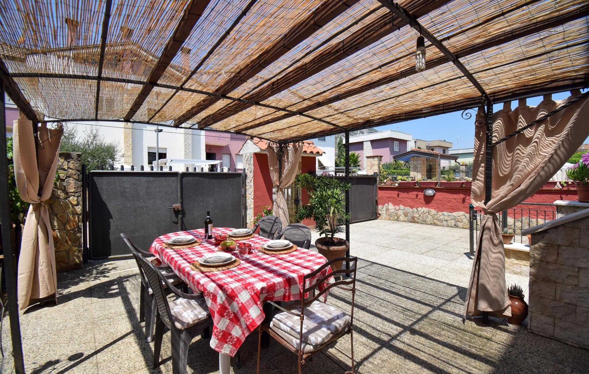 Se fram emot din nästa semester i detta semesterhus, som erbjuder dig en härlig blandning av komfort och autentisk italiensk känsla. Njut av dina måltider utomhus på den mysiga terrassen med sitt skuggiga tak, perfekt för en avslappnad frukost eller en gemytlig middag. Slå dig ner vid matbordet och insup den italienska atmosfären. Efter en händelserik dag kan du koppla av på de bekväma solstolarna i trädgården och njuta av lugnet och tystnaden. Utomhusområdet är också utrustat med en murad grill.