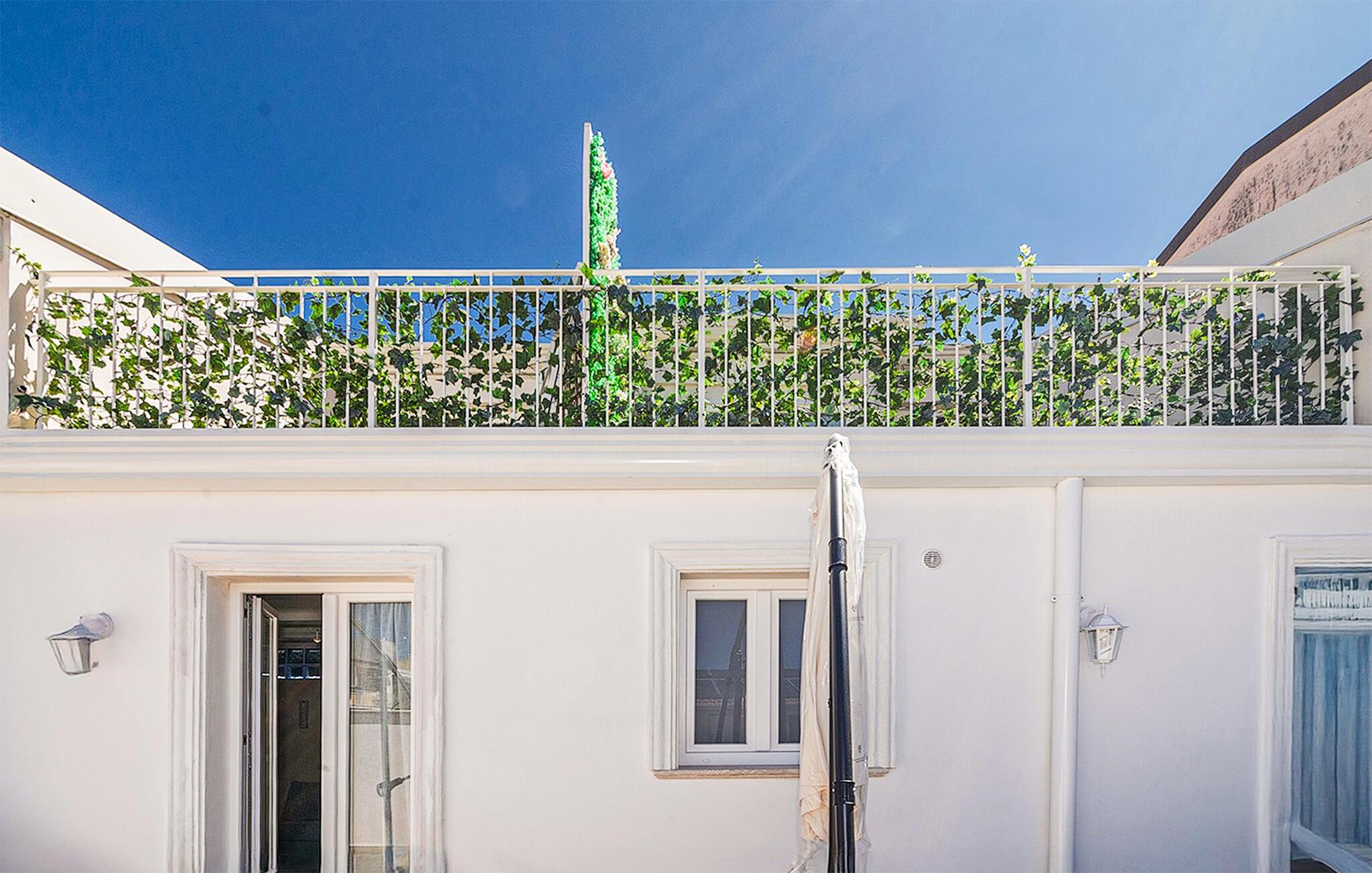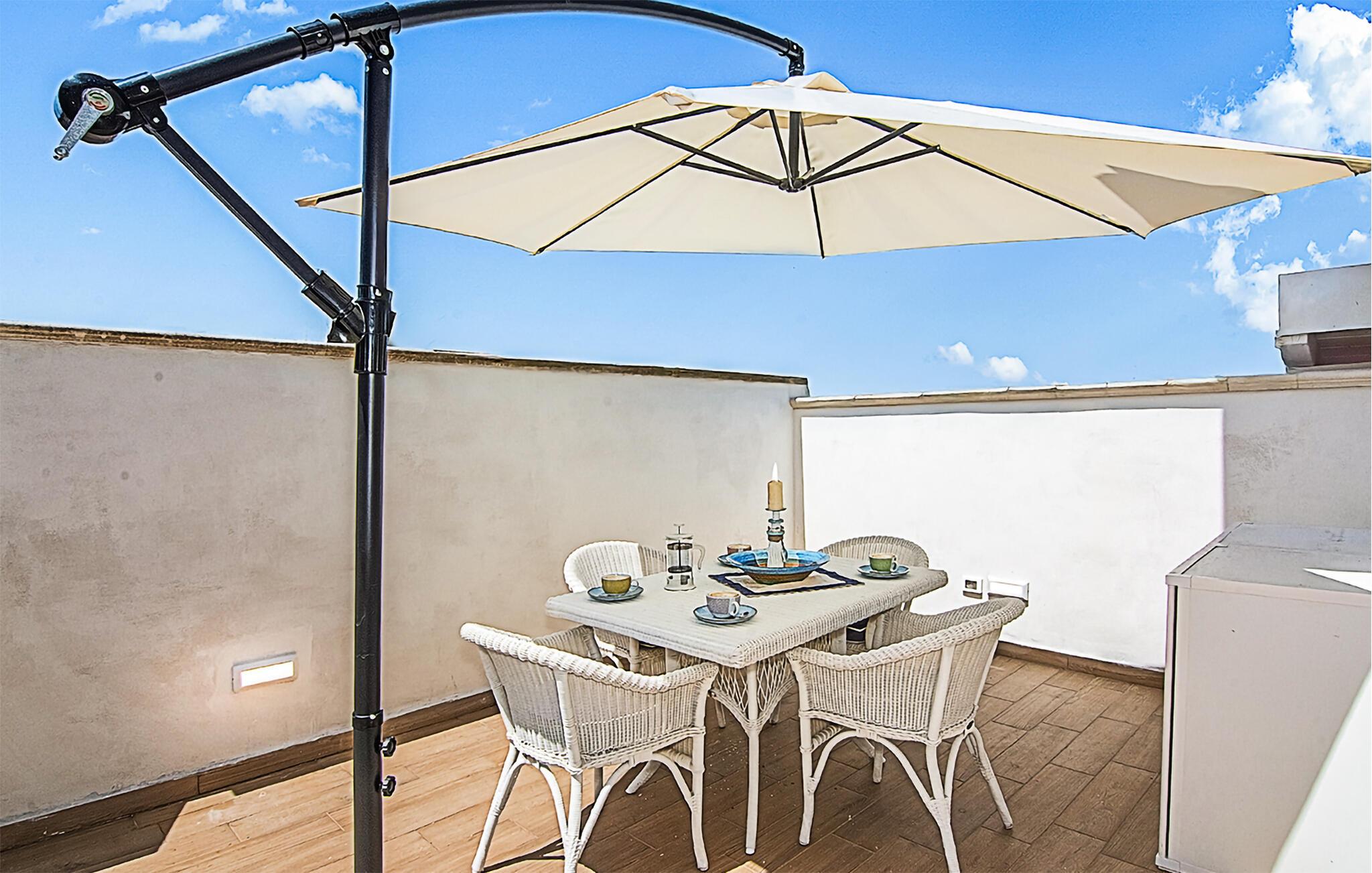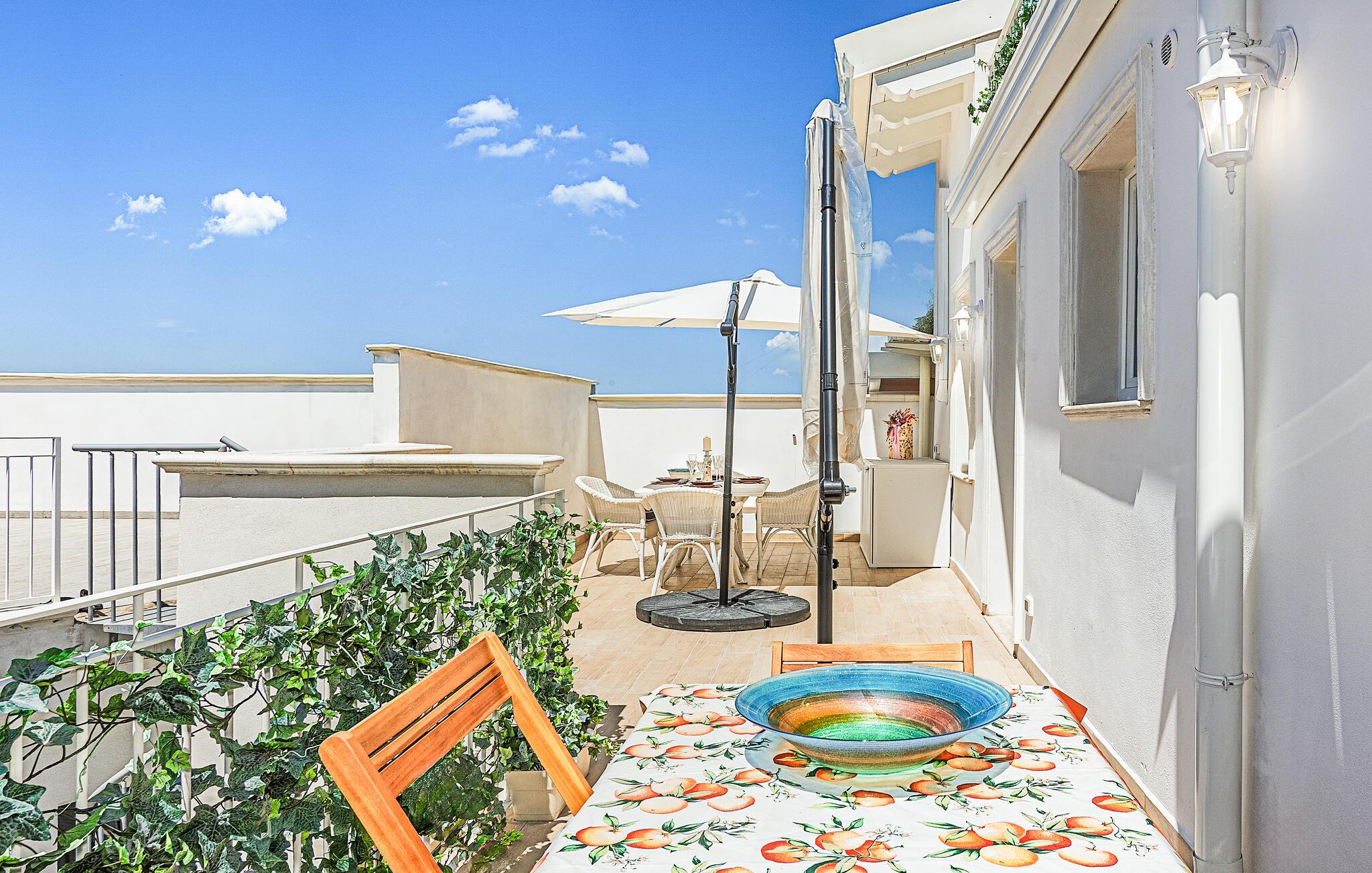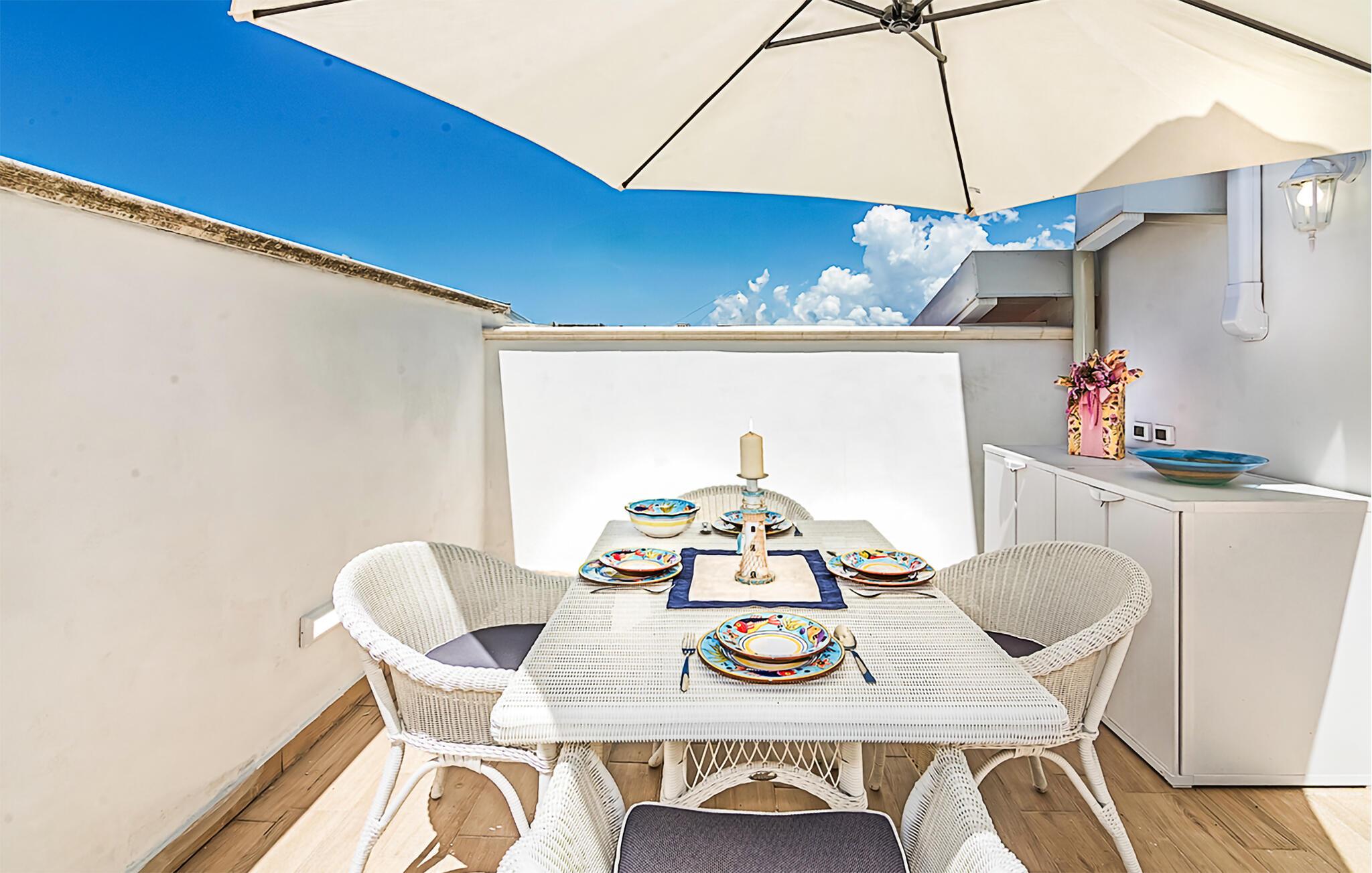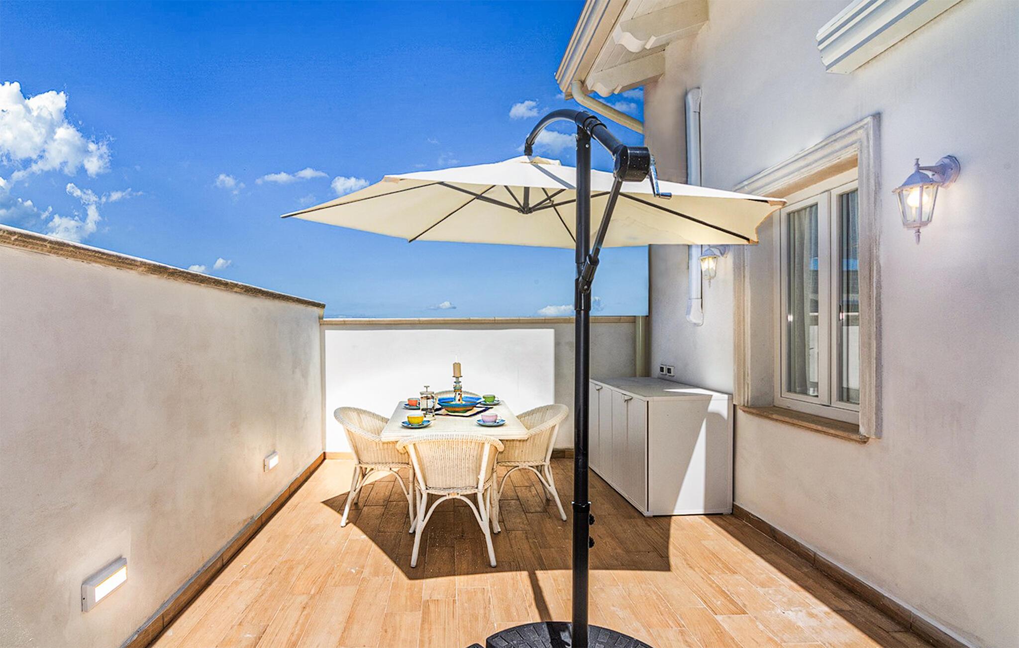 På den vackra terrassen kan du välja att tillbringa trevliga timmar under den blå himlen eller i skuggan av parasollet. Fördjupa dig i semesterläsning och njut av medelhavsstämningen med ett glas vin.