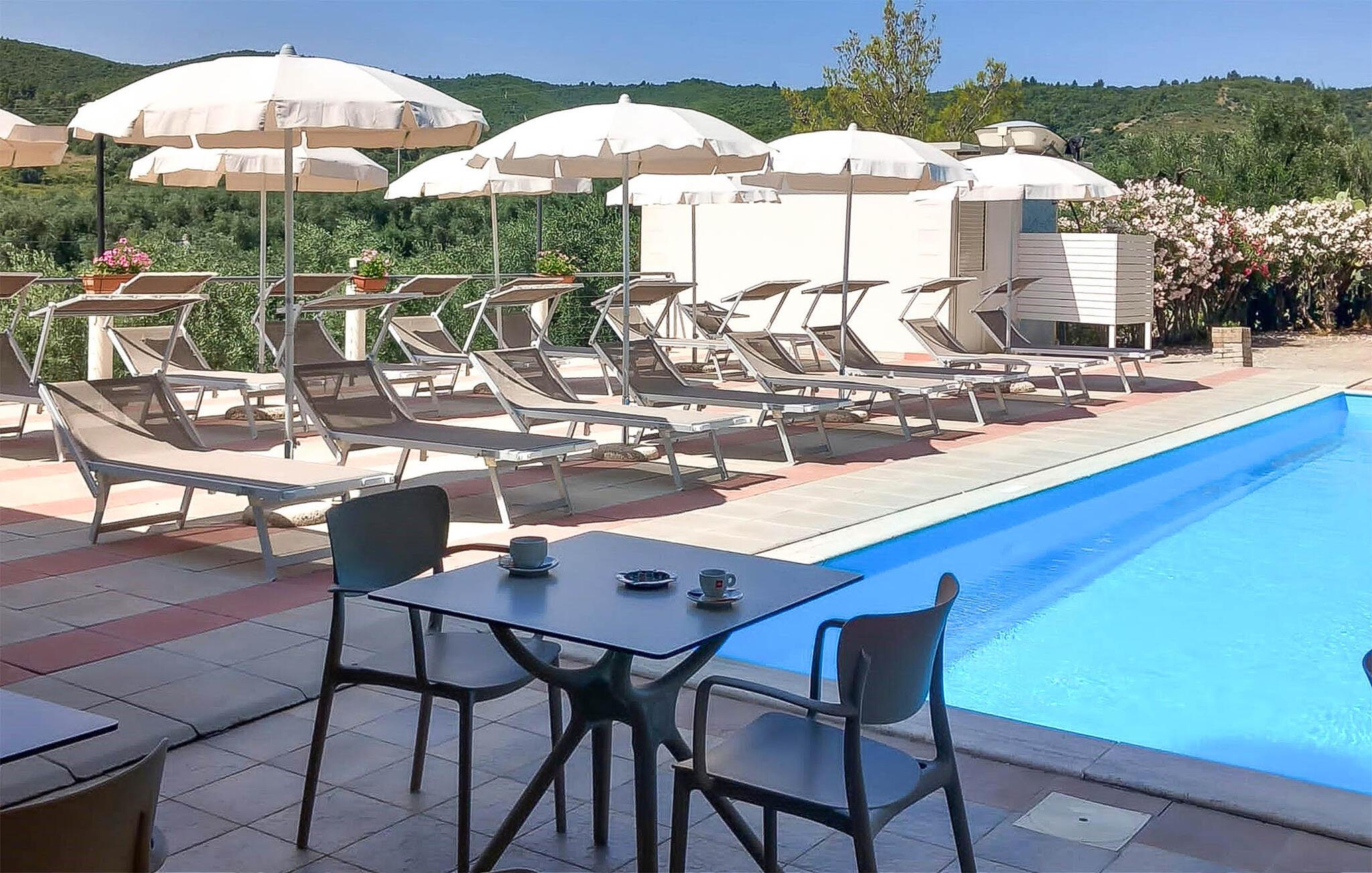 Du kan njuta av dina måltider utomhus på terrassen eller balkongen, medan den gemensamma trädgården med sin stora pool, barnpool och lekplats erbjuder kul för hela familjen. Det finns också en liten fitnesspark utomhus för ditt dagliga sportprogram. Utsikten över den omgivande landsbygden är fantastisk och inbjuder till dagdrömmar.