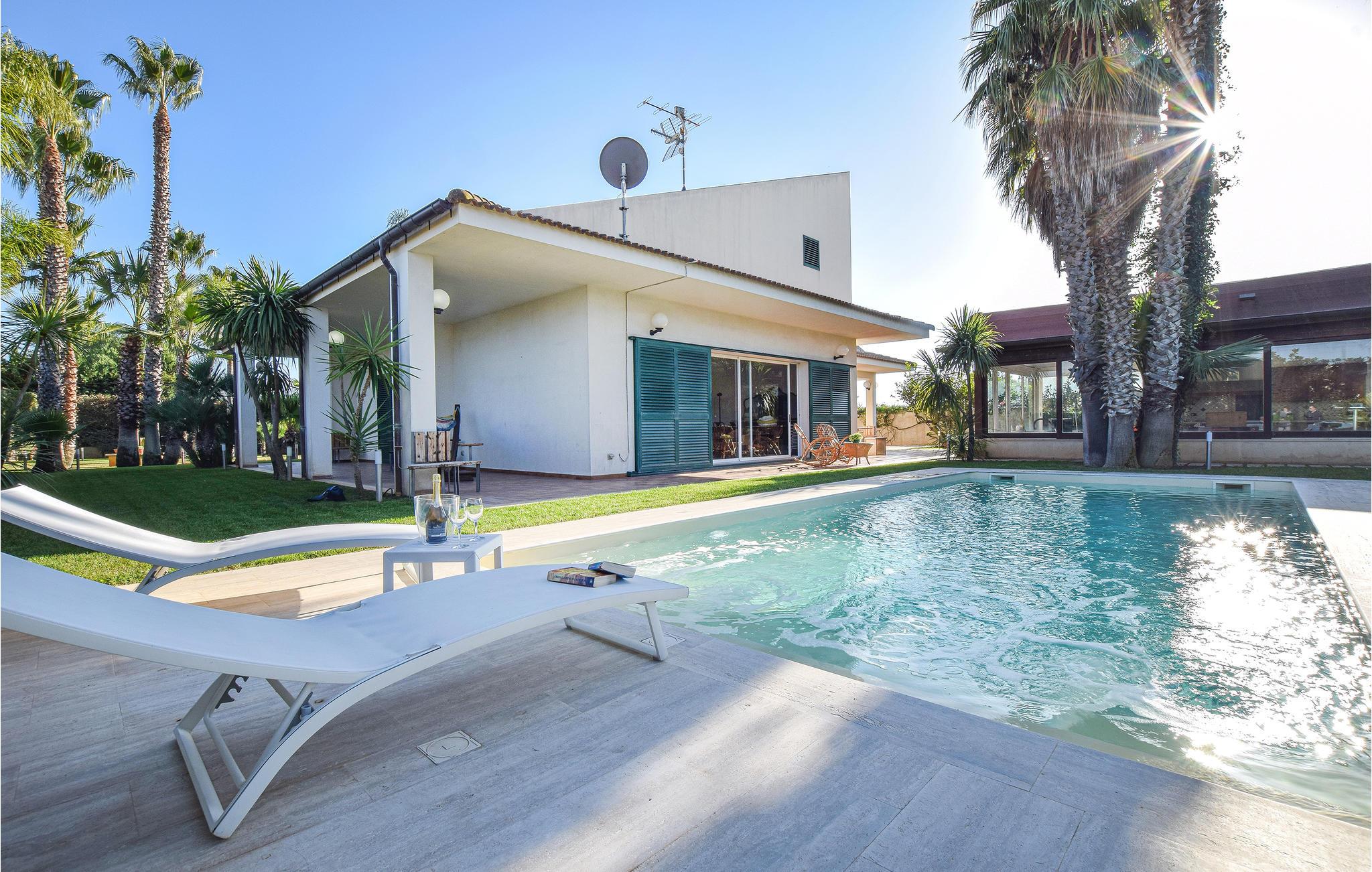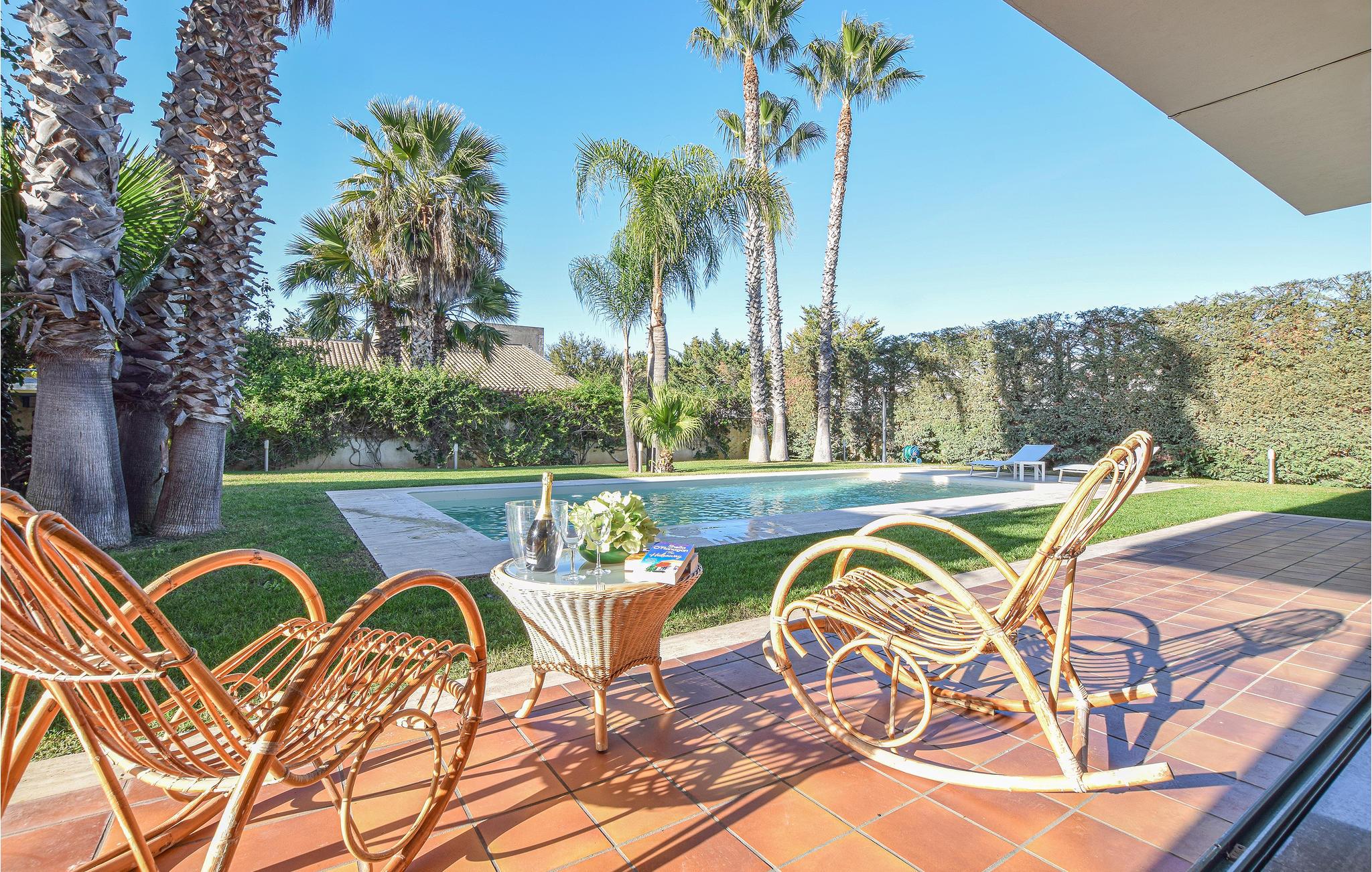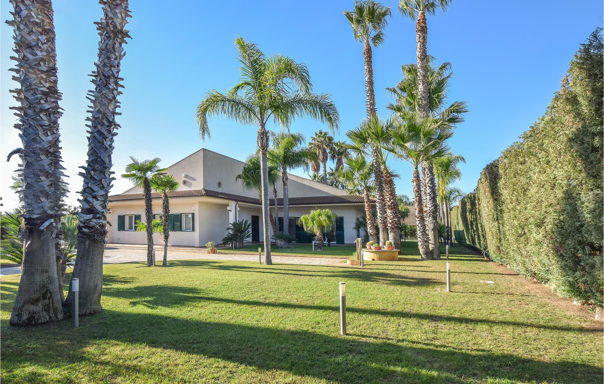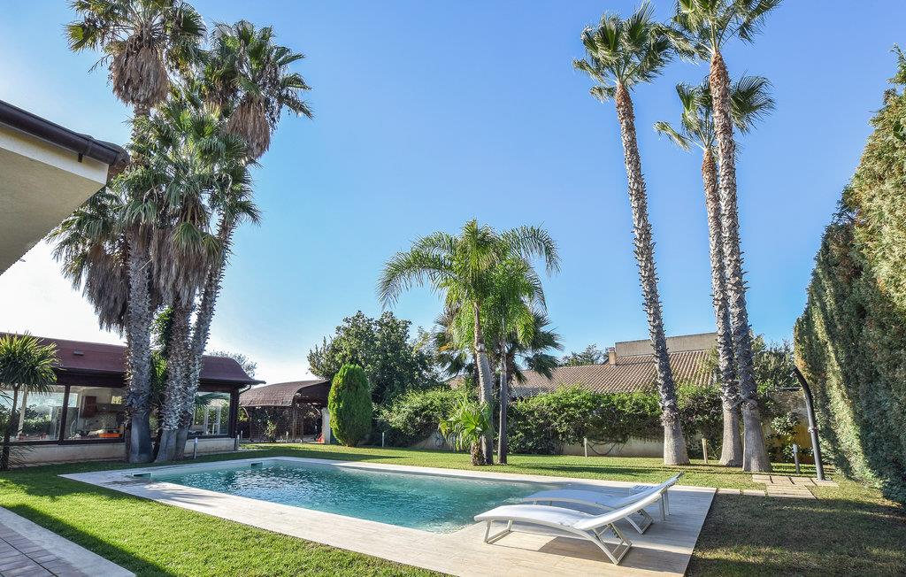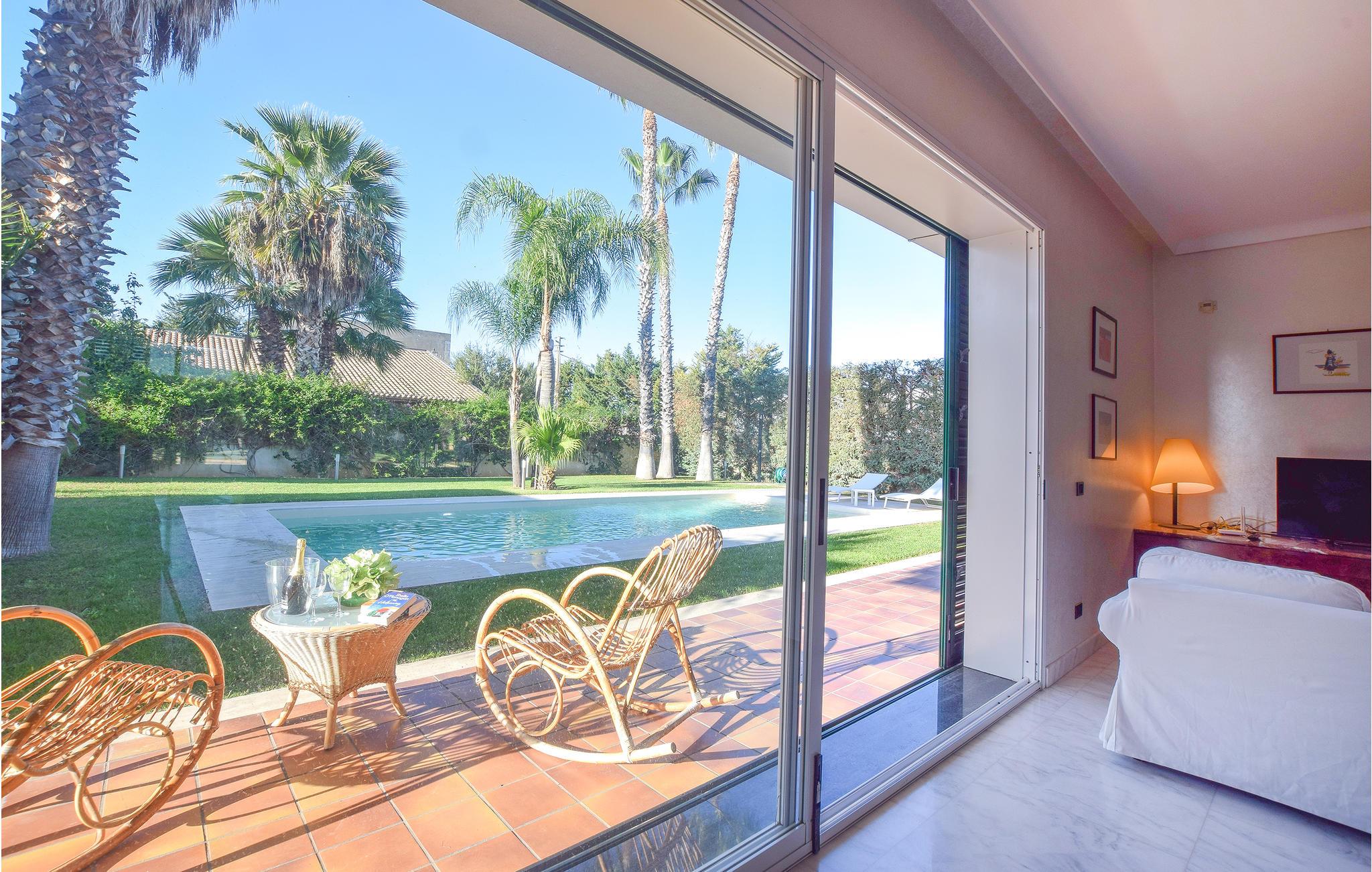 Detta semesterhus med privat pool är omgivet av en stor naturtomt med välskötta gröna gräsmattor, palmer, vackra blommande växter, apelsin- och mandarinträd. Huset ligger 1,5 km från Comiso, nära många enastående sevärdheter och naturlandskap. Rymligt och ljust vardagsrum (ca 120 m2) med marmorgolv, stora fönster med utsikt över trädgården med pool. Litet uthus med kök, grill för professionell grillning och stort matbord. På verandan en utrustad träningslokal. Litet poolhus med toalett och dusch. Perfekt läge för att utforska området: De vackra Unesco-barockstäderna Ragusa superiore (20 km), Ragusa Ibla, Modica, Scicli och Noto är lättillgängliga. 15 km till de vackra sandstränderna på sydöstra Sicilien. 22 km fiskebyn Scoglitti med liten småbåtshamn och badstränder.