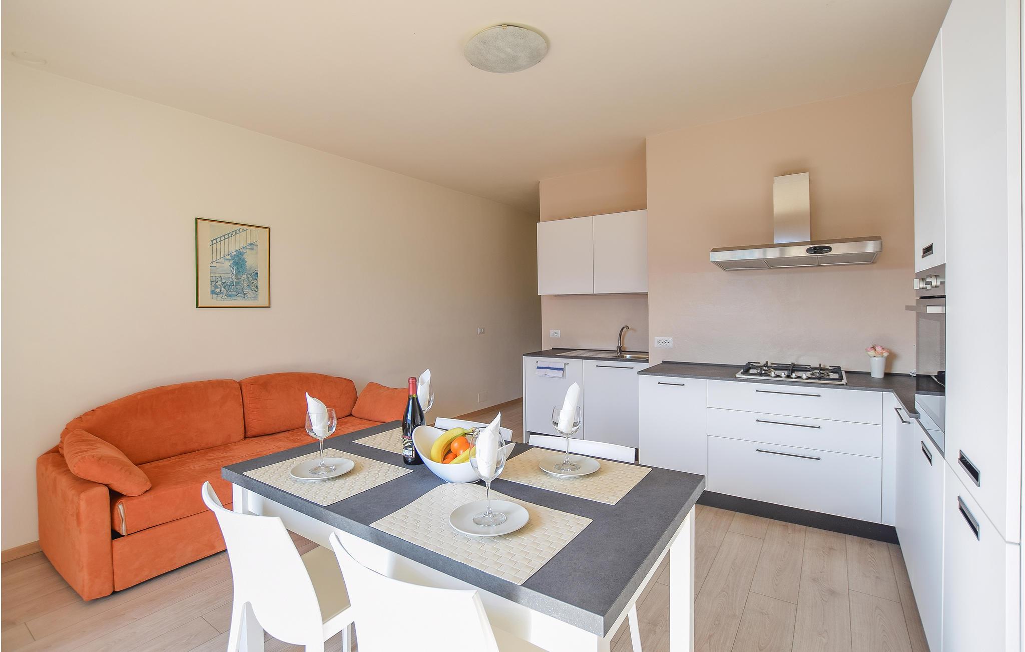Denna härliga semesterlägenhet välkomnar upp till sex gäster med sitt sovrum, badrum och vardagsrum med kök. Den är ljus och vänlig. Från den stora balkongen kan du njuta av den vackra utsikten över det omgivande landskapet medan du äter frukost på morgonen eller avslutar dagen med ett glas vin. En gemensam pool står till ditt förfogande, den ligger 800 meter bort. Här kan du njuta av det underbara italienska vädret hela dagen.