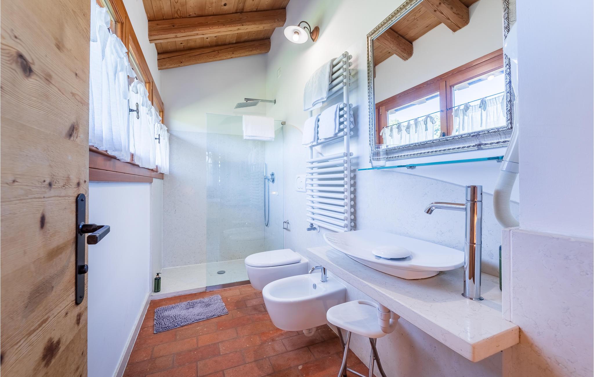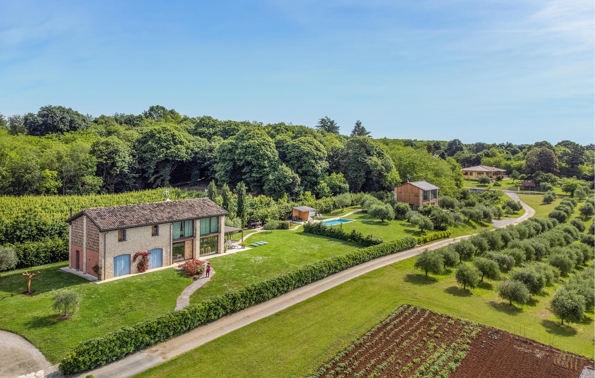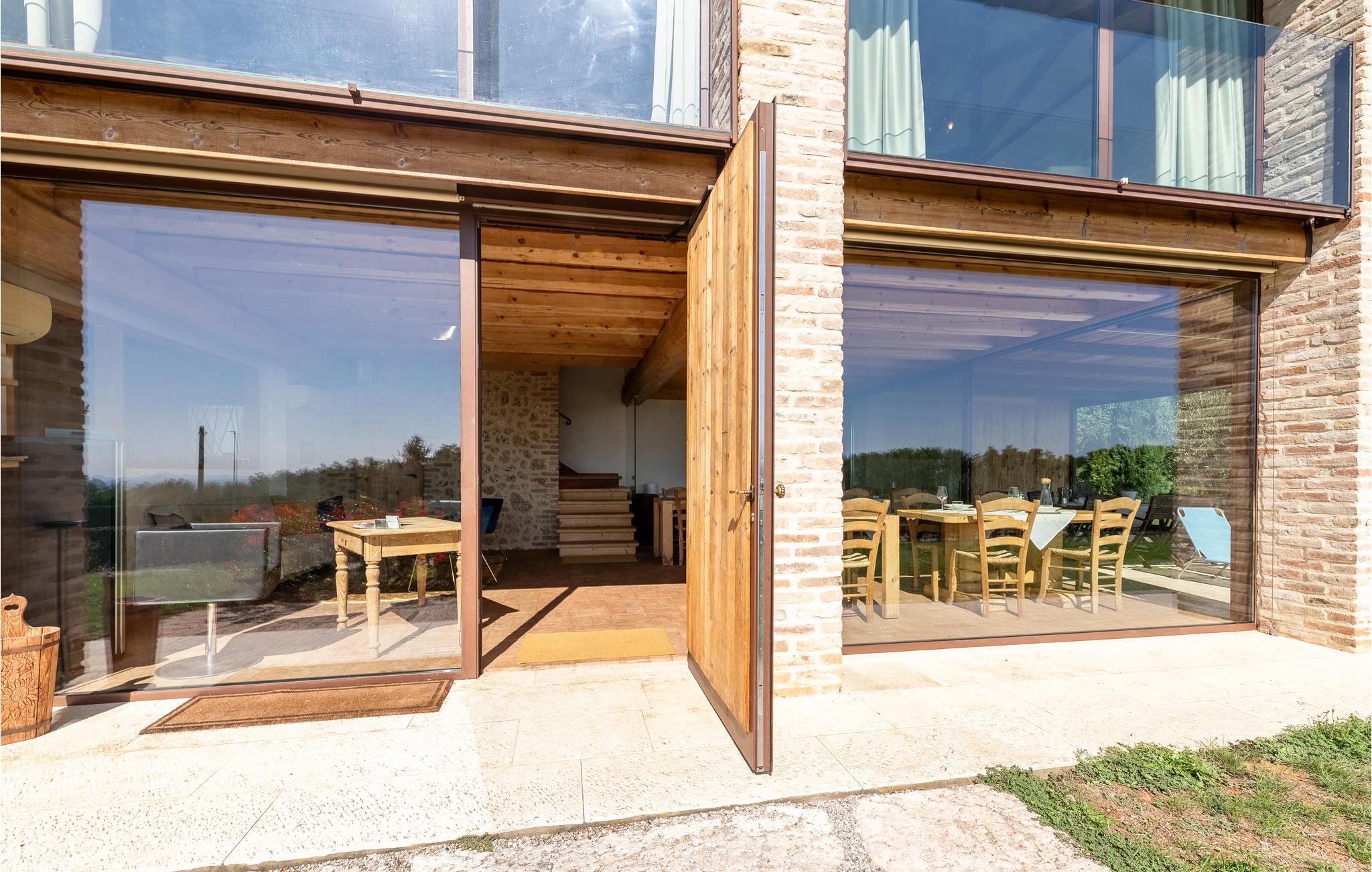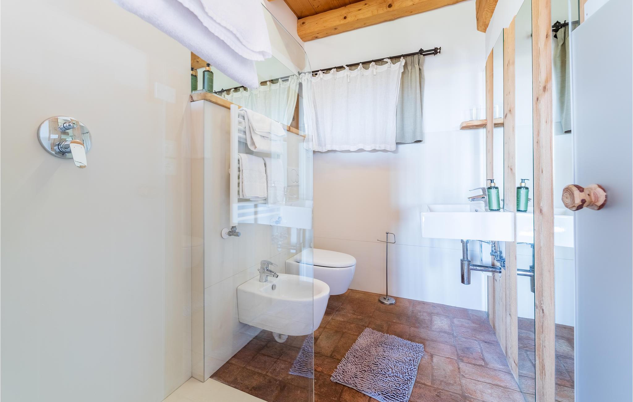 Tillbringa en oförglömlig semester i detta exklusiva semesterhus i de pittoreska kullarna i Montello, inte långt från Montebelluna. Omgiven av olivlundar, vingårdar och gröna skogar kan du njuta av absolut avskildhet och en hisnande utsikt. Villan är fördelad på två våningar och erbjuder modern komfort i kombination med naturliga material som trä och sten. Det ljusa vardagsrummet på bottenvåningen med stora panoramafönster inbjuder till att dröja sig kvar.