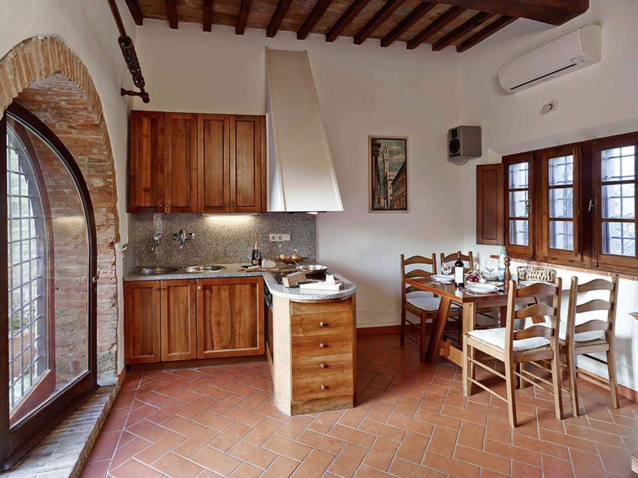 La Torre (the tower) has its entrance in the inner courtyard, which you can also use as a spacious terrace. The flat is 43 square metres in size and can accommodate up to four people. It has three levels. The kitchen with dining area is on the ground floor. A short staircase leads to the small living room next door with a double sofa bed. Half a floor higher is the bedroom with a double bed (orthopaedic) and the bathroom. On the garden side, you have a view of a wonderful Tuscan panorama. The furnishings are authentic Tuscan. The kitchen furniture is made of solid walnut wood with worktops made of real granite. The equipment includes a dishwasher, a cooker with 4 ceramic hobs and an oven, a fridge, a coffee machine and a toaster as well as a hairdryer. There is air conditioning and heating and a constant central hot water supply as well as satellite TV with numerous German programmes and a stereo system with CD player. A washing machine is centrally available.