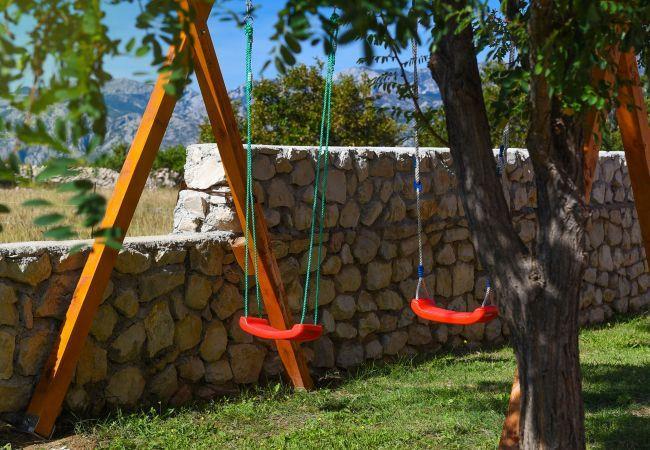 Alongside the pool surrounded by sun loungers, the fully fenced yard of the villa Nea also features a barbecue area and dining area. There is also a children playground with a swing.