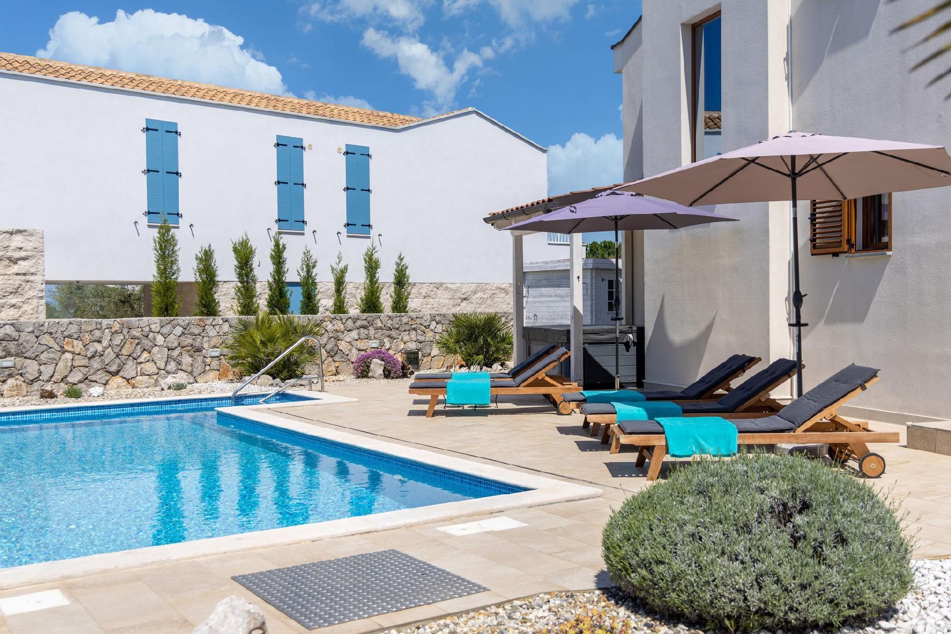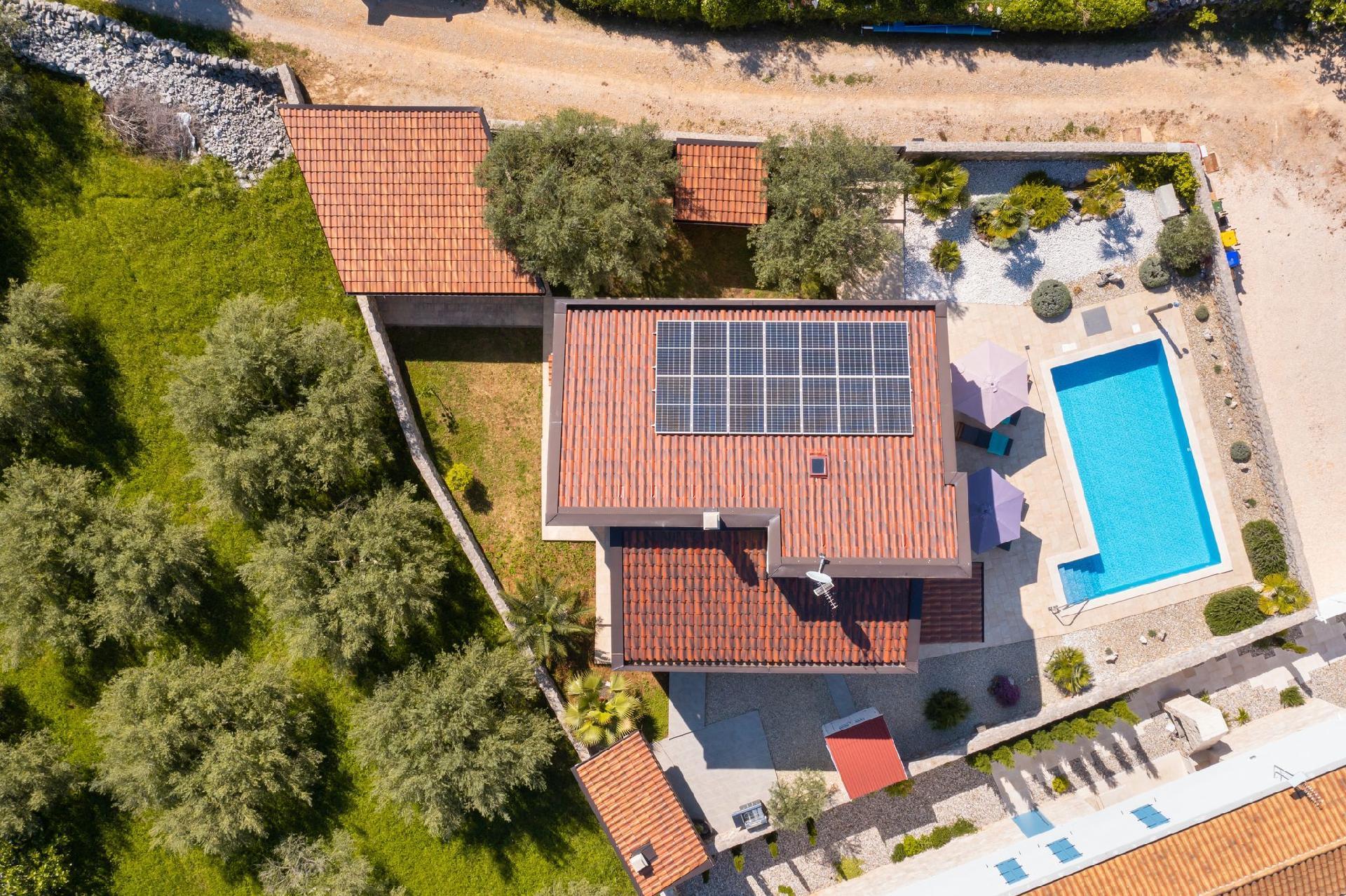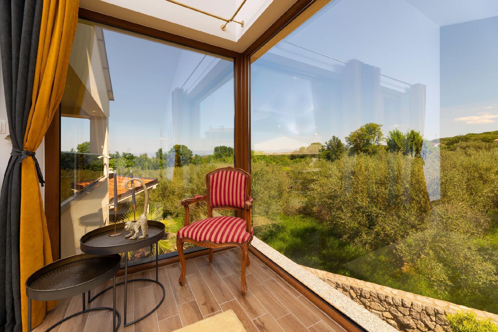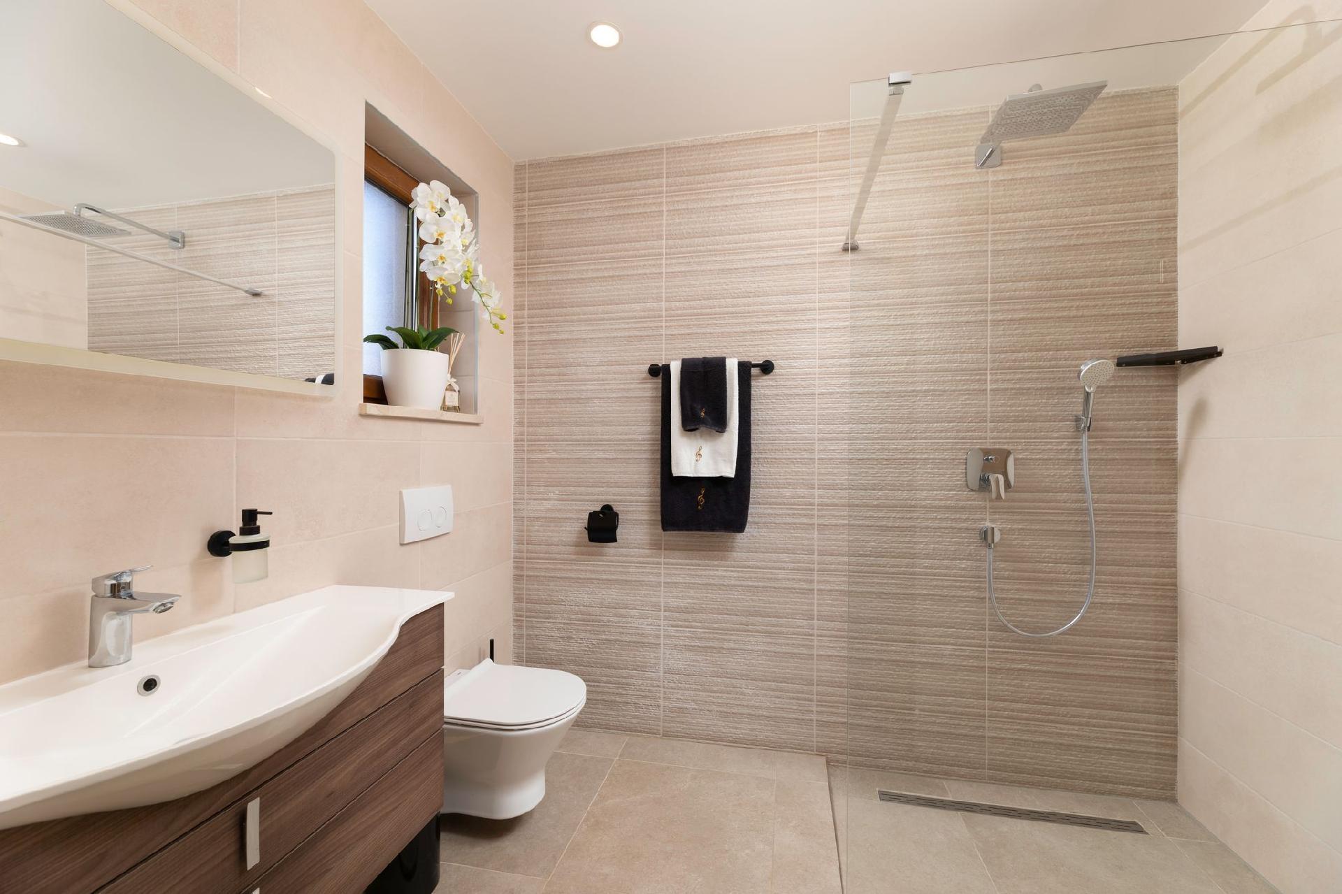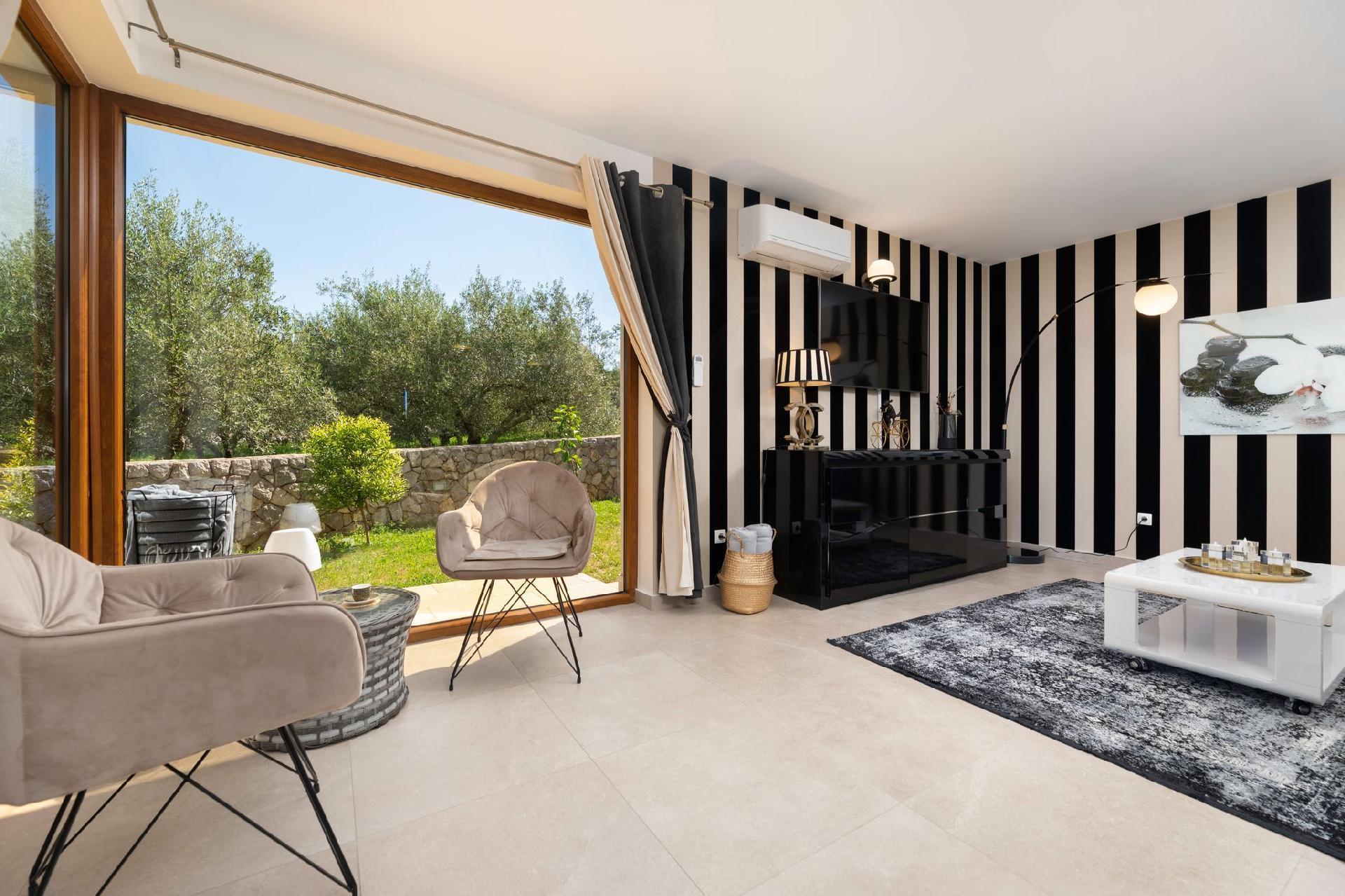 Vila Andante is the perfect getaway for families/groups of friends who look for a peaceful and quiet place for vacation. It is suitable for up to 6 guests and is spread over two floors-ground floor and first floor. On the ground floor there is the spacious living room area and an excellently equipped kitchen with a dining area. On the ground floor there is also a shower bathroom with toilet. From the living room area guests can exit to the covered terrace where they can sit, eat and relax. On the upper floor there are three double bedrooms, one of which with an en-suite shower bathroom with toilet, and one more separate bathroom. Two of the bedrooms share a spacious balcony with a lounge sofa and the third bedroom has its own smaller balcony. Guests can also enjoy the pool, sunbeds, outdoor shower, and two grills (wood and gas). Covered parking for two vehicles is provided.