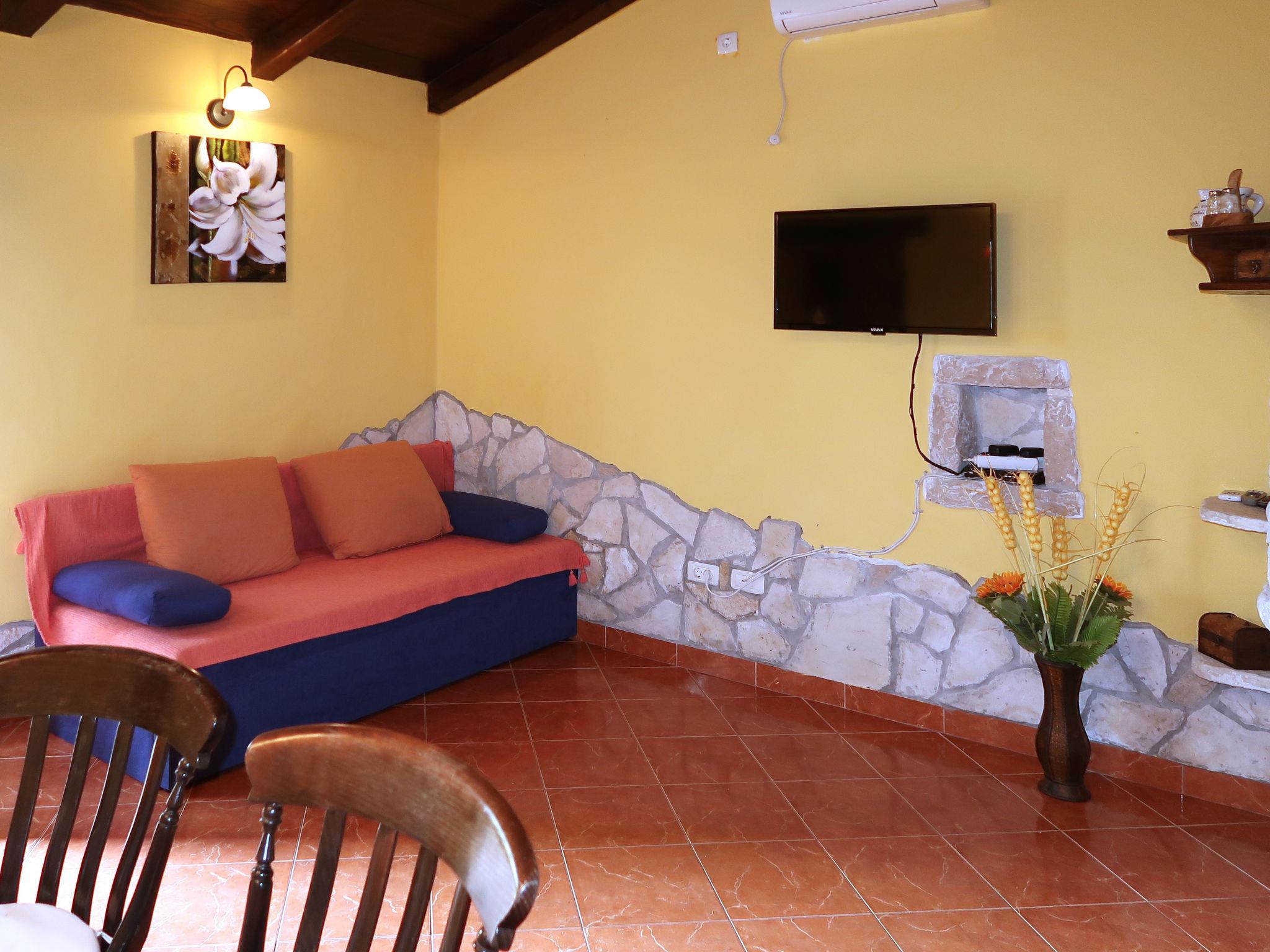 2-room house 50 m2. Living/dining room with 1 double sofabed and open-hearth fireplace (only for decoration), satellite TV and air conditioning. 1 room with 1 french bed (150 cm, length 200 cm). Open kitchen (2 hot plates, 2 gas rings, toaster, kettle, microwave, electric coffee machine). Shower/WC. Terrace 15 m2, roofed. Terrace furniture, deck chairs. Facilities: Internet (WiFi, free). Please note: non-smoking house. Maximum 2 small pets/ dogs allowed.