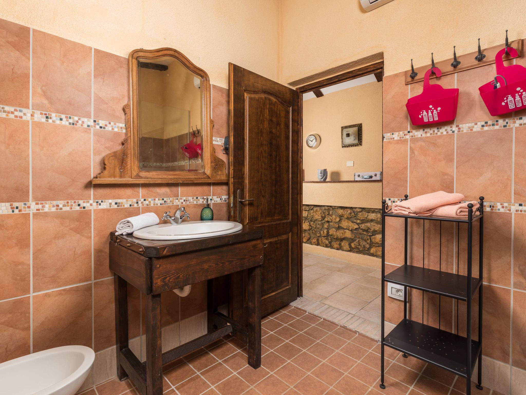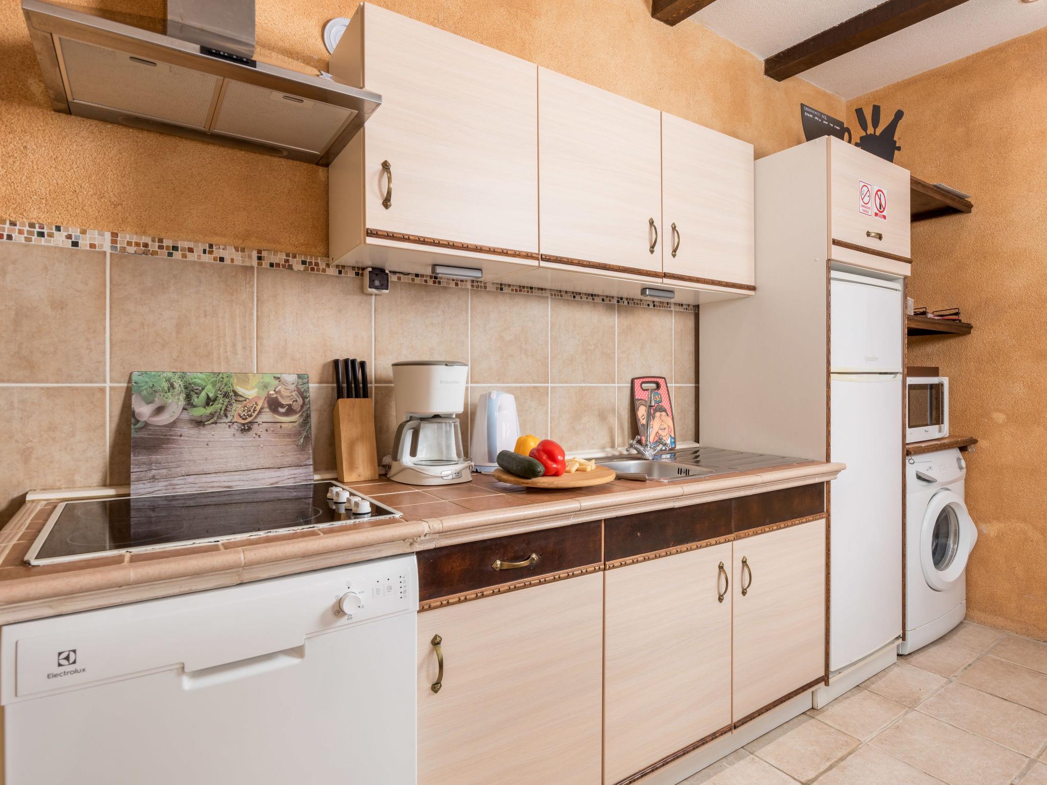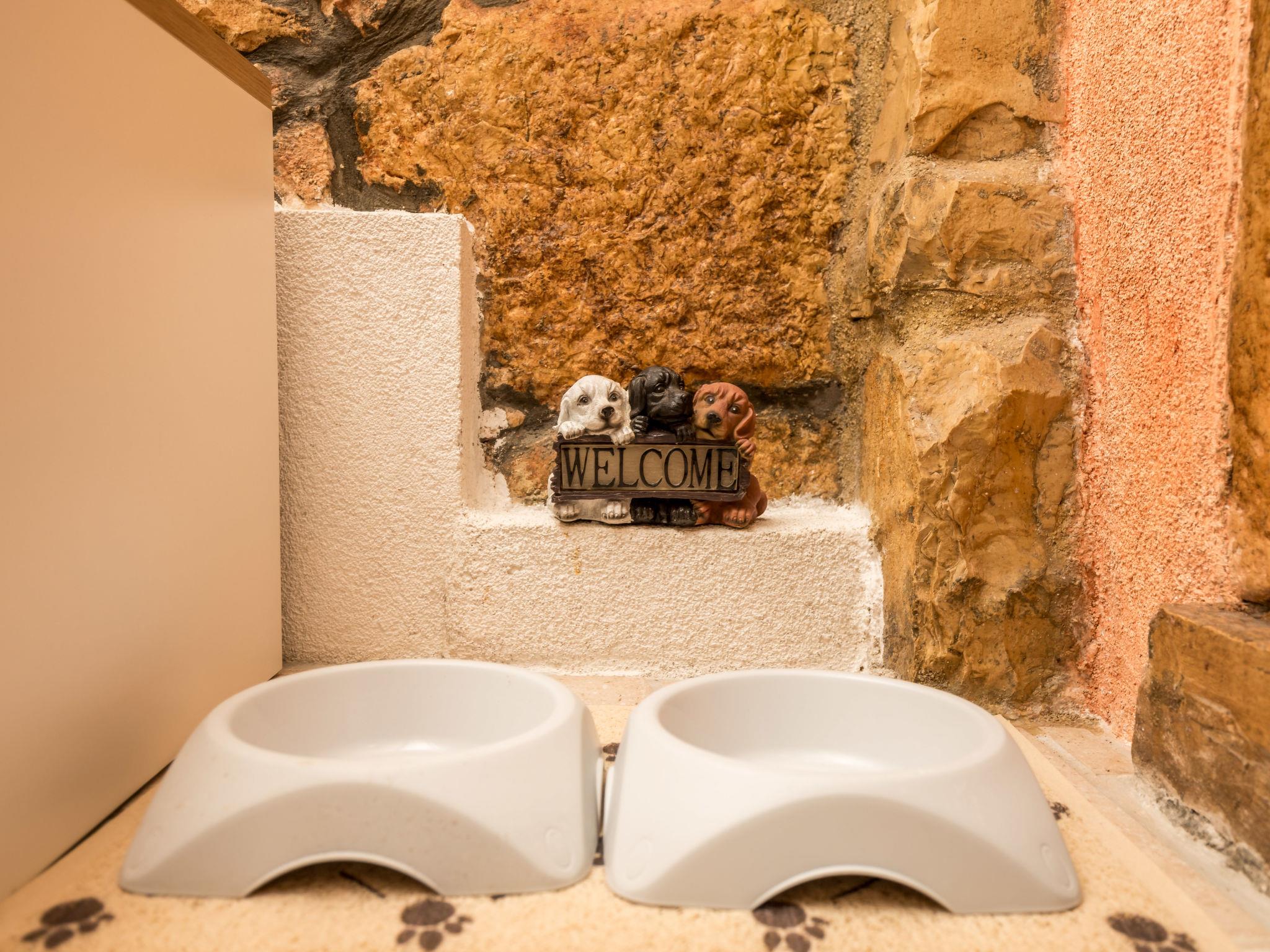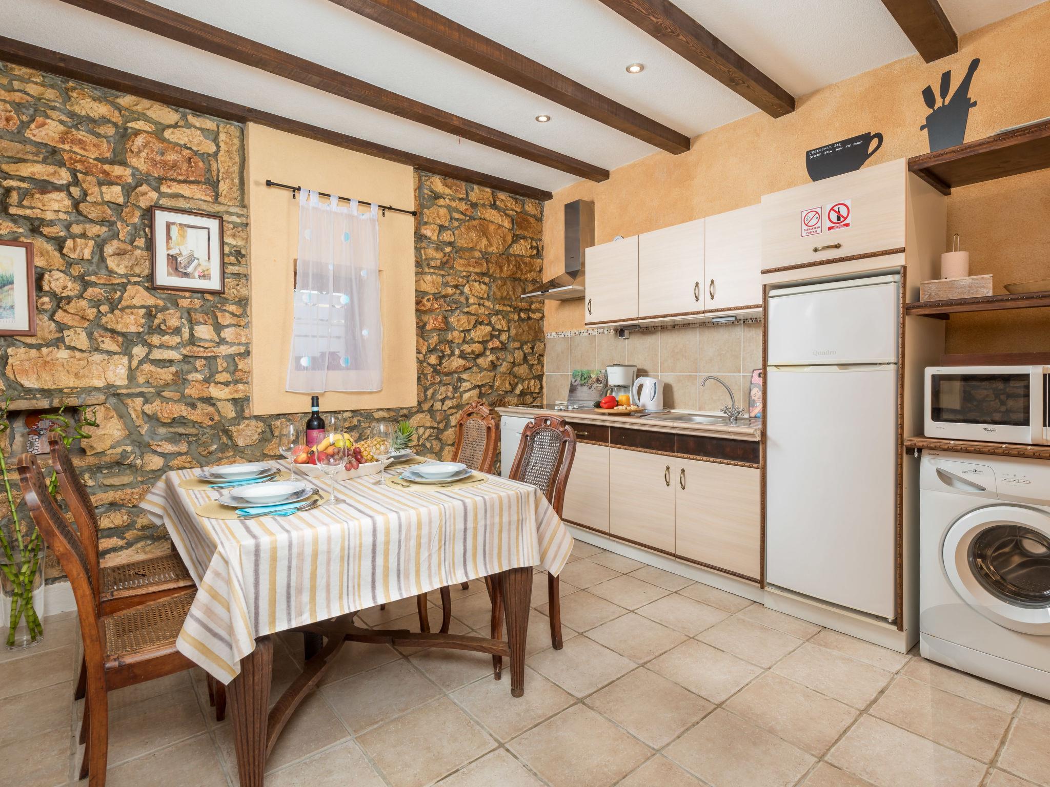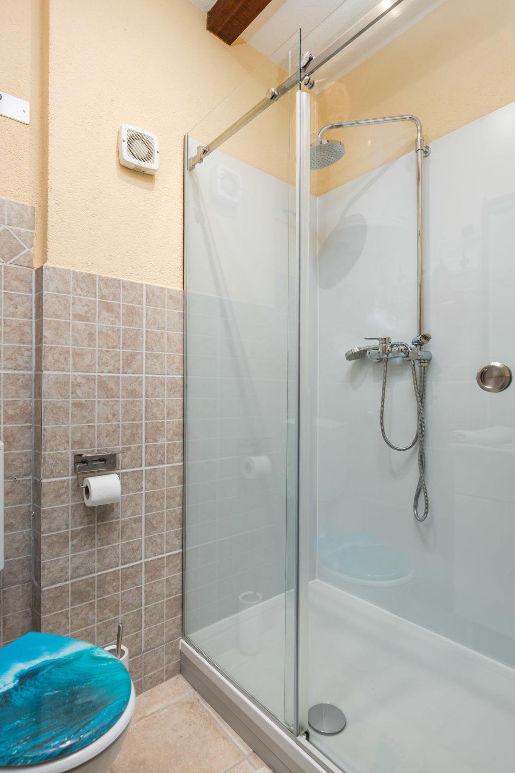 3-room house 100 m2 on 2 levels. Living room with satellite TV and air conditioning. Kitchen (dishwasher, 4 ceramic glass hob hotplates, toaster, kettle, microwave, freezer, electric coffee machine) with dining table. Shower/WC. Upper floor: 1 room with 2 beds (90 cm, length 200 cm). Exit to the balcony. 1 room with 1 french bed (160 cm, length 200 cm), 1 folding bed (90 cm, length 200 cm), TV and air conditioning. Shower/WC. Electric heating, air-conditioning. Deck chairs. Facilities: iron, hair dryer. Internet (WiFi, free). Please note: non-smoking house. Maximum 2 pets/ dogs allowed. Fire extinguisher.