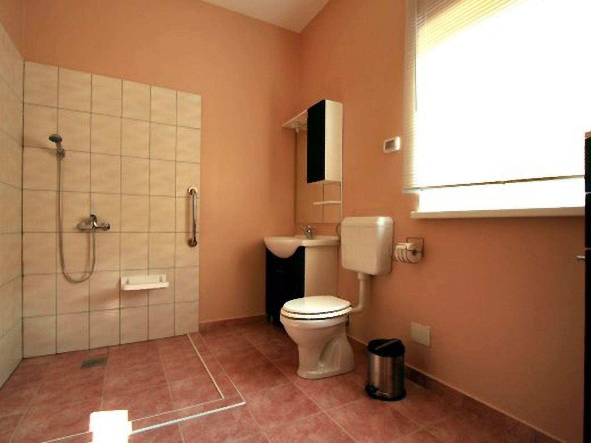 The ground floor houses a large kitchen, a living room and four bedrooms, one of which is suitable for the disabled (wheelchair accessible). There is also a fully electric hospital bed and a disabled bathroom. On the first floor there are a further six bedrooms with double beds. One bedroom also has a single room with a bed. The six bedrooms are equipped with bathrooms (shower/WC), one of which has a corner bath, and offer pure luxury. In the bedrooms there are double beds measuring 180 x 200 cm, in one bedroom there is a French bed measuring 140 x 200 cm and in the handicapped accessible bedroom there are two single beds measuring 90 x 200 cm each, which can be pushed together. The entrance to the house is barrier-free.