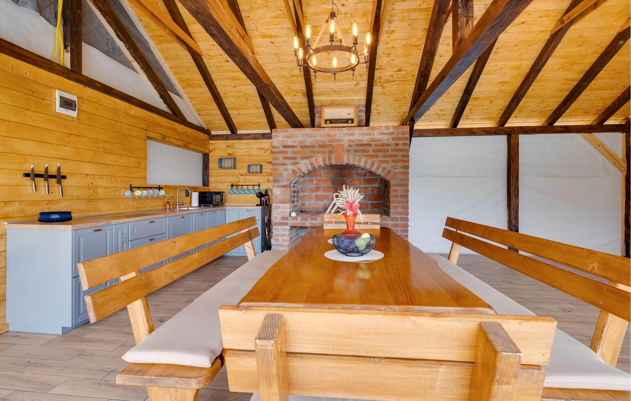 Bredvid poolen finns ett utrymme med ett sommarkök och matsal där du kan förbereda och äta grillmåltider.