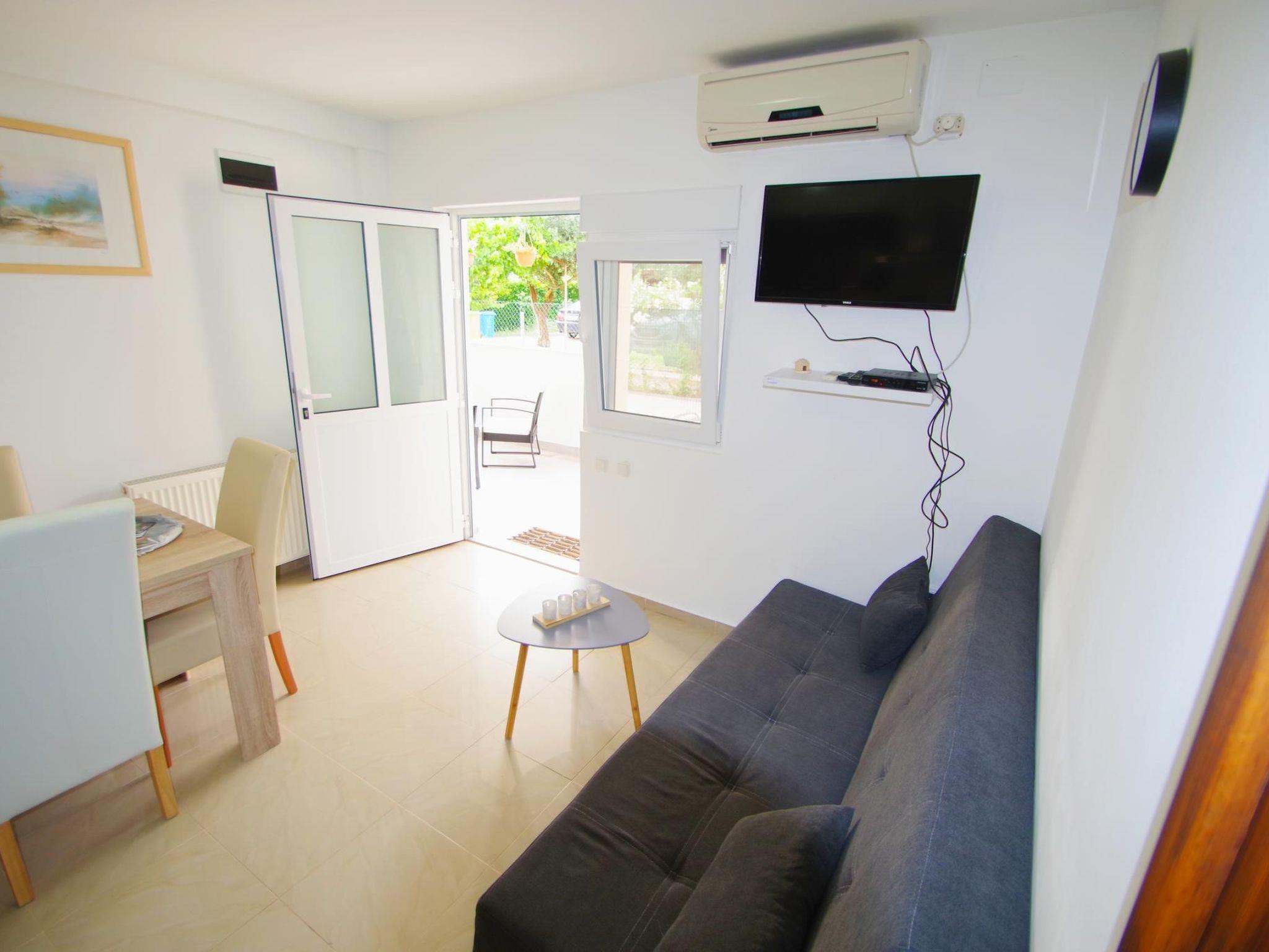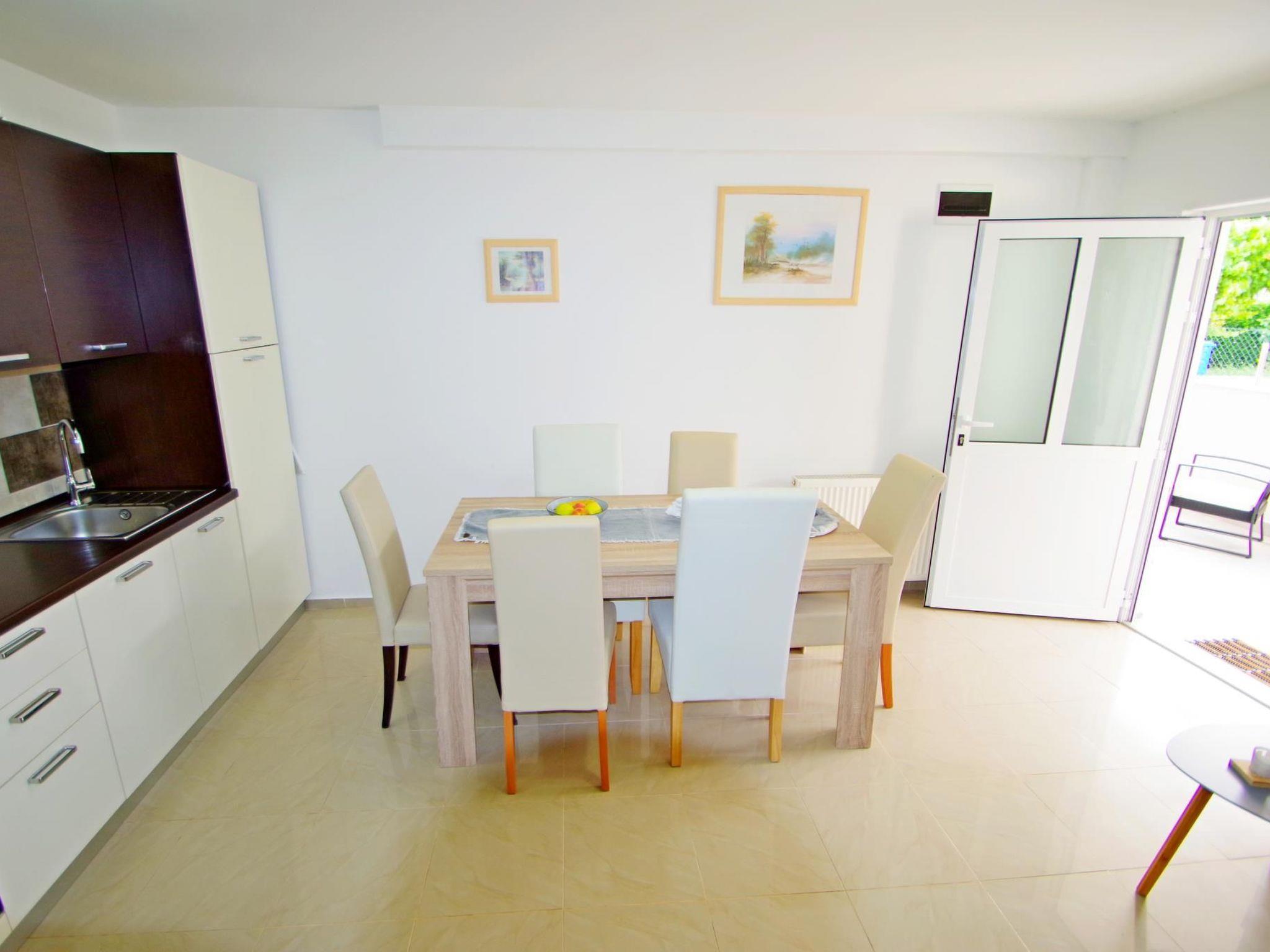 The interior of the apartment is thoughtfully designed for relaxation and convenience, accommodating 4+2 guests across two bedrooms and a living space. The apartment features a cozy living room that doubles as a sleeping area with a couch for two, alongside a dining table and an open kitchen. Each bedroom is furnished with a comfortable double bed, ensuring a restful night's sleep. The inclusion of a well-appointed bathroom with a shower, WC, washbasin, and washing machine adds to the comforts of home. Additionally, the kitchen is equipped with essential appliances and utensils, including a stove, refrigerator with a freezing compartment, oven, and coffee machine, perfect for crafting delicious meals.
