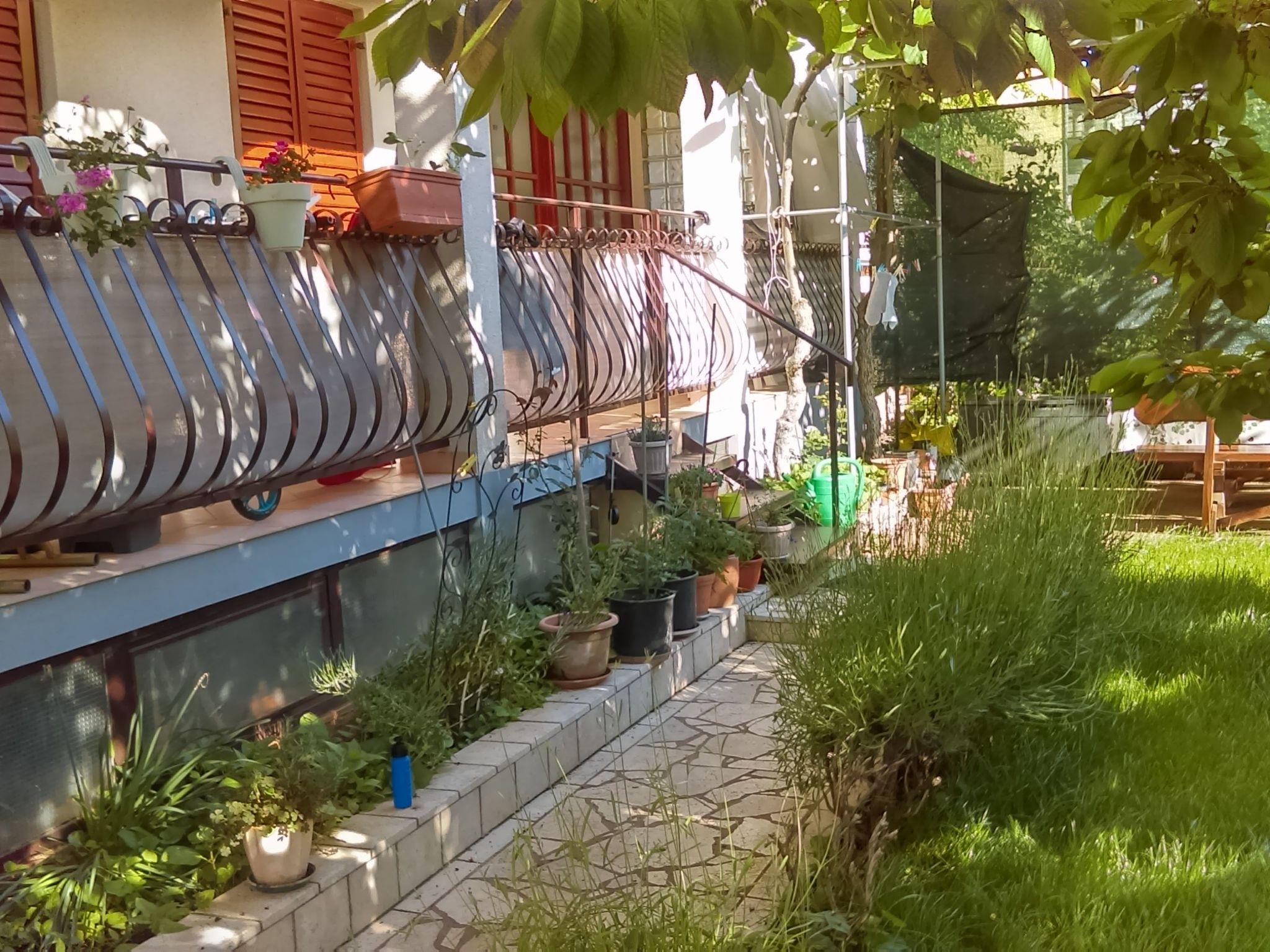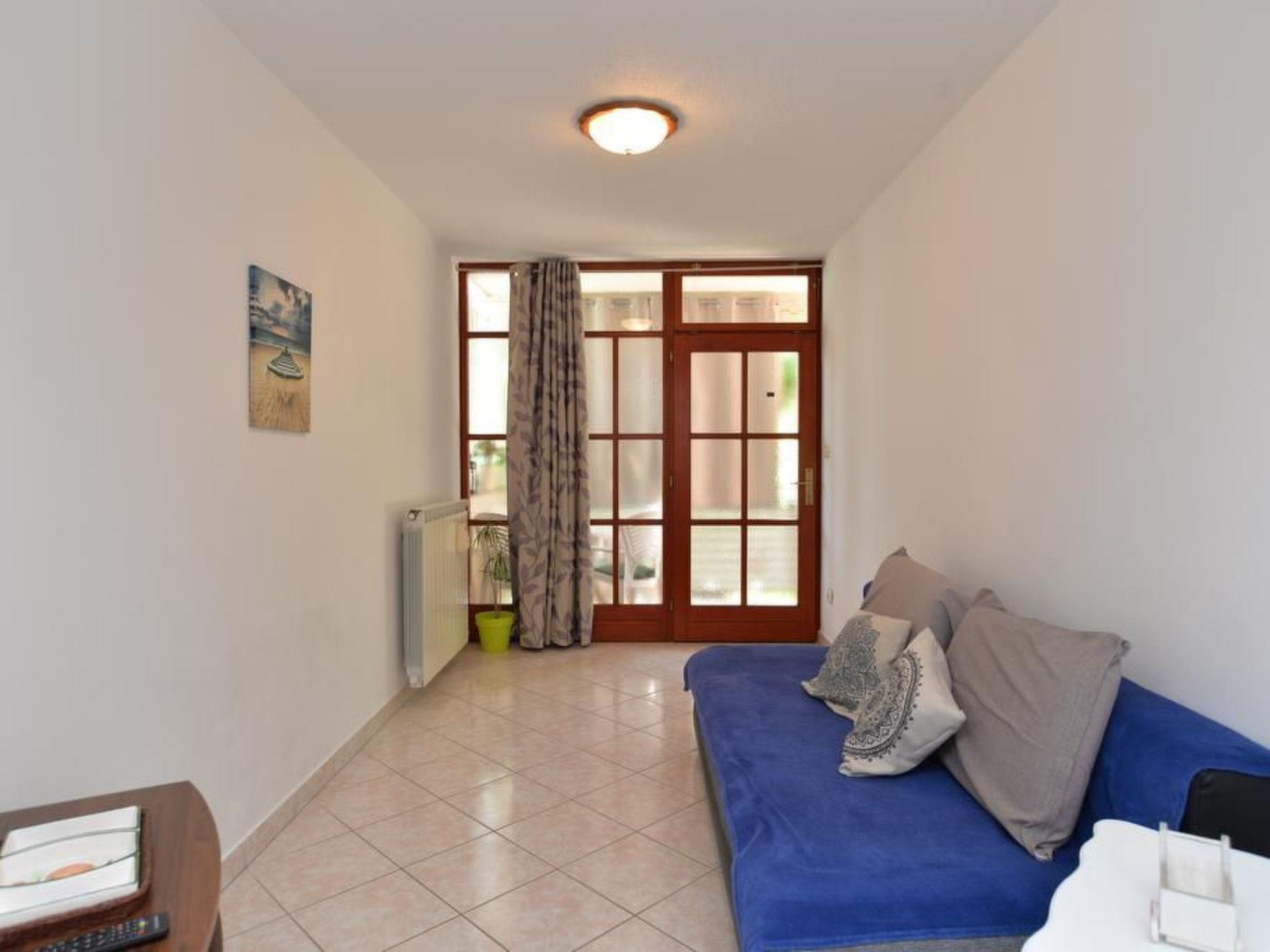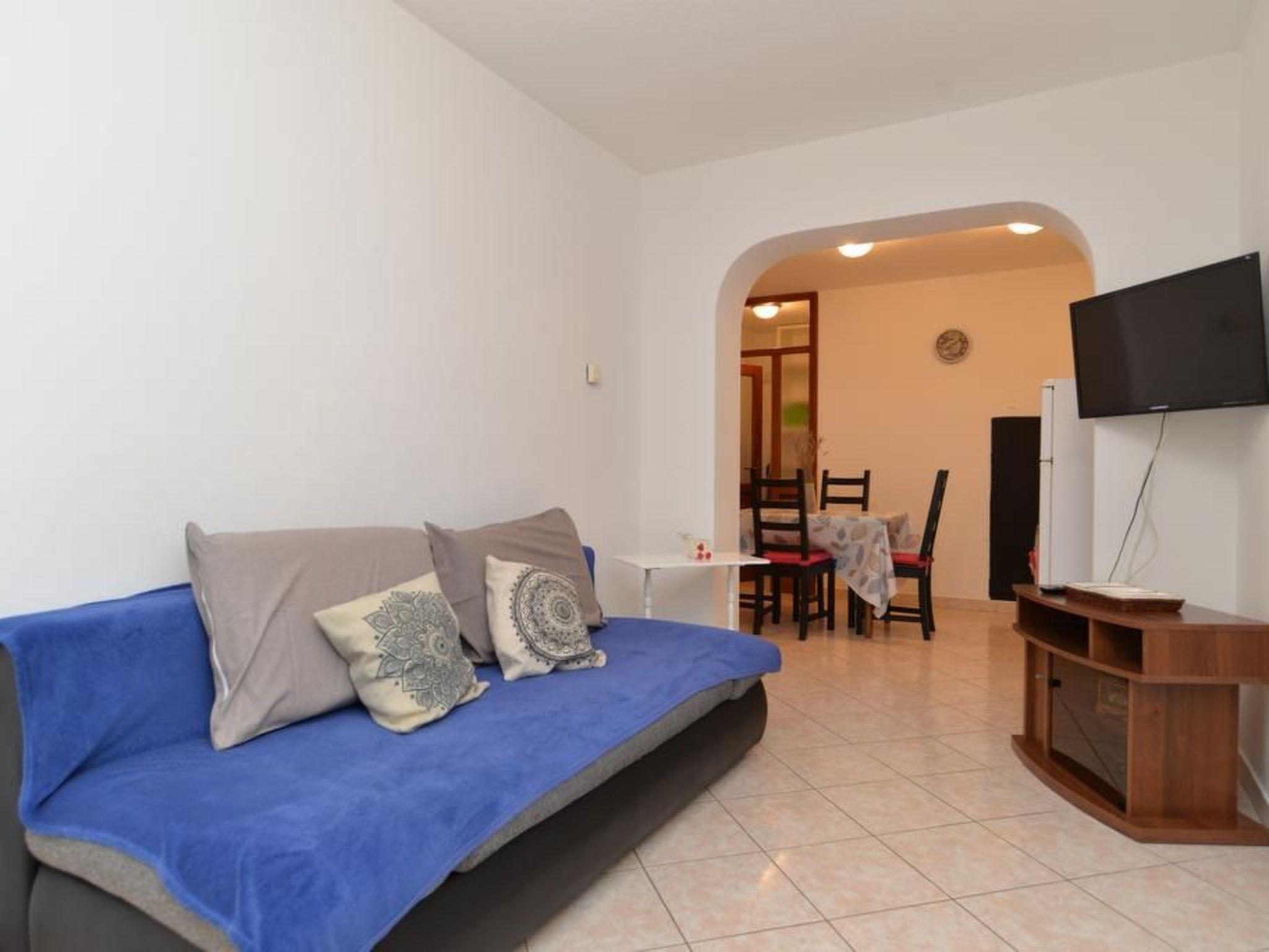 This holiday apartment is located on the ground floor of a residential building. It has two bedrooms with a double bed and two single beds. The kitchen is fully equipped, and there is a living room with a sofa and a TV. There is also a bathroom with a shower.